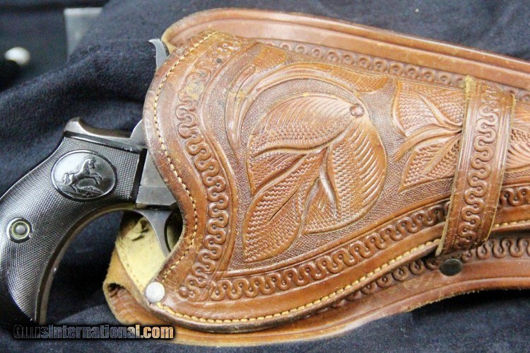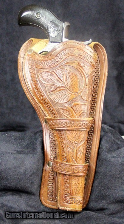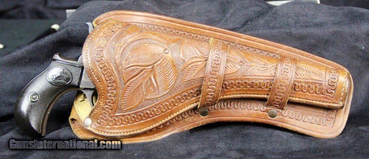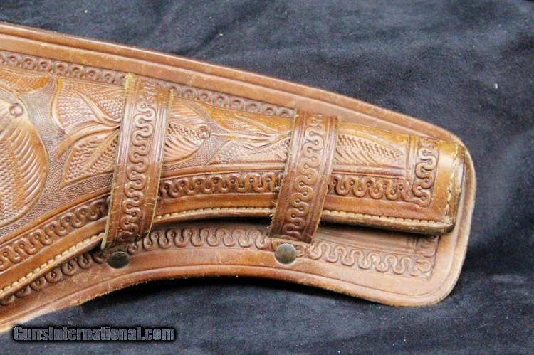 Description: fits 6 inch Colt 1877, loops rivetted, lined, Cheyenne plug, deep carving, no maker's mark. Condition: excellent overall, lining worn at top, all seams solid. SOLD |