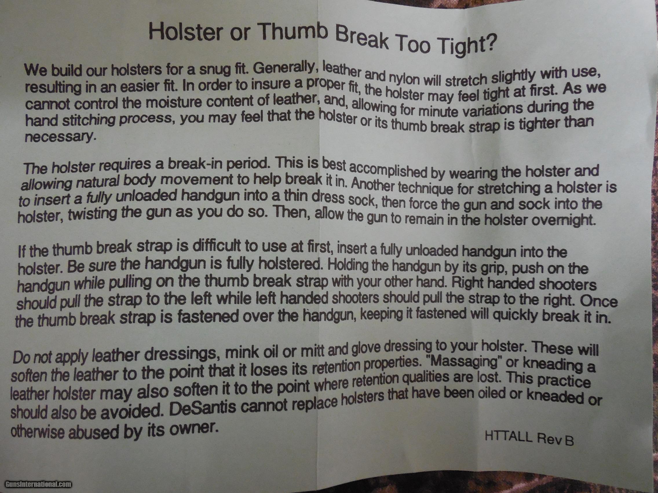 Description: FACTORY NEW IN BOX CLICK ON PICTURES TO ENLARGE Product Description Premium saddle leather, double seams and a highly detailed molded fit, make this exposed muzzle, tight fitting, two-slot holster a great choice for your favorite pistol. It features an adjustable-tension device. Belt slots are 1 .75" wide. It fits Keltec PMR30. Specifications Type:Belt Holster Color:Black Material:Leather Hand:Right Finish:Smooth Firearm Fit:Kel-Tec PMR30 Mount Type:Belt Loop Belt Size:Width 1.5"-1.75" Gun Type:Handgun Compartments:1 SHIPPING $ 6.99 SOLD |