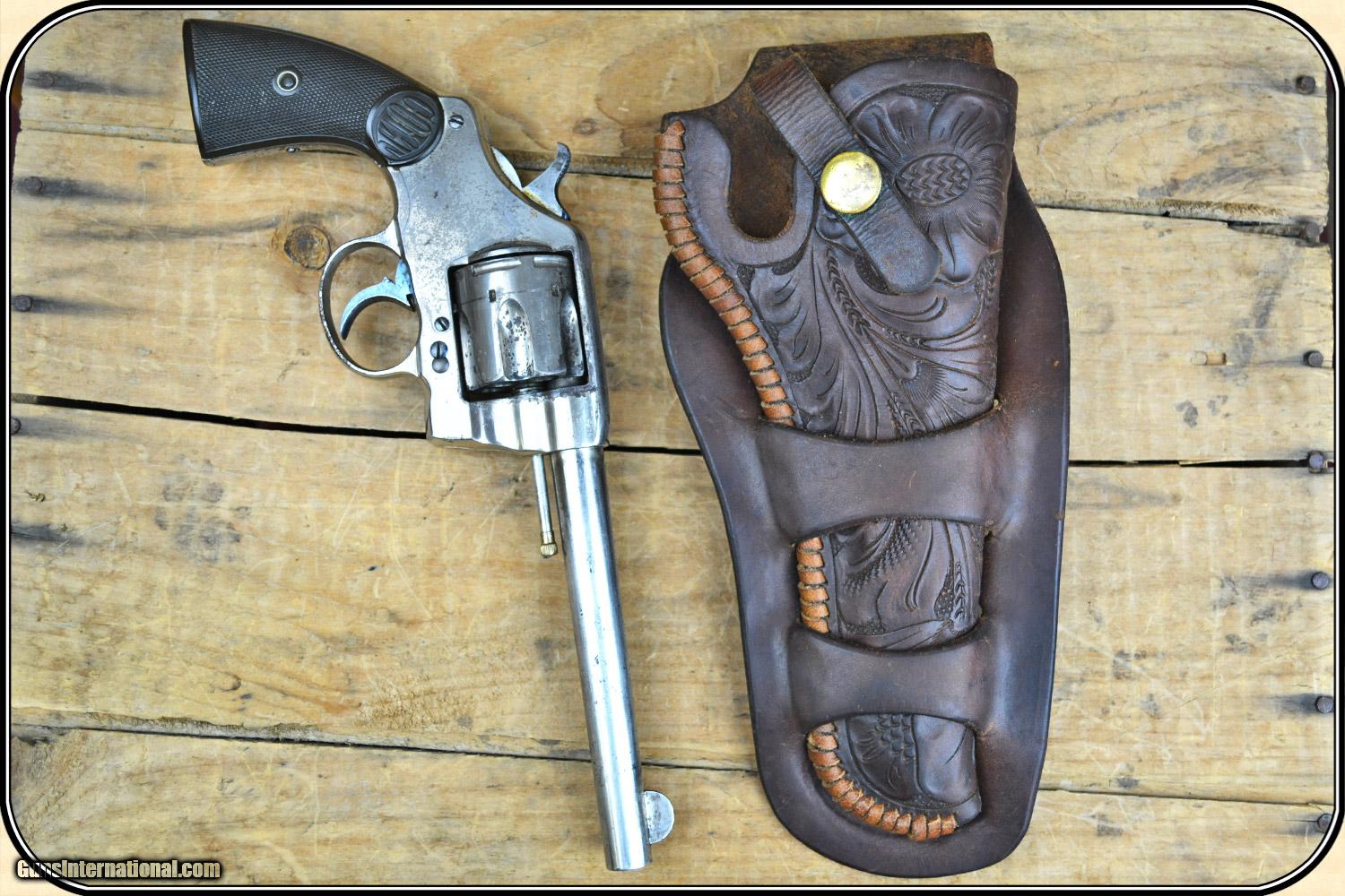Description: This holster is marked on the back VL&A Chicago model #713 Double Loop Right Side Holster in very good condition. The Hermann H. Heiser Manufacturing Co. made this beautiful Model #713 Double Loop Right Side Holster . It ls made from Premium Tooled Skirting Leather with a brass unmarked safety strap snap cover and a hand Wrapped rawhide main seam. The H. H. Heiser Company made this fantastic #713 Double Loop Side Holster For the catalog house VL&A. Here it carries a Colt 1877 Lightning or Thunderer with a 6” barrel length or a Colt New Army, for the right hand shooter, but would likely accommodate other revolvers.. This is a gorgeous model #713 Double Loop Side Holster. On the back you see the VL&A mark which would date this holster from 1910 through 1925. Payment Cash, postal money order, cashiers check, personal & business checks. Can be ordered with a credit card or paypal at wxx.riverjunction,cxx just type in the number 4386 in the search box. SOLD |