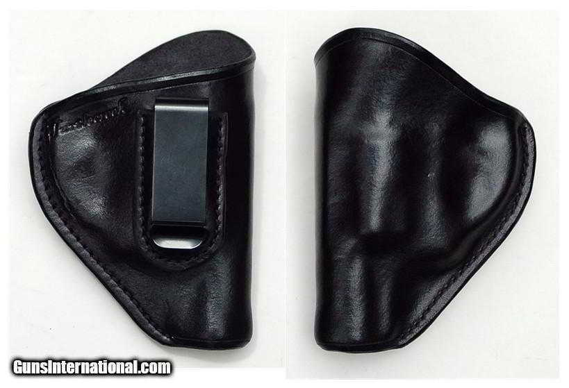 Description: Leather IWB (Inside-the-Waist-Band) (inside the pants) holster for Right Hand pattern with Fixed Clip in Black leather designed to snugly fit your Ruger (LCP LC9 SR9c P89 P91DC LCR SP101 (2.25" brl) with or without Crimson Trace). Specify the model and other features when ordering...holsters with standard features (black, fixed clip and RH pattern) are in normally in stock. Excellent quality. Extremely well made. Designed for comfort. Made to last. Best concealed carry holsters made and sold any where. Custom made in USA by Turtlecreek Products. Features: Vegetable tanned cowhide raised and tanned in the USA. Reasonable light-medium thickness to reduce bulk and enhance CC comfort inside the waist band. Very comfortable. Wet molded for a secure hold to specifically fit your selected Ruger model. Professional black dye for a rich black color. Sheen coating to prevent dye rub-off and lock out moisture. Atom wax top coat to additionally lock-out moisture and add more shine. Shaped to protect the gun from sweat while protecting you from sharp edges. Max concealment keeps the grip at the top of the waist band while facilitating easy draw. Fixed belt clip in black oxide with no sharp edges fitting belts up to 1.75" wide. Triple stitched in heavy black nylon thread. Different options (such as for Crimson Trace, LH pattern, Hinged Clip, Cant, Raised Clip, SnapDownStrap, ThumbBreak, reinforced sweatband or different dye color) are available and can be ordered from our online store (search for Turtlecreek Holsters or Turtlecreek Products) or call 513-932-9777. You'll be pleased with the comfort, the quality, the durability, and the reasonable cost of all our custom USA made Turtlecreek holsters. SOLD |