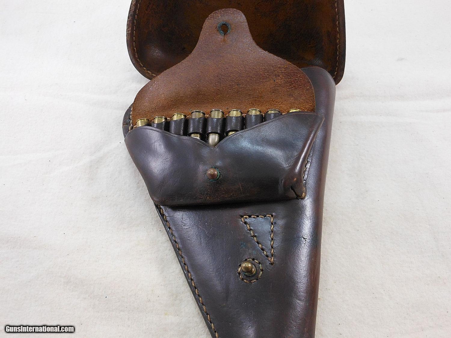Description: Quality Consignments Wanted! This holster is a correct "Papa" Nambu holster. It has the pouch for the 8 M/M Nambu cartridges in loops. The top row holds 9 shells The bottom row holds 7 Shells. It has the provision for the cleaning rod. This is a unmarked commercial holster. This holster is in very fine condition! There is no damage or repairs to this holster. The leather is very fine and not dried out. The holster does show some light use. This is a rare holster to find in this condition! The original ammunition is to be sold separately. Search for hlvfineguns on google. F. No. 232 SOLD |