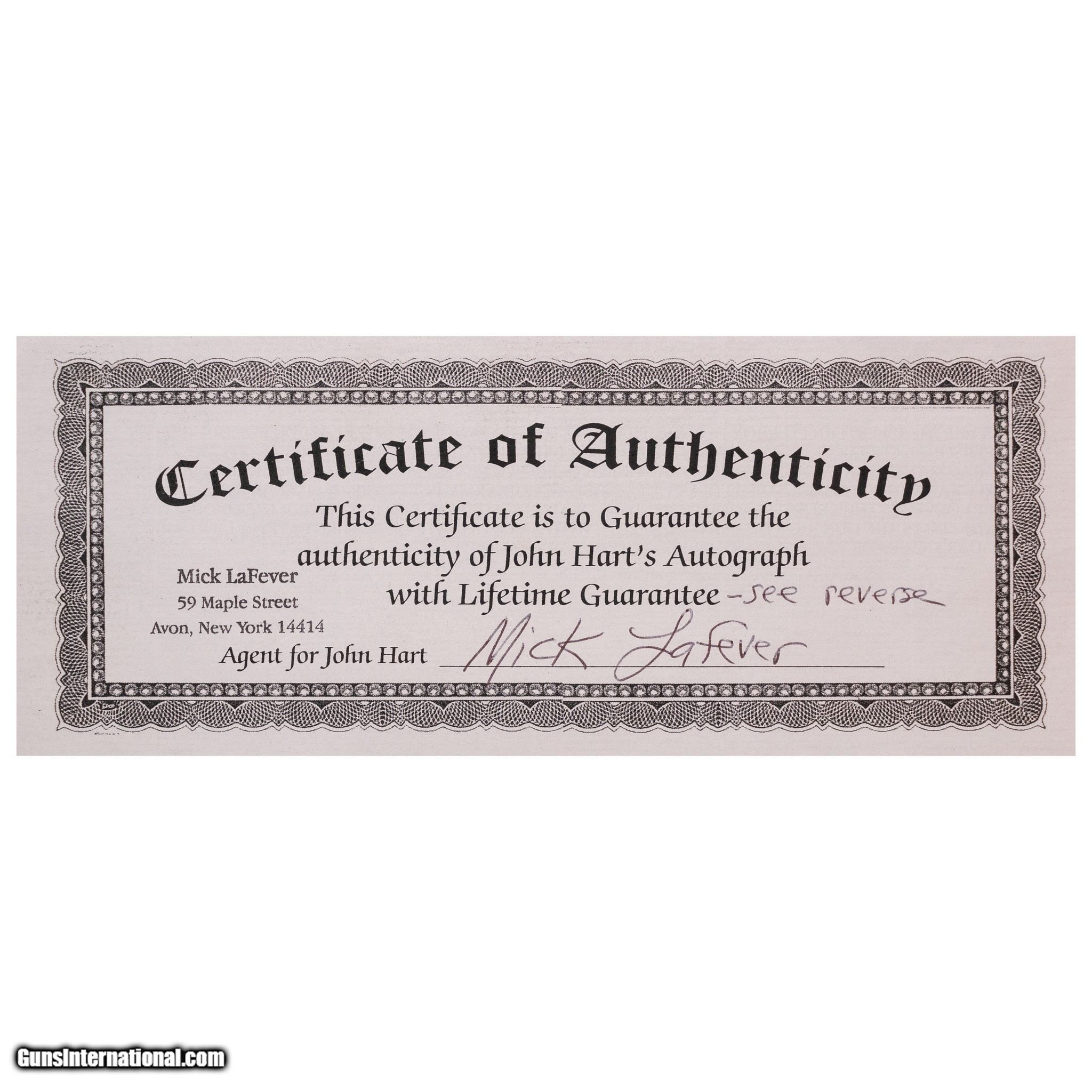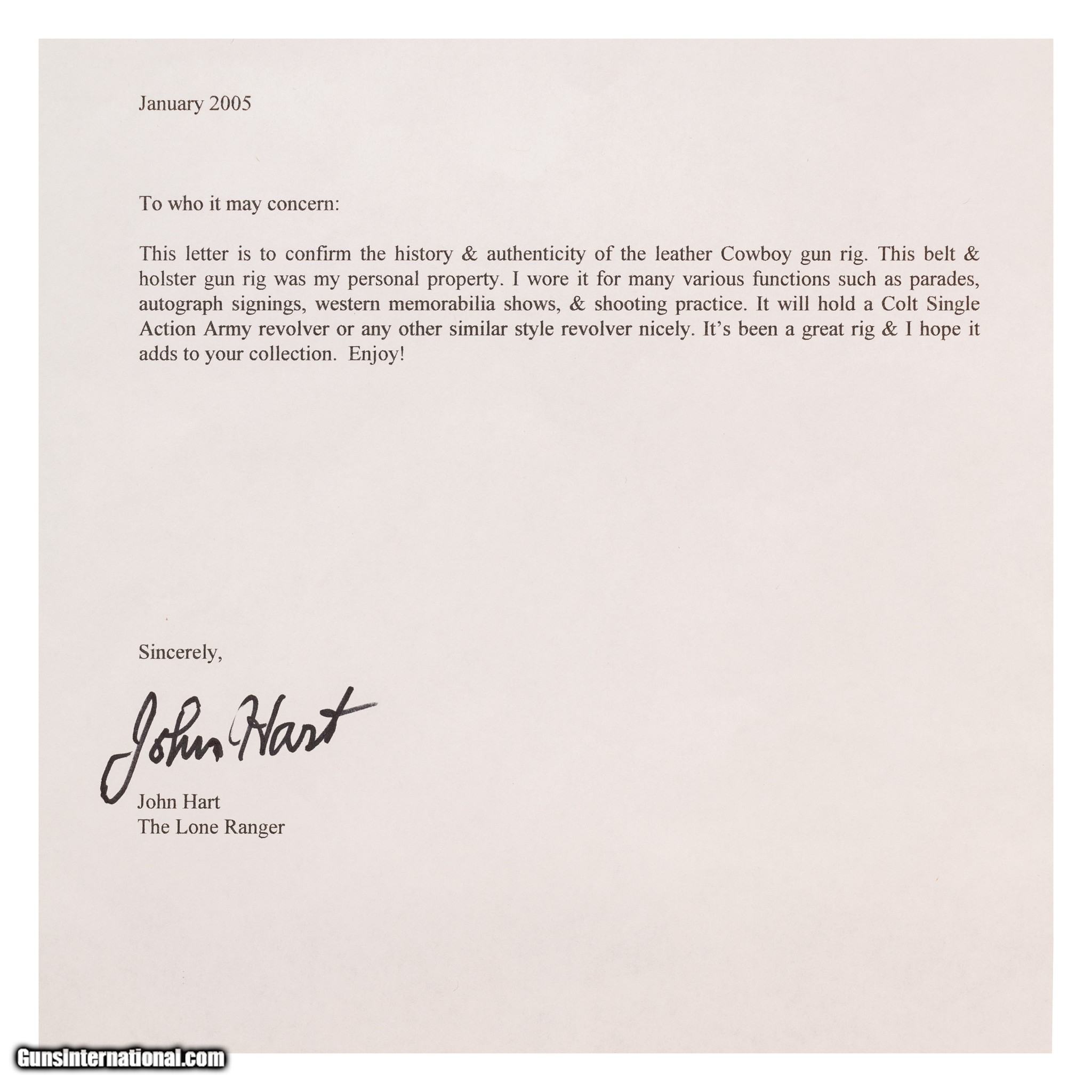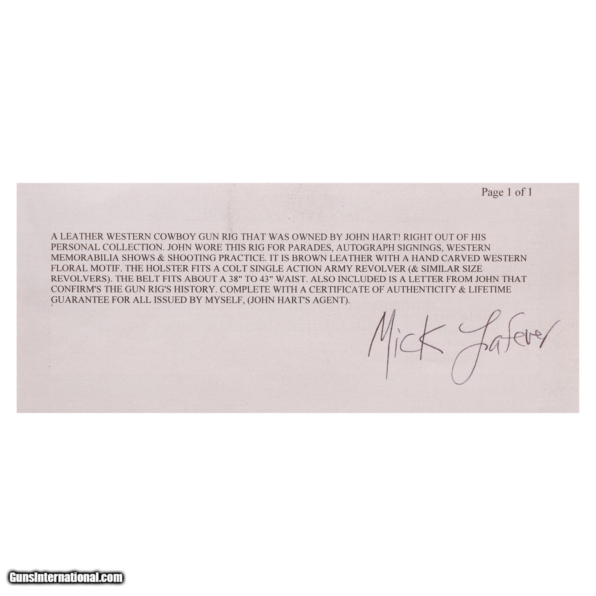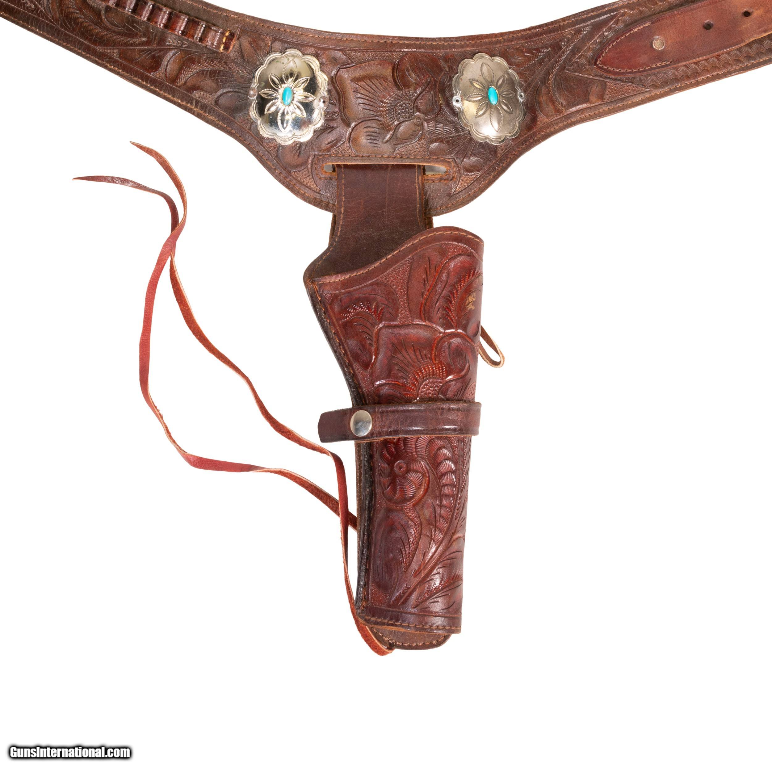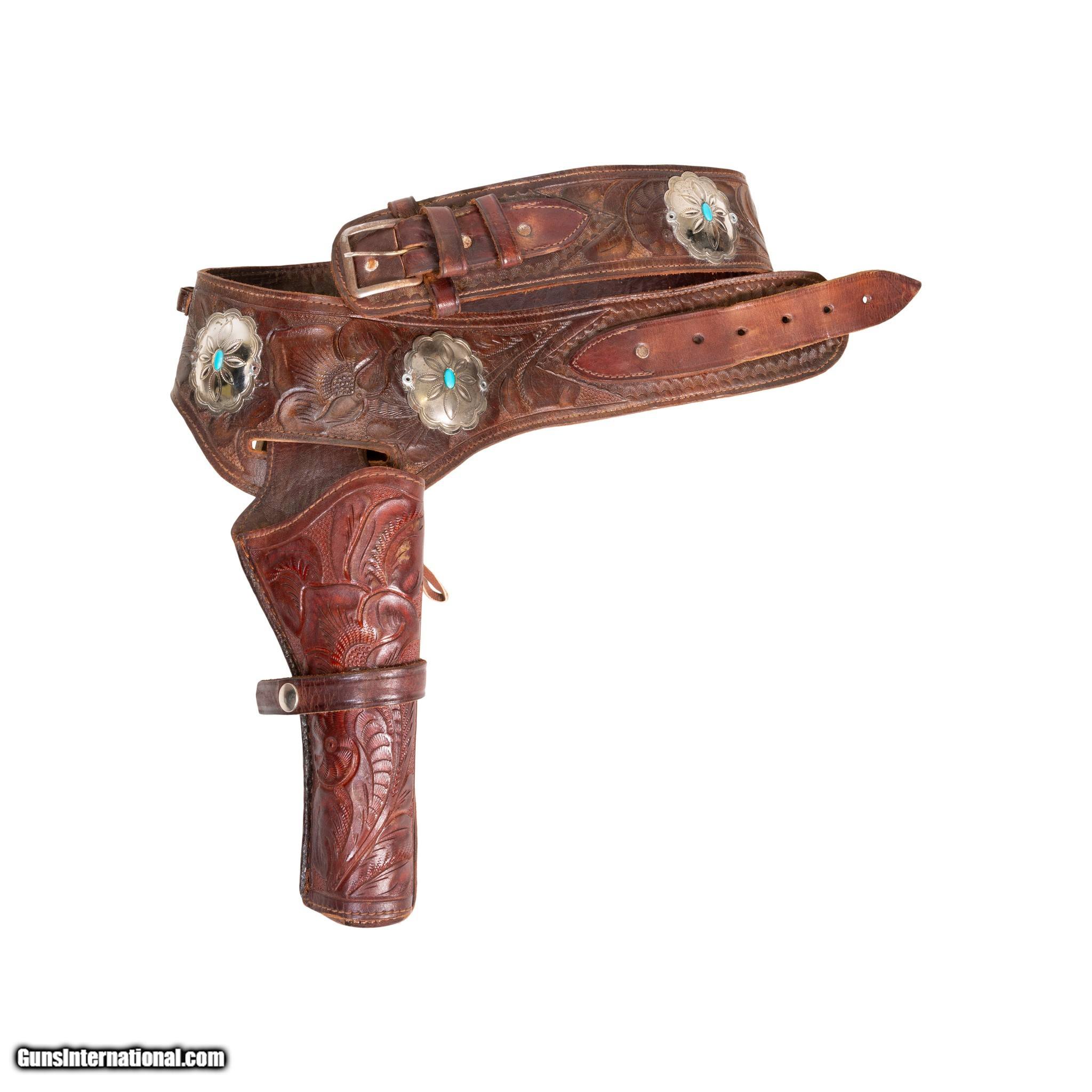 Description: A tooled leather western cowboy gun rig that was owned by John Hart - the Lone Ranger out of his personal collection. John wore this rig for parades, autograph signings, western memorabilia shows and shooting practice. Brown leather with a hand carved western floral motif. Holster fits a Colt single action Army revolver. The belts fits a 38" to 43" waist. Two stamped "silver" conchos with a single bead of turquoise on each side of holster. Cartridge loops for .38 cal. Holster length 12". No makers mark. Also includes a letter from John that confirms the gun rig's history complete with a Certificate of Authenticity. PERIOD: Mid 19th Century ORIGIN: United States SIZE: 38" to 43" Waist SOLD |