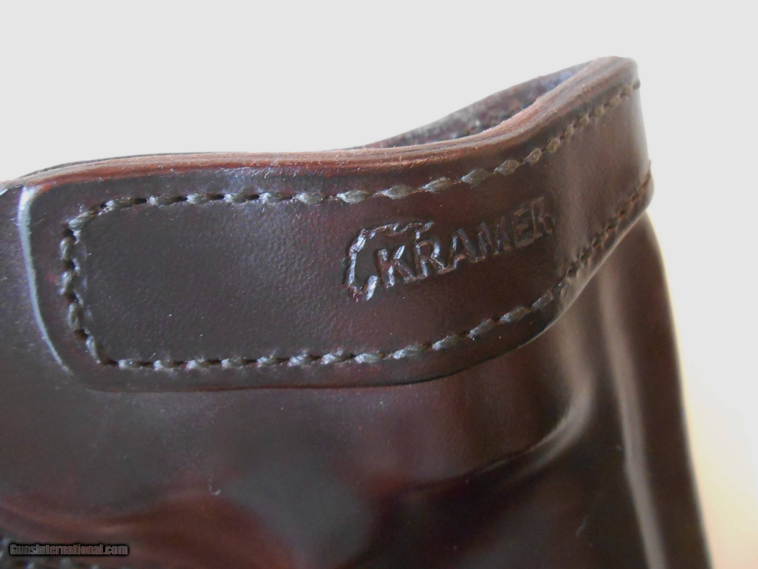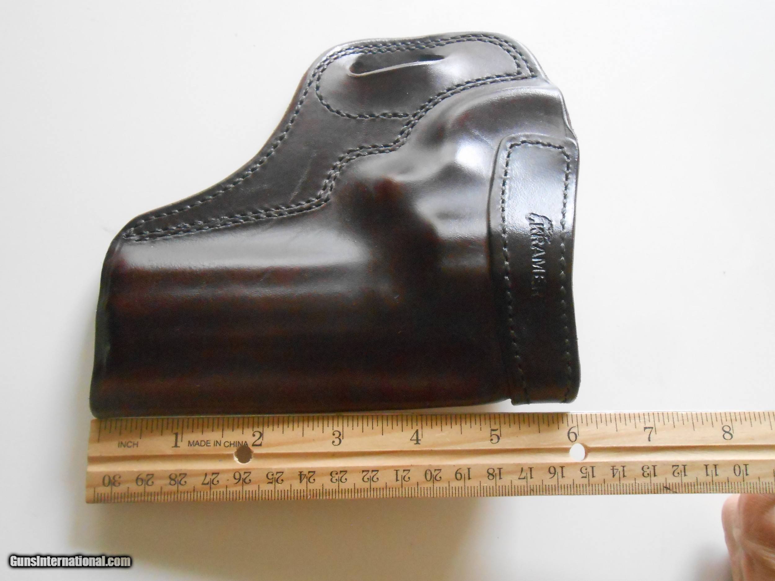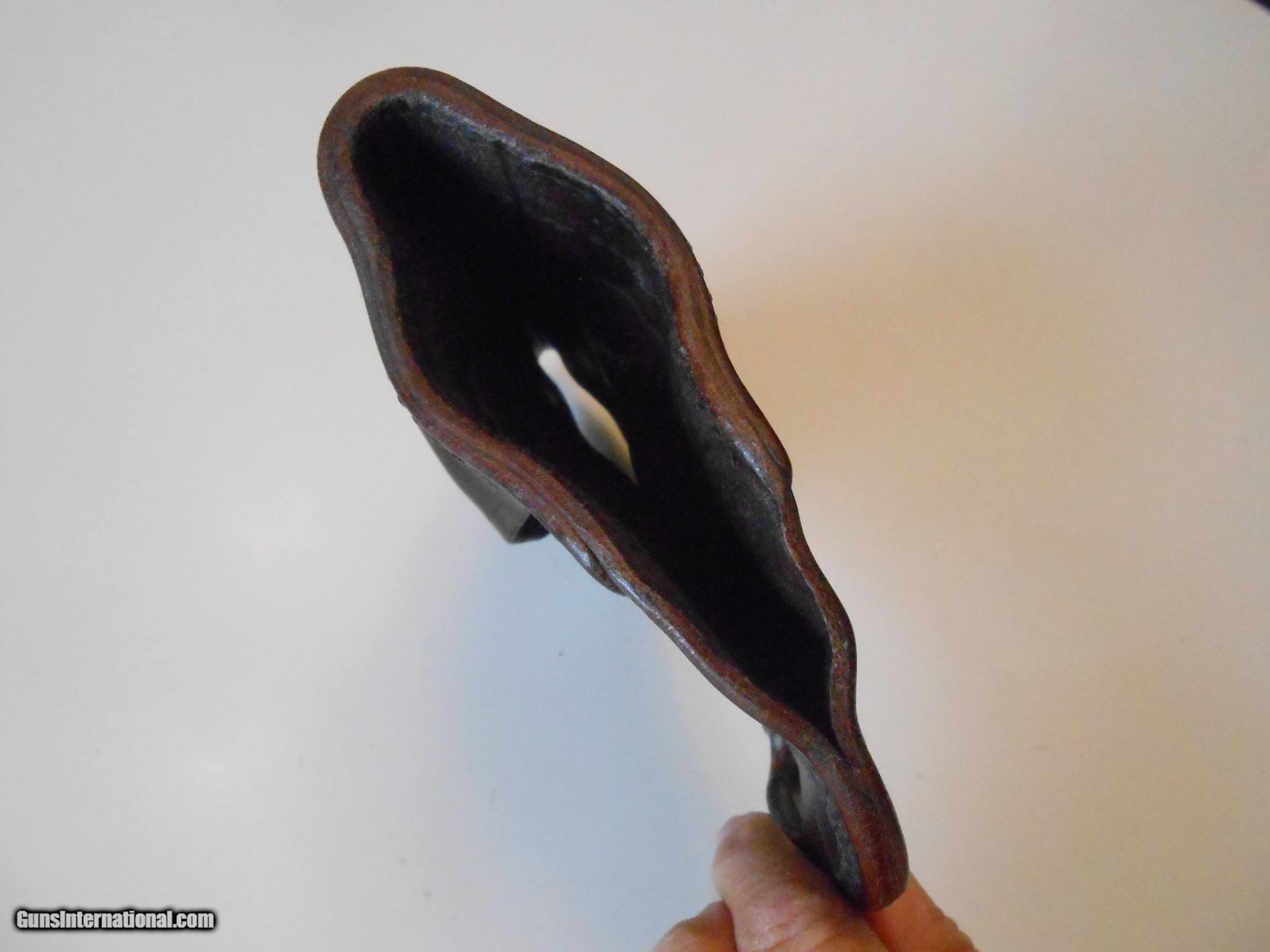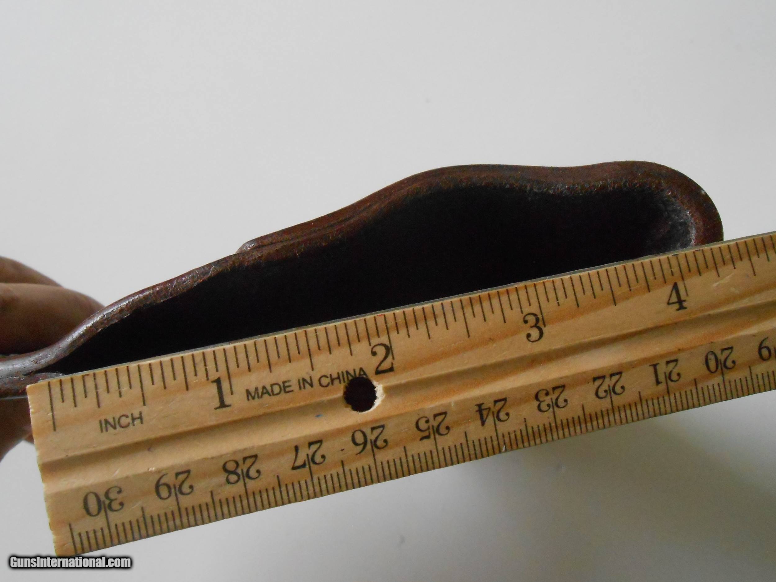 Description: Excellent, clean condition It appears to be unused, but there is a tiny bit of wear on the back on the belt loop (photo 4) Rich, dark cordovan-colored leather with sturdy matching stitching Leather has a glossy sheen with some visible graining Open top, open muzzle Right handed dexterity One belt slot and a belt loop I can get a 1-1/4" wide belt comfortably through the slot. I can also get it through the loop, but it is snug. So this is for 1-1/4" belt (or I guess narrower) Marked on front with KRAMER and a horse head logo (photo 6) Marked on back with 686, which I guess helps ID pistol this is intended for (photo 7) I have included two photos with a ruler (photos 11 & 12) NOTE: I do not know what pistol this holster is designed to accommodate. Hopefully, the pictures and model number will give you that information. $95.00 Includes shipping via USPS Priority Mail For sale only in the USA SOLD |