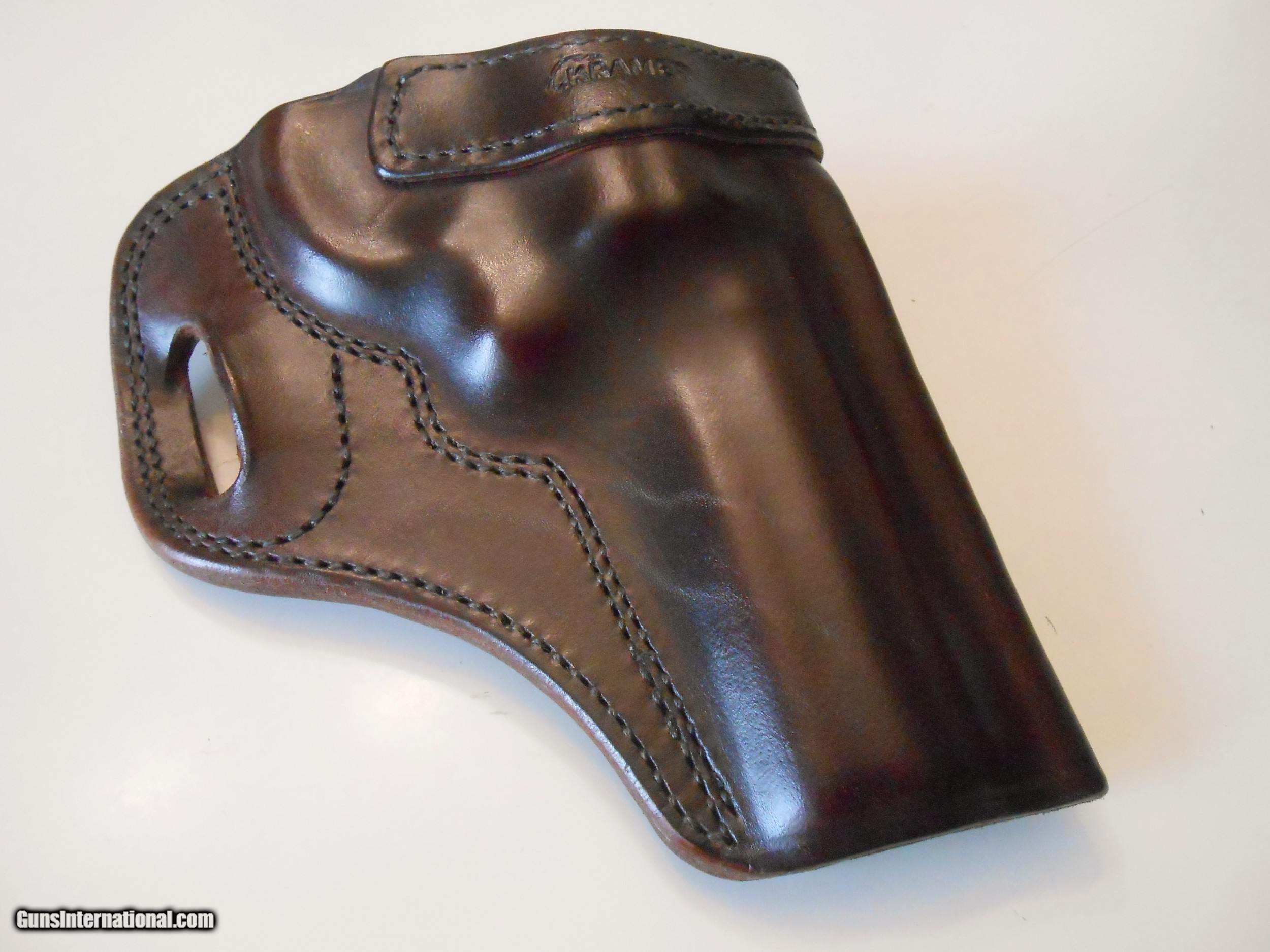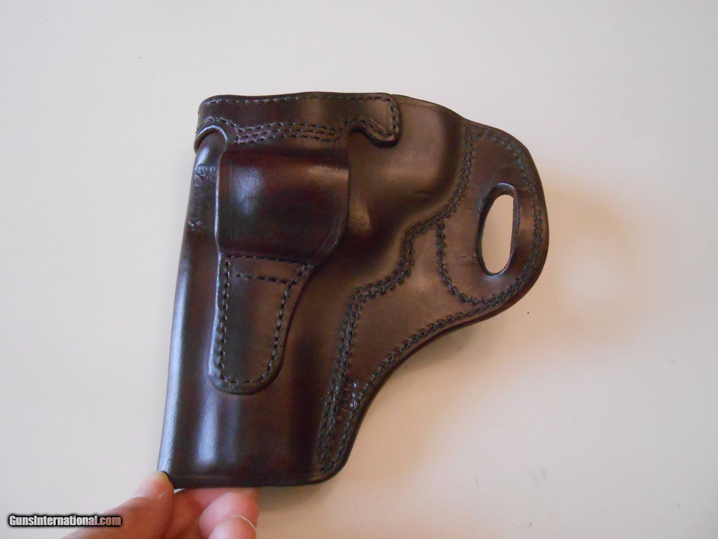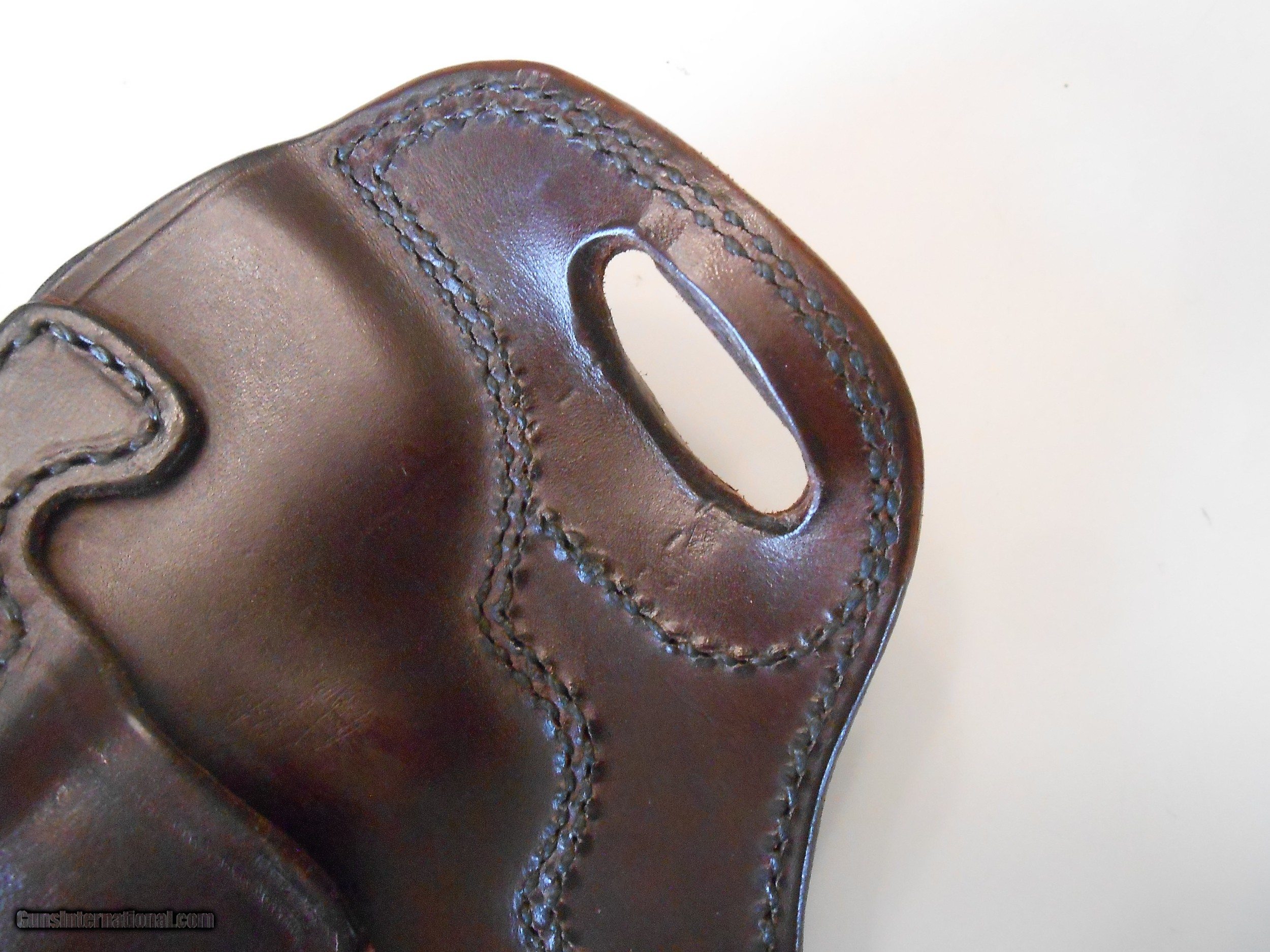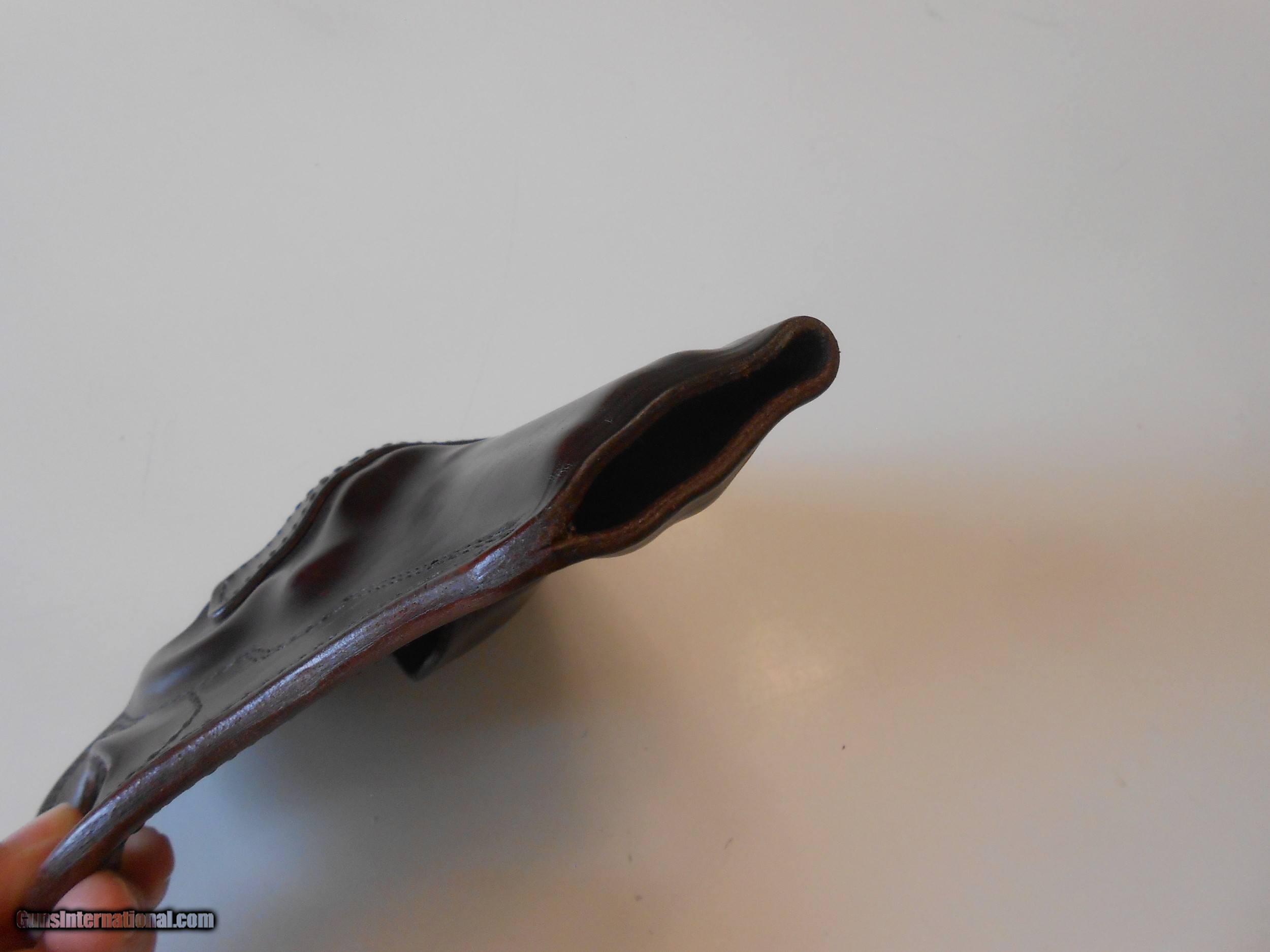 Description: Excellent, clean condition It appears to be unused, but there is a tiny bit of wear on the back on the belt loop (photo 4) Rich, dark cordovan-colored leather with sturdy matching stitching Leather has a glossy sheen with some visible graining Open top, open muzzle Right handed dexterity One belt slot and a belt loop I can get a 1-1/4" wide belt comfortably through the slot. I can also get it through the loop, but it is snug. So this is for 1-1/4" belt (or I guess narrower) Marked on front with KRAMER and a horse head logo (photo 6) Marked on back with 686, which I guess helps ID pistol this is intended for (photo 7) I have included two photos with a ruler (photos 11 & 12) NOTE: I do not know what pistol this holster is designed to accommodate. Hopefully, the pictures and model number will give you that information. $95.00 Includes shipping via USPS Priority Mail For sale only in the USA SOLD |