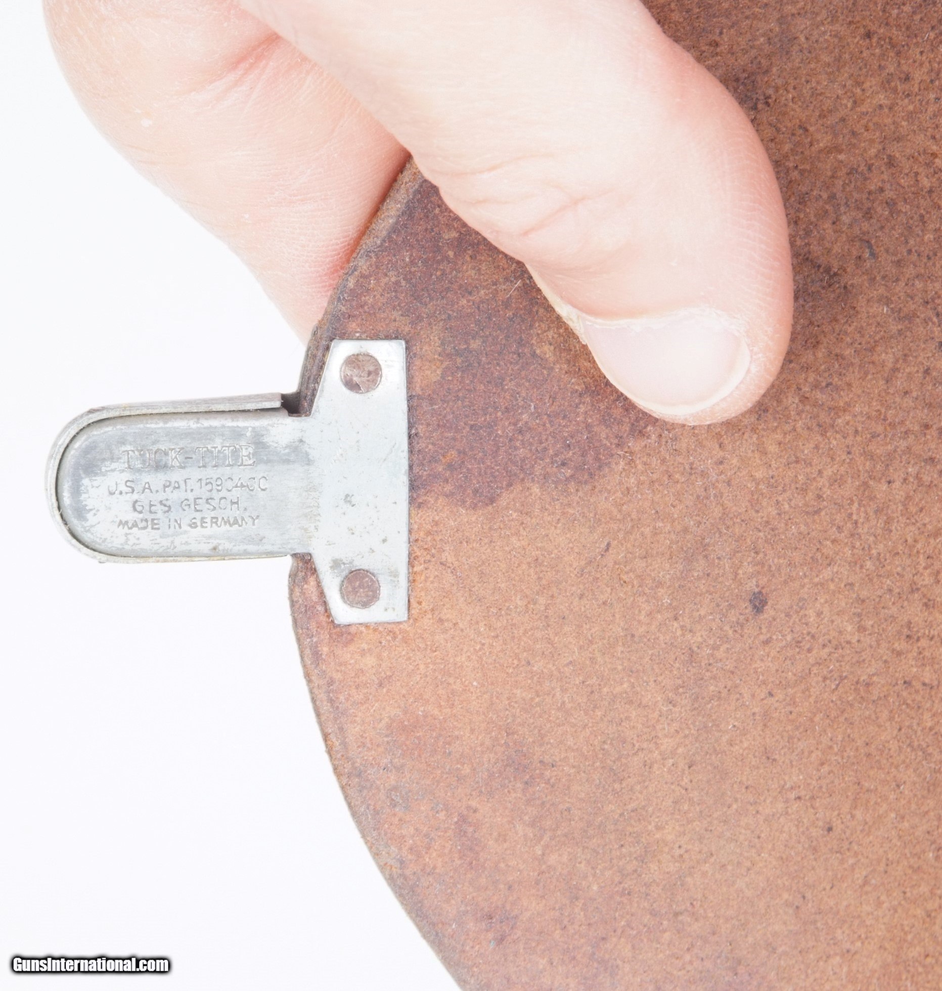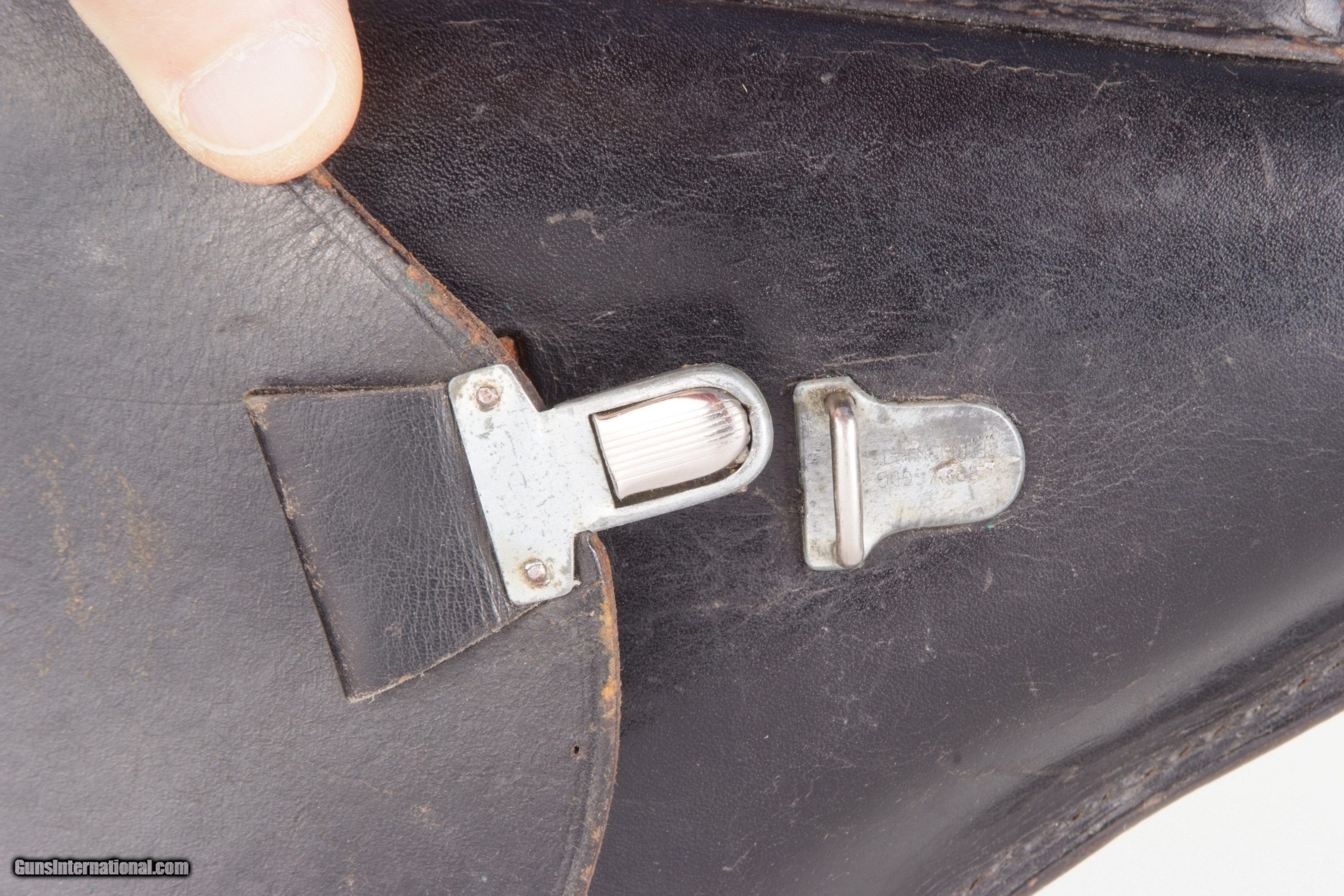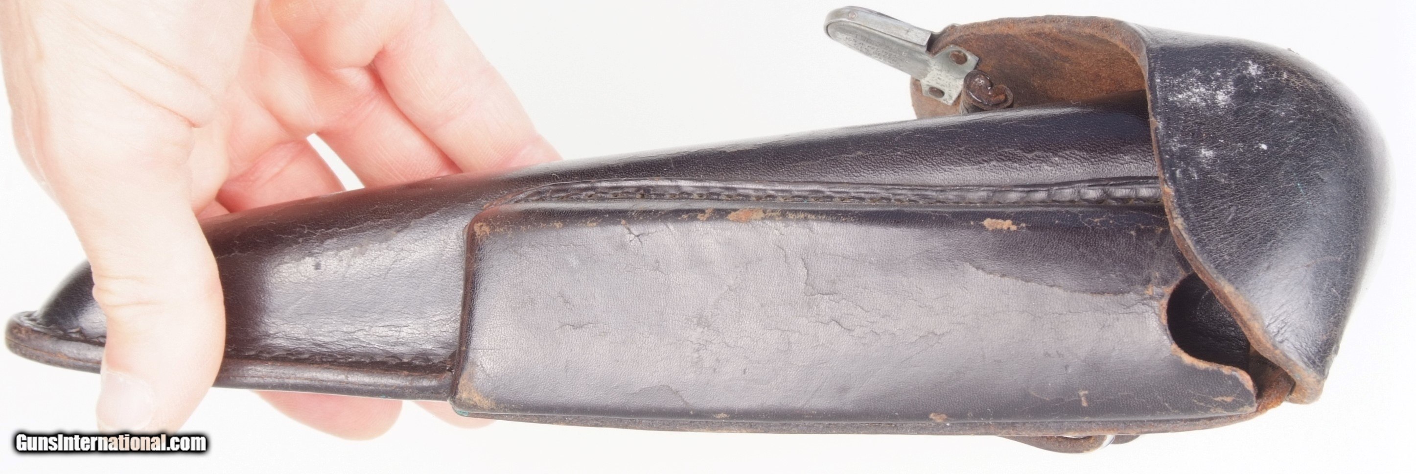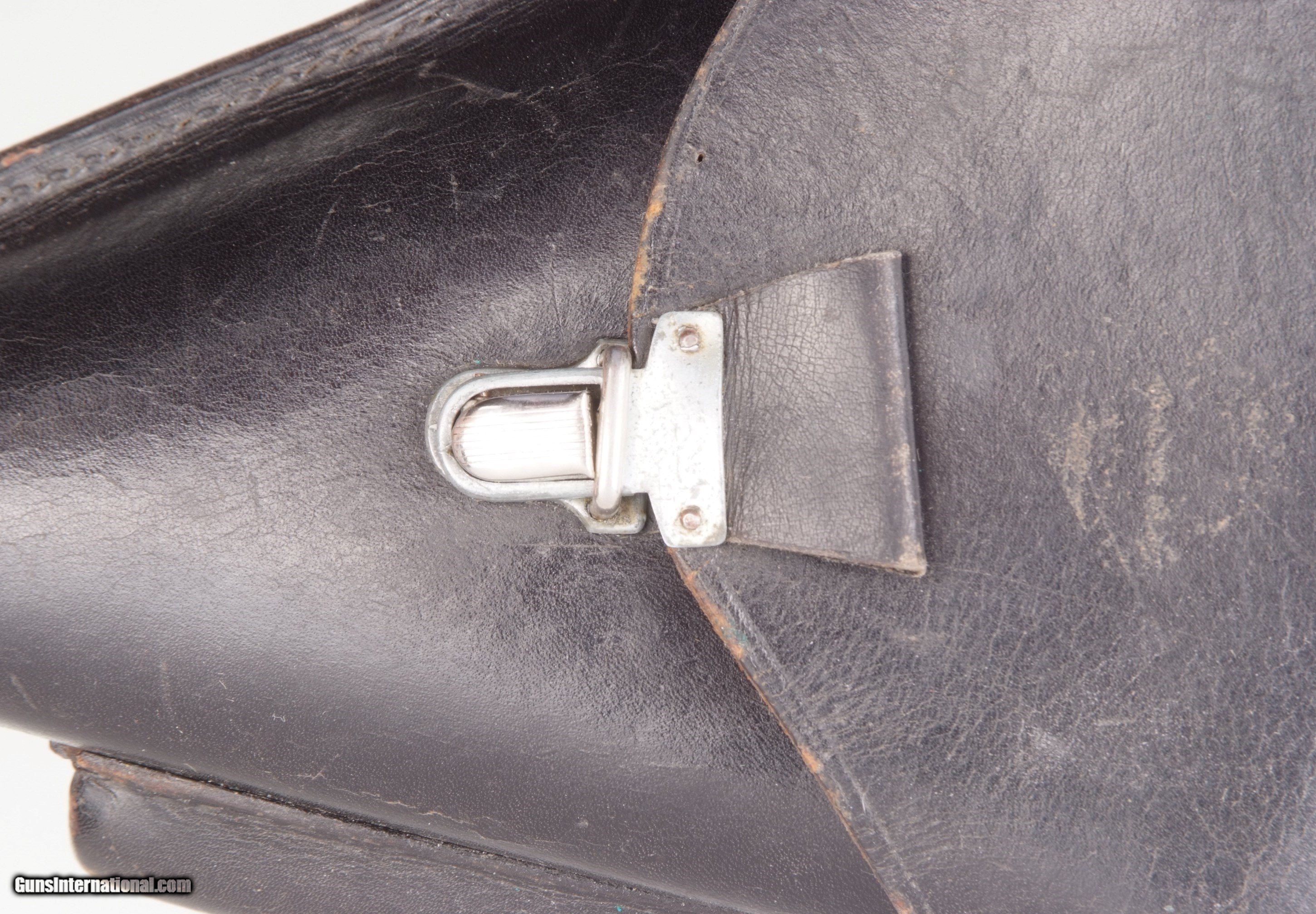 Description: Black leather commercial holster, unmarked, spring snap closure with pullup strap, spare magazine pouch and double belt loop. Inner surface of snap closure marked with patent and “Made in Germany”. Near excellent leather with intact pull up strap. No evidence of restitching. Depressable spring snap not under tension. A very unusual commercial holster, obviously made for export. A HISTORIC INVESTMENT! ~~Insured shipping fee of $35; most packages shipped using FedEx 2nd Day.~~ SOLD |
