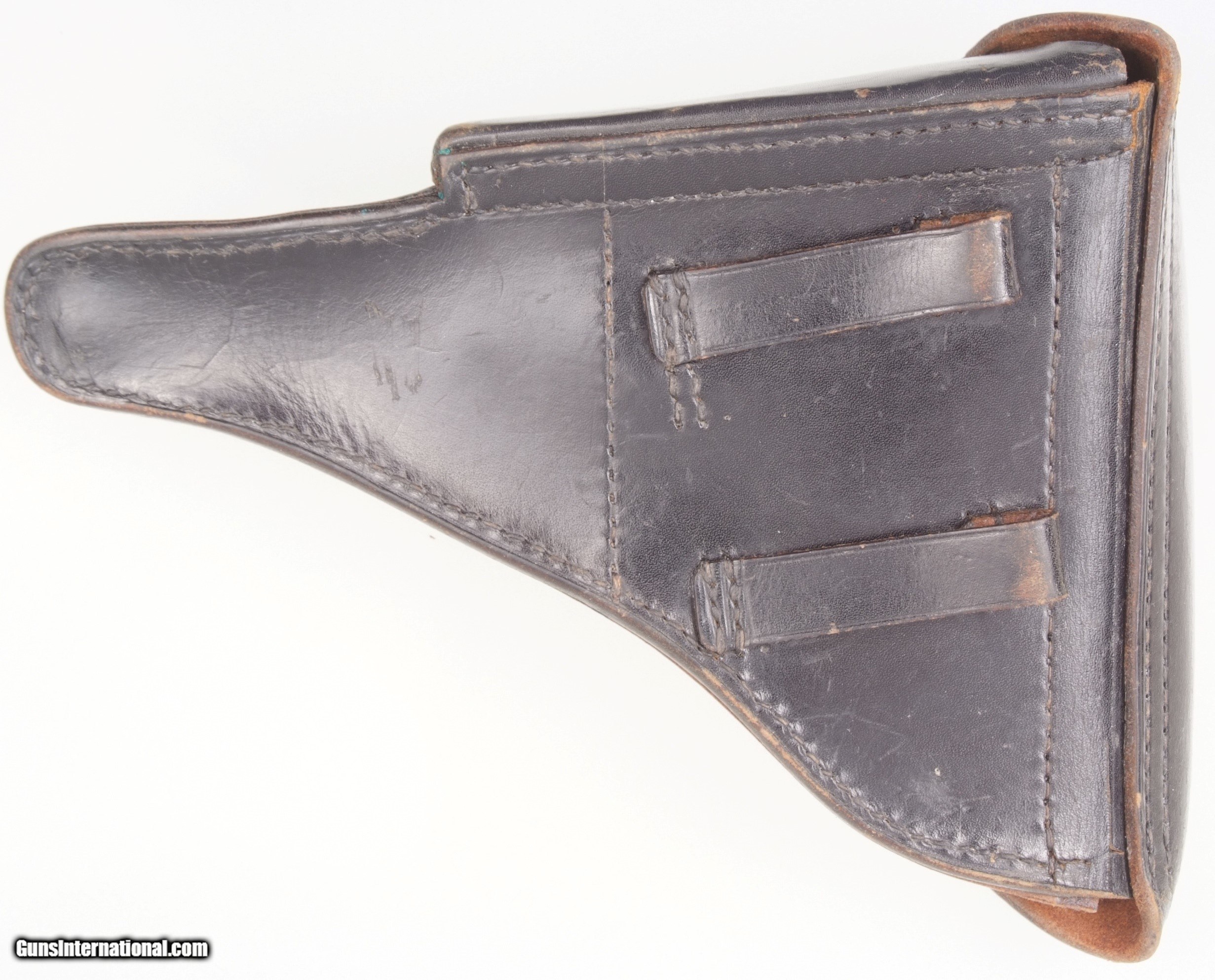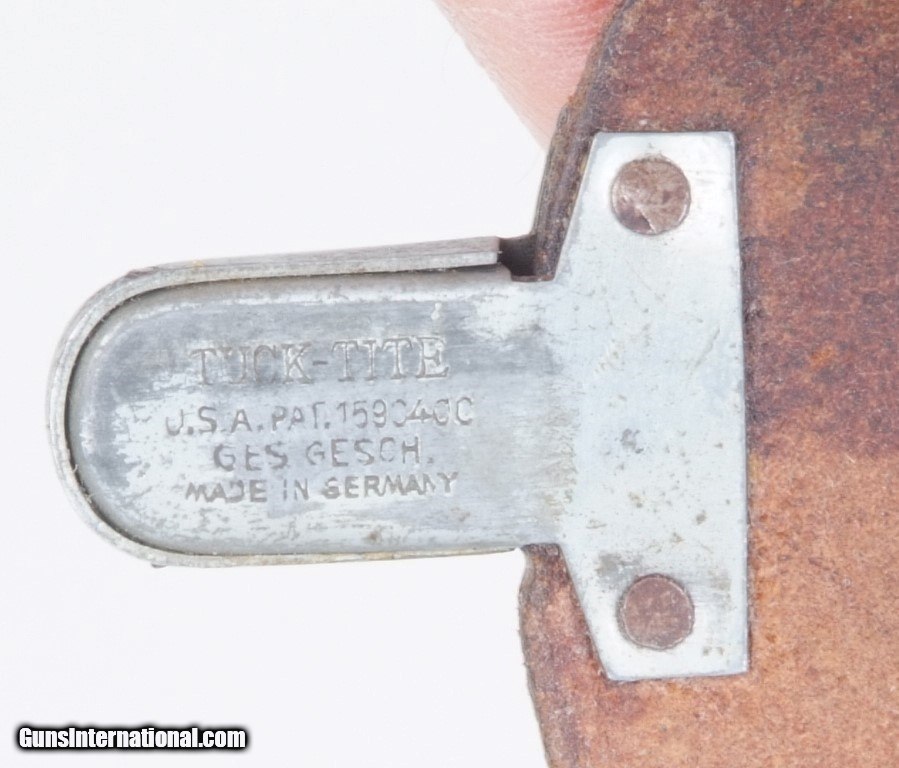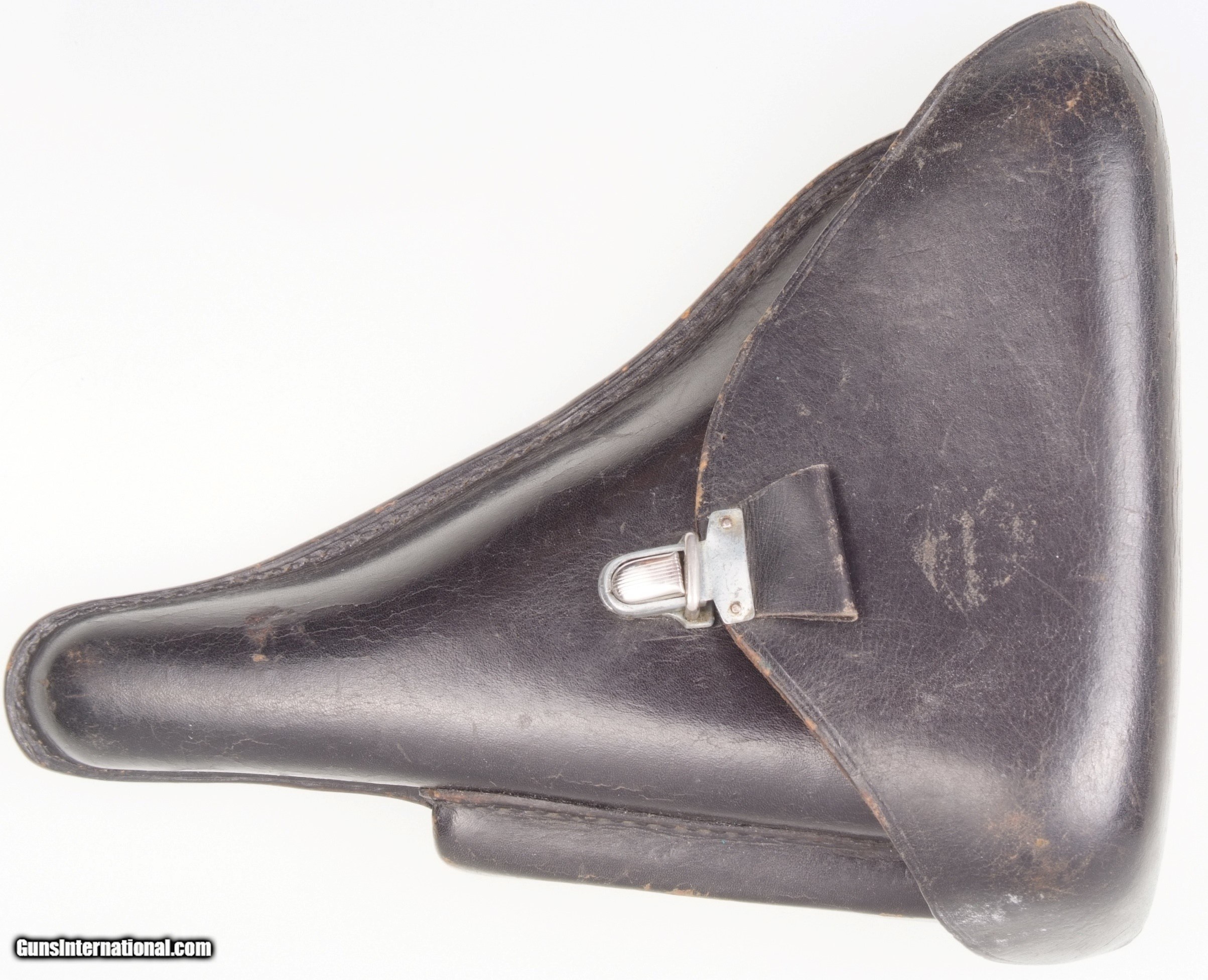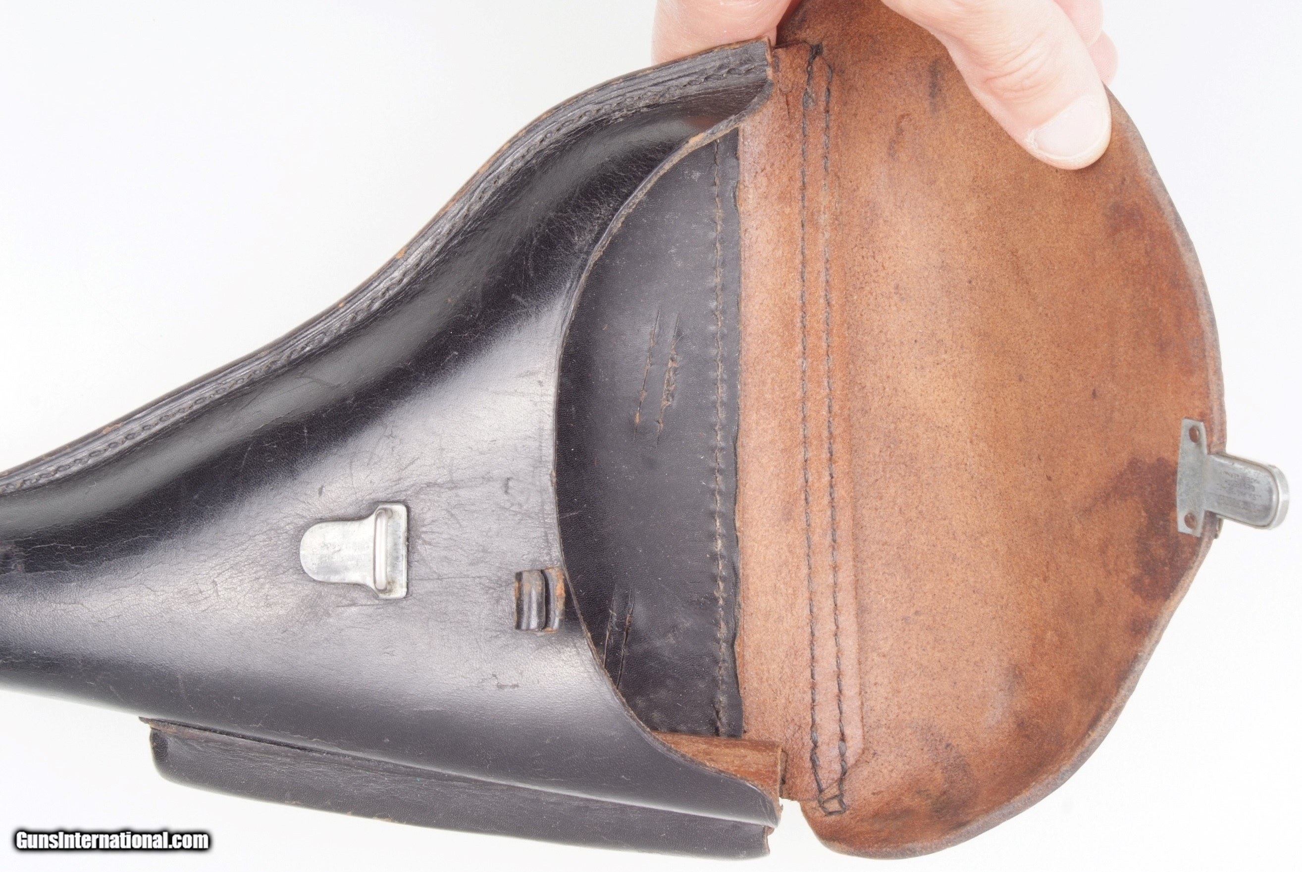 Description: Black leather commercial holster, unmarked, spring snap closure with pullup strap, spare magazine pouch and double belt loop. Inner surface of snap closure marked with patent and “Made in Germany”. Near excellent leather with intact pull up strap. No evidence of restitching. Depressable spring snap not under tension. A very unusual commercial holster, obviously made for export. A HISTORIC INVESTMENT! ~~Insured shipping fee of $35; most packages shipped using FedEx 2nd Day.~~ SOLD |