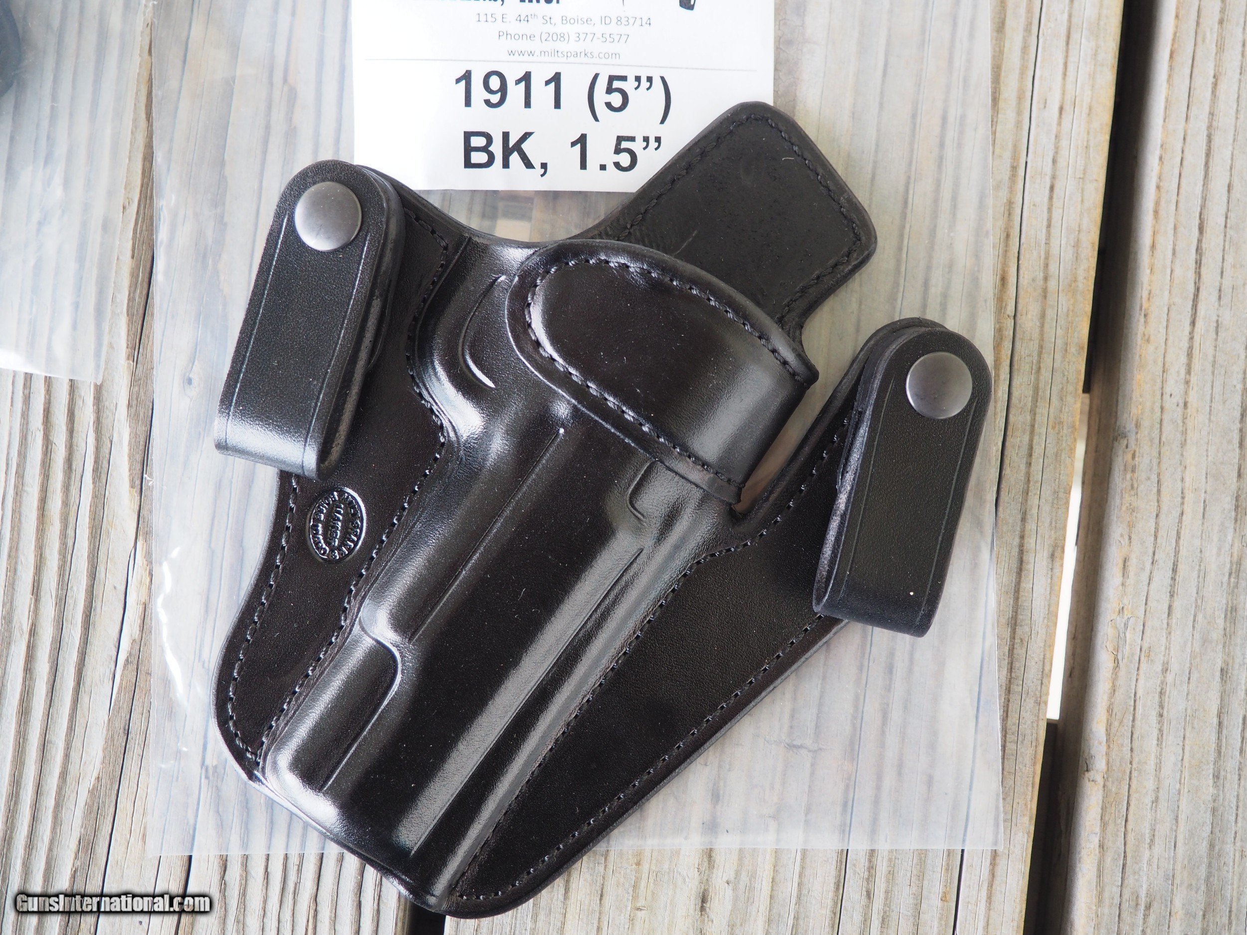 Description: Milt Sparks VM-2(Versa Max 2). This holster is brand new in the bag, direct from Milt Sparks holsters, to me, a long time dealer for them. This IWB(inside the waistband)holster fits the 5" 1911, non railed pistols. It is black cowhide, right hand, with 1.5" belt loops. One of the all time best sellers in the concealment line. Metal reinforced mouth, with the belt loops spreading the weight nicely. Purchase with confidence, avoid the multi week wait. Shipping is included in the purchase price. I have other Sparks gear available, see my other listings. Happy to take your credit card over the phone with no "surcharge"! SOLD |