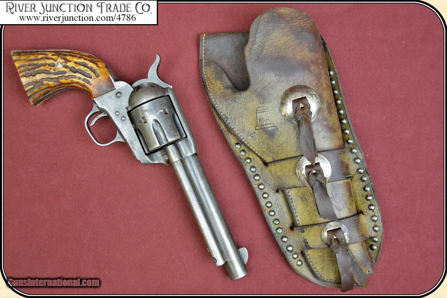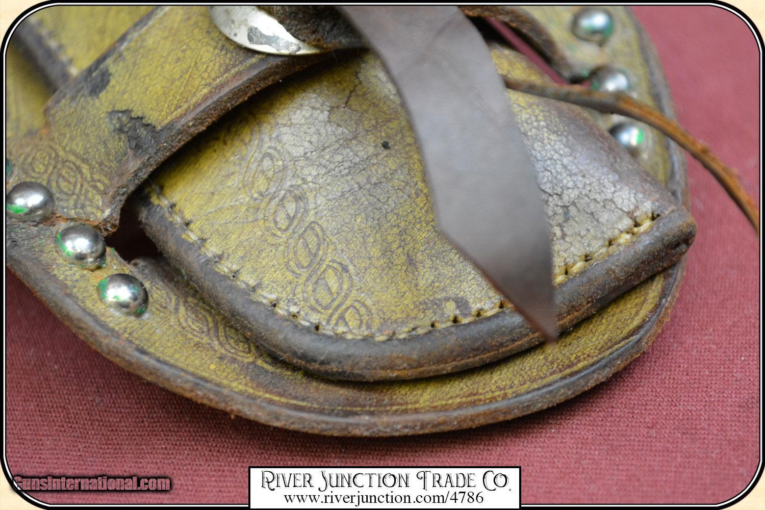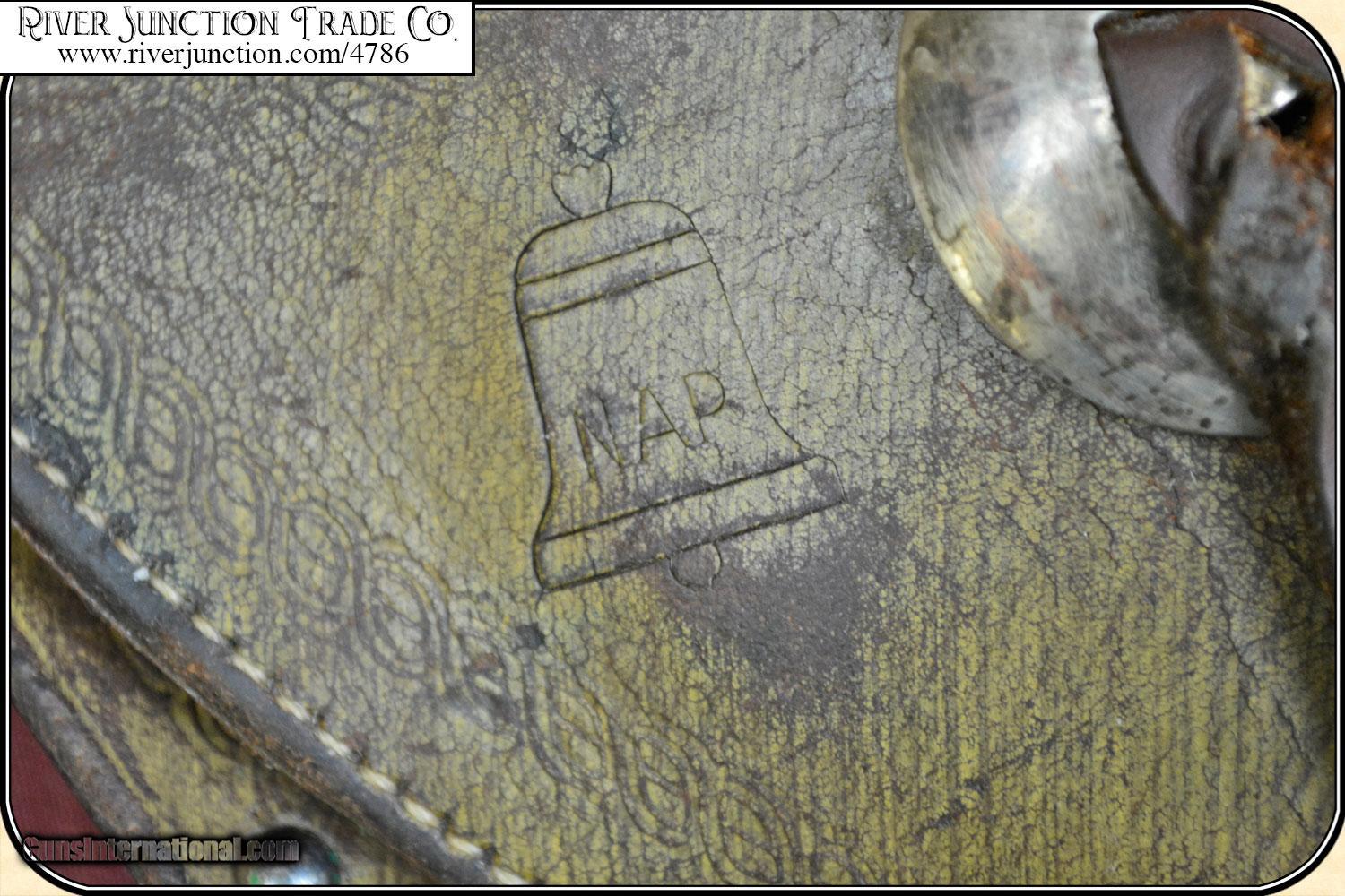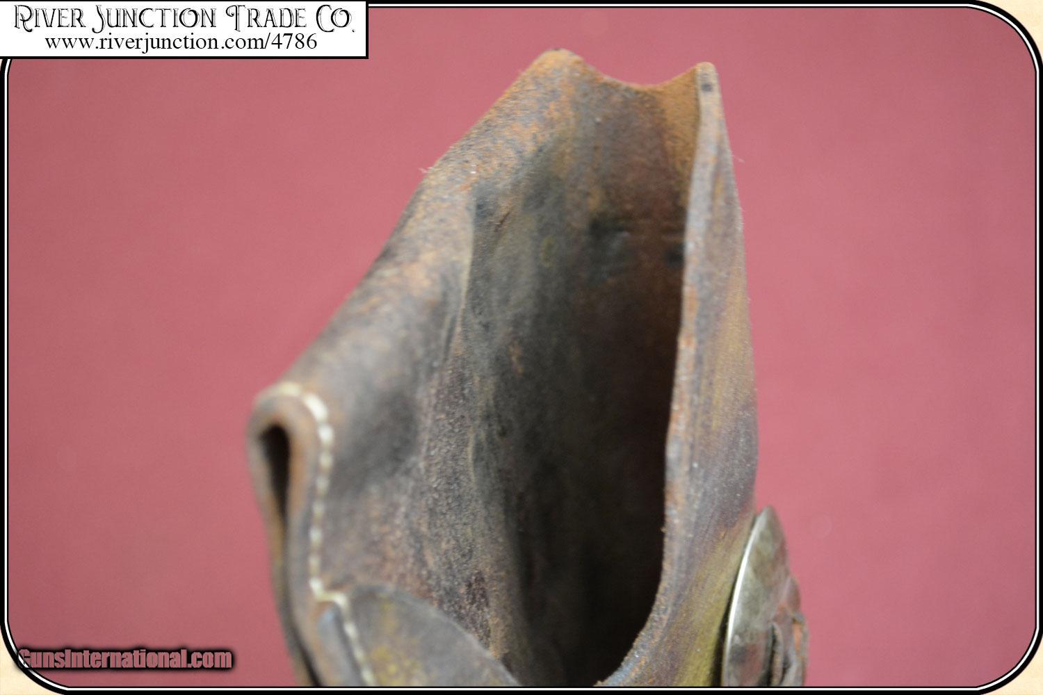 Description: This is an Antique, Belknap Hardware Company holster with a Bell shaped Logo and NAP, stamped on the pouch of the holster. Perfect fit for a 5 1/2 or 4 3/4 barreled Colt SAA. (My Colt is not included) This famous catalog store and wholesale company was founded in Louisville Ky. on the banks of the Ohio river in 1840. Belknap hired the top makers of the day to do products for them and they put their name on them. This is a typical hardware store grade holster in brown 6 to 7 ounce leather. It bears the Bell shaped logo the letters N A P stamped in the center of the bell shape, "BELKNAP". On the back it has the catalog #H638 5 1/2 so you know it was for a Colt SA. This is the type holster that was purchased by working cowboys from a local general store as these stores order them from the likes Belknap Hardware, Sears & Roebucks and Montgomery Wards CONDITION is VERY GOOD and would give much service. The finish shows some wear. Color is original,but now has a dull patina that bespeaks of honest use. There are some minor marks and scratches. The leather is holding its shape and is alive. The stitching is tight. The logo stamping, is deep and clear. An excellent collectible and display piece and for your vintage gun or it is ready for light use. Some bunk house pistolero has added spots and conchos. Payment Cash, postal money order, cashiers check, personal & business checks. Can be ordered with a credit card or paypal at wxx.riverjunction,cxx just type in the number 4786 in the search box. SOLD |