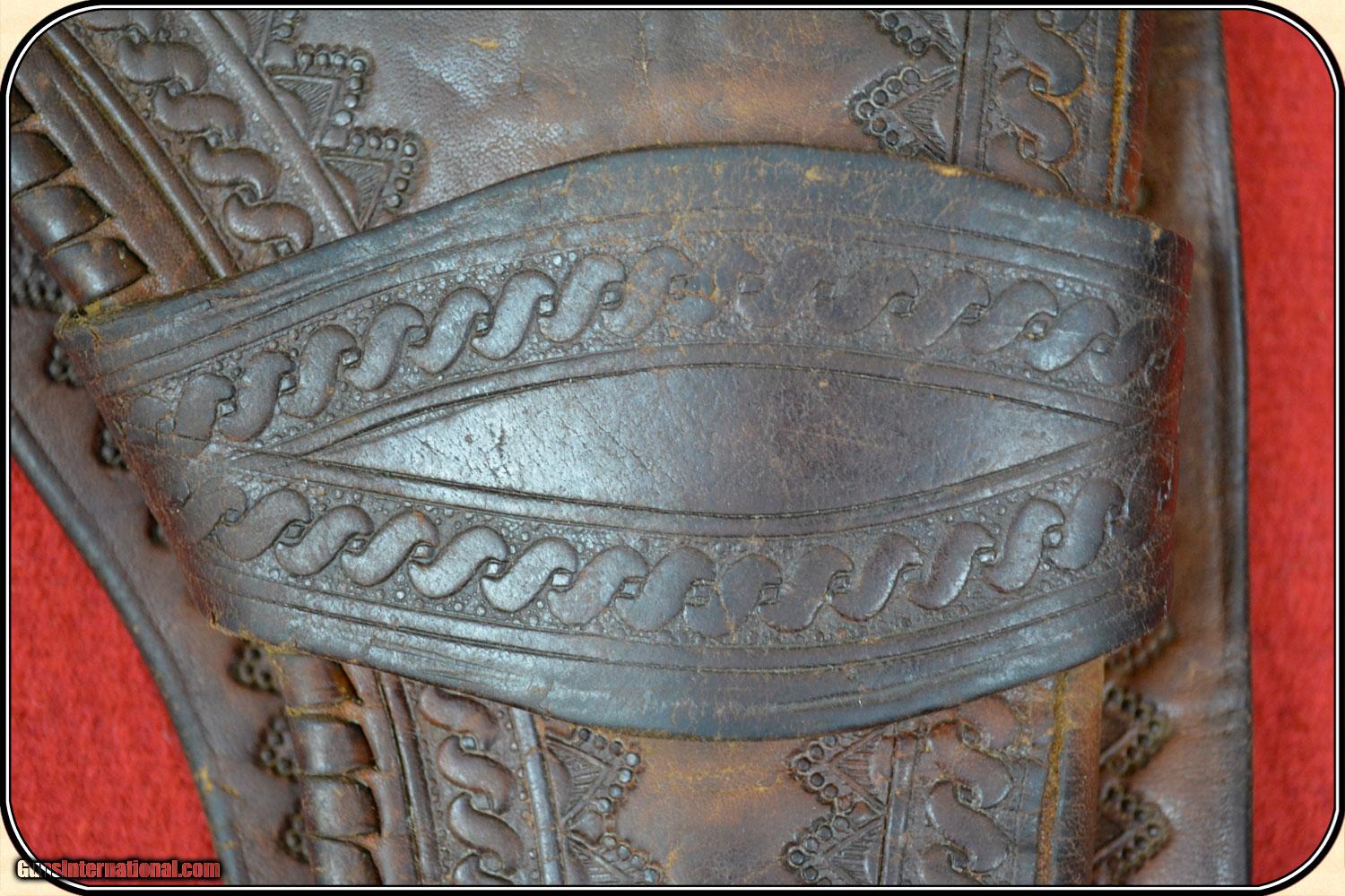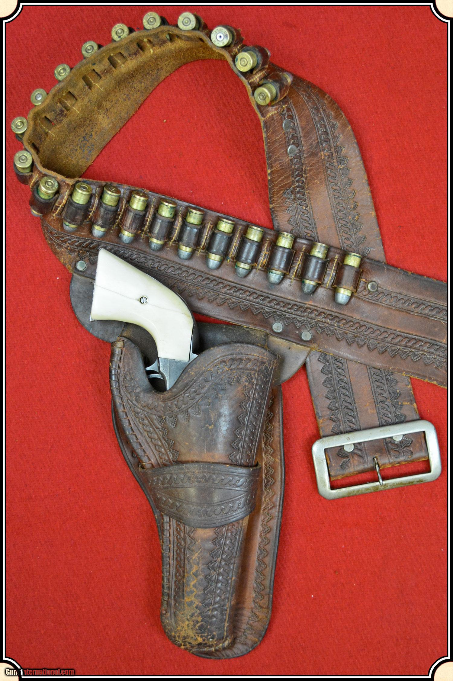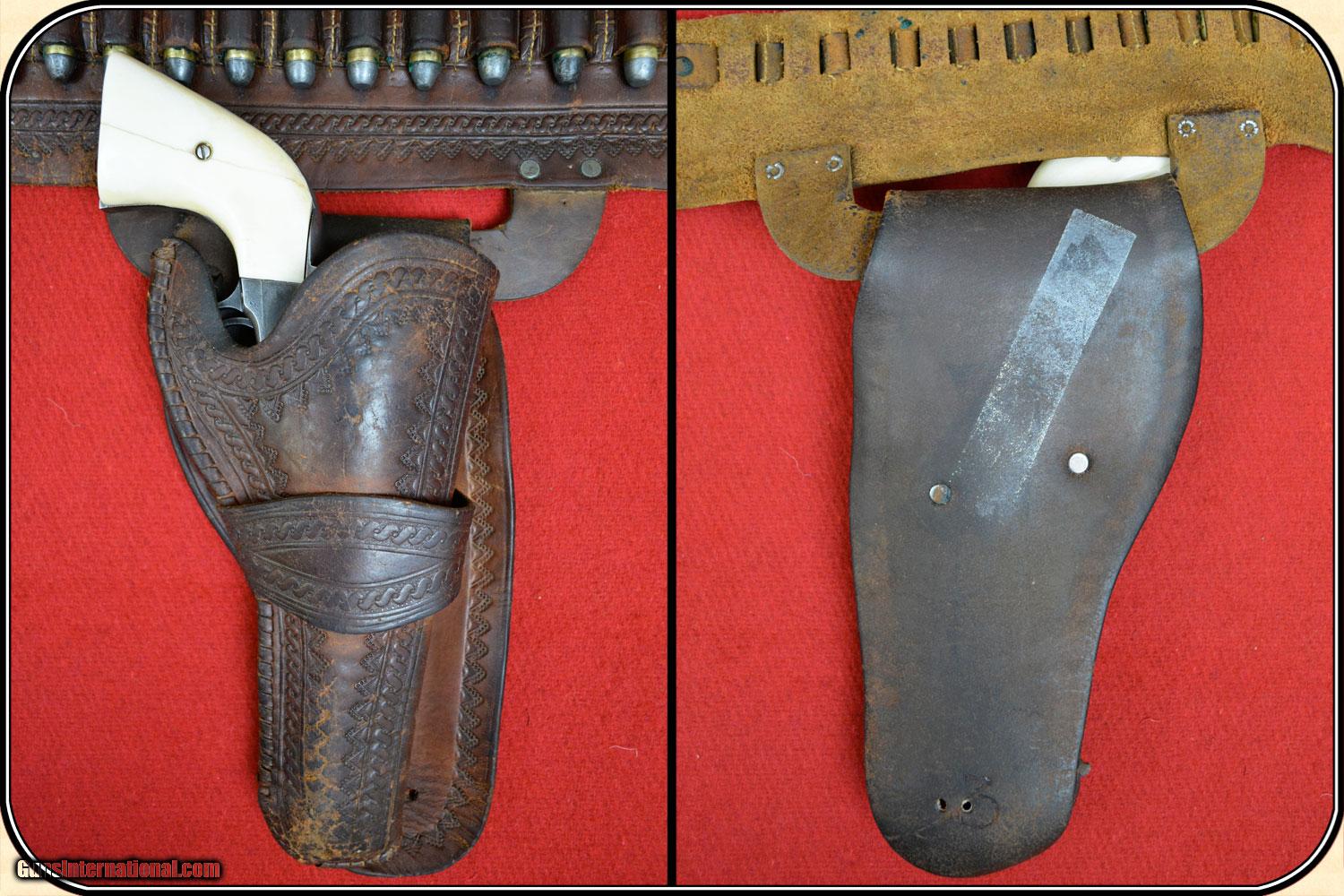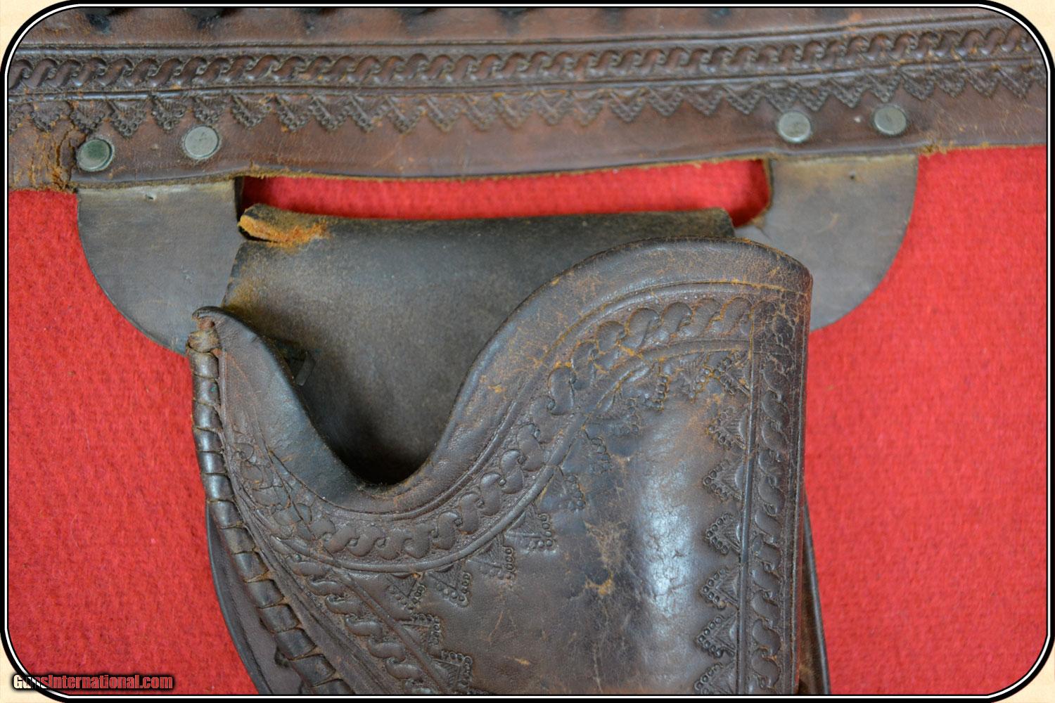 Description: In the old west of the late 1800s and early 1900s individuals that packed a big bore revolver usually carried it in a belt holster high on their hip. As I have been told some Texas Rangers who were in pursuit of a outlaws, began to favor wearing their holster lower to make for a quicker draw. They often modified their straight cartridge belts by cutting a slot below the cartridge loops and putting their holsters through that slot. Another technique was to add a heavier loop to the bottom of the belt, this was more stable than the slot in the belt. That is the modification shown on this belt. Mexicans along the border noticed this and knew these men to be Ranger and also knew they were seeking or searching for the law breakers, some times referred to as "banditos". The Spanish word searching or seeking is "buscador" and that is where the term buscadero comes from and these belt and holster combinations became know as a Buscadero rig. The word Buscadero was also a derogatory term when referring to a Ranger or other lawman. This rig was made for a Colt single action army and would carry your 4 3/4 or 5 1/2 inch barrel Colt perfectly. The belt measure 46 Inches over all and 40 inches to the center hole. It is 3 inches wide which is unusually wide and has 22 bullet loops. The belt and holster have been to gather since the day they were made as evidenced by the matching stamping on both. The leather is very flecable and would make a great display piece with you Vintage Colt. The side seam of the holster is laced together with latigo leather lacing and a few stitches of lace at the toe are missing. The holster also has a tear at the fold of the skirt. (see photo). The dummy .45 cartridges are included my Colt is not. Payment Cash, postal money order, cashiers check, personal & business checks. Can be ordered with a credit card or paypal at wxx.riverjunction,cxx just type in the number 4315 in the search box. SOLD |