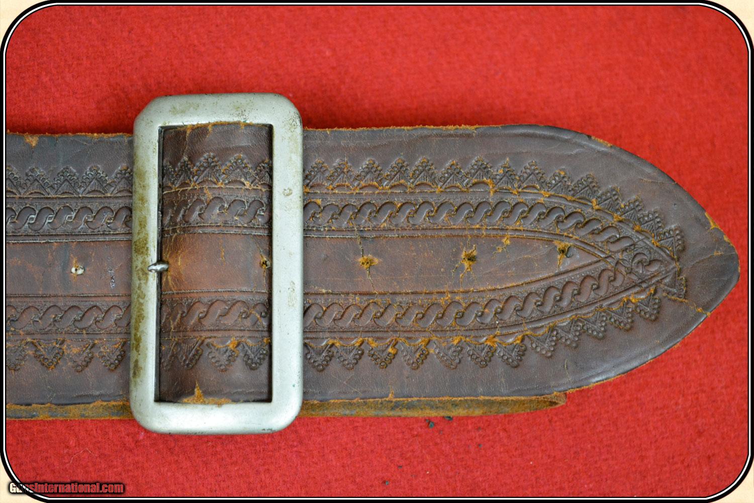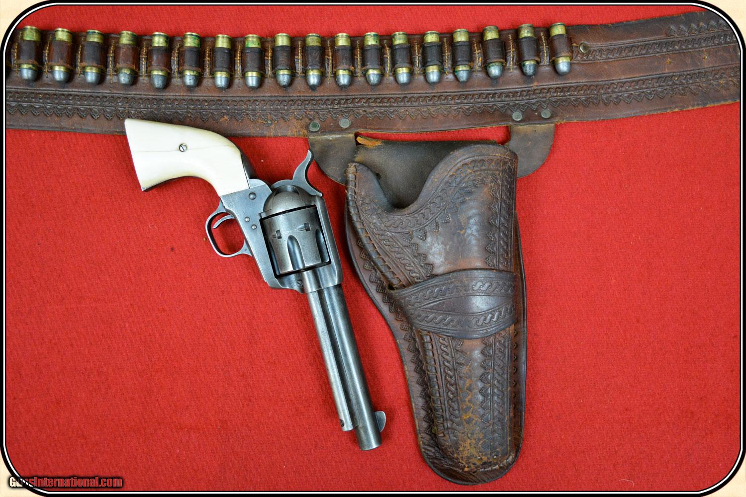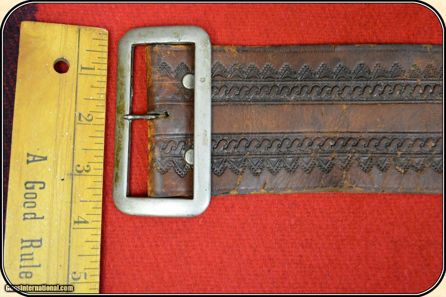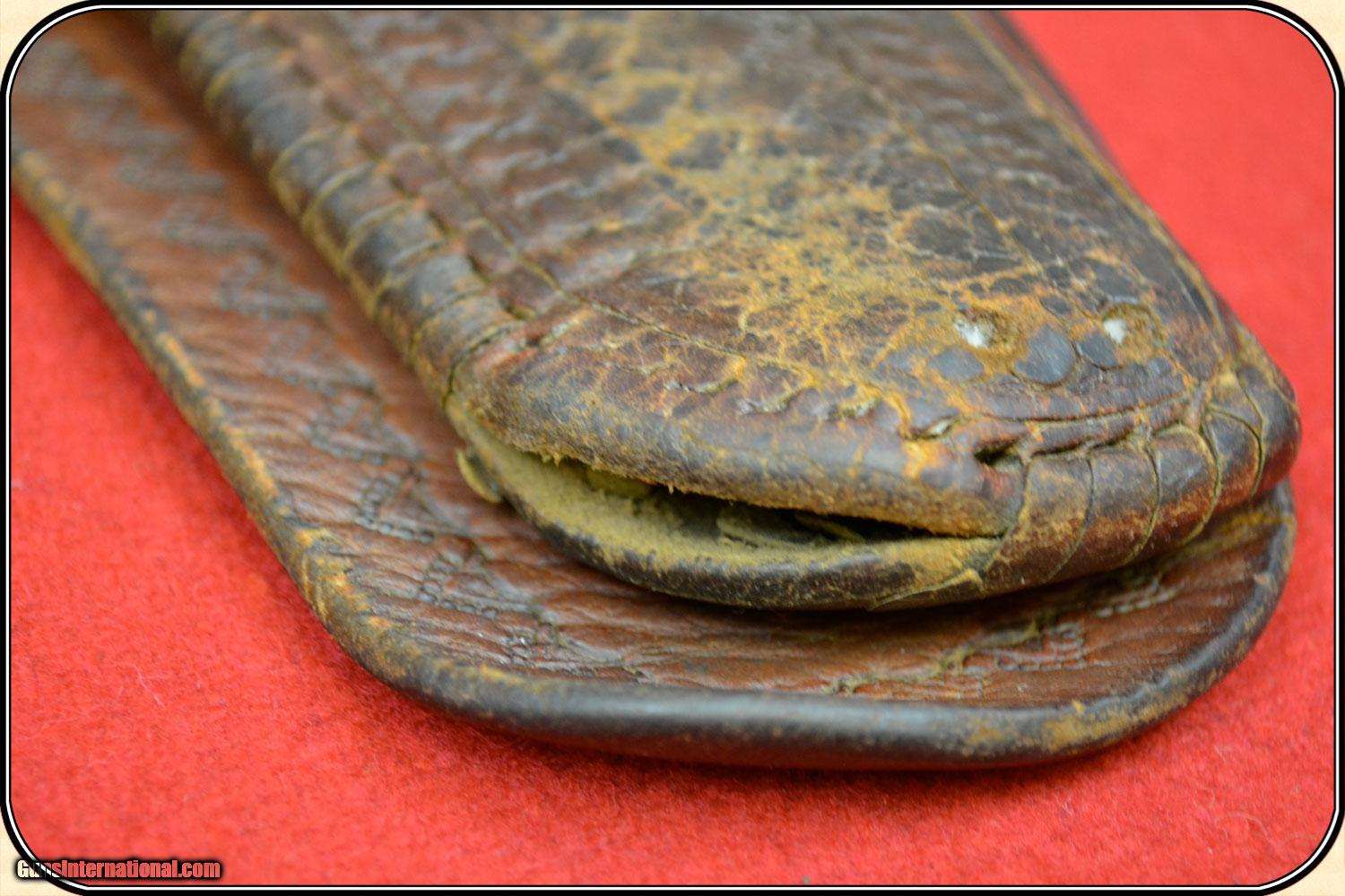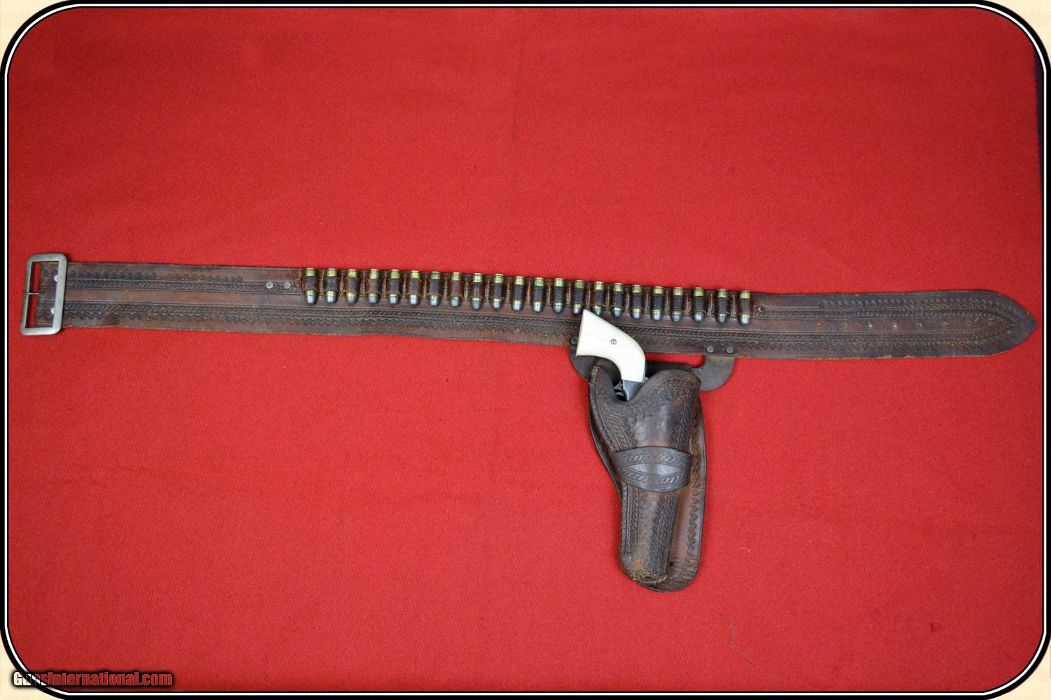 Description: In the old west of the late 1800s and early 1900s individuals that packed a big bore revolver usually carried it in a belt holster high on their hip. As I have been told some Texas Rangers who were in pursuit of a outlaws, began to favor wearing their holster lower to make for a quicker draw. They often modified their straight cartridge belts by cutting a slot below the cartridge loops and putting their holsters through that slot. Another technique was to add a heavier loop to the bottom of the belt, this was more stable than the slot in the belt. That is the modification shown on this belt. Mexicans along the border noticed this and knew these men to be Ranger and also knew they were seeking or searching for the law breakers, some times referred to as "banditos". The Spanish word searching or seeking is "buscador" and that is where the term buscadero comes from and these belt and holster combinations became know as a Buscadero rig. The word Buscadero was also a derogatory term when referring to a Ranger or other lawman. This rig was made for a Colt single action army and would carry your 4 3/4 or 5 1/2 inch barrel Colt perfectly. The belt measure 46 Inches over all and 40 inches to the center hole. It is 3 inches wide which is unusually wide and has 22 bullet loops. The belt and holster have been to gather since the day they were made as evidenced by the matching stamping on both. The leather is very flecable and would make a great display piece with you Vintage Colt. The side seam of the holster is laced together with latigo leather lacing and a few stitches of lace at the toe are missing. The holster also has a tear at the fold of the skirt. (see photo). The dummy .45 cartridges are included my Colt is not. Payment Cash, postal money order, cashiers check, personal & business checks. Can be ordered with a credit card or paypal at wxx.riverjunction,cxx just type in the number 4315 in the search box. SOLD |