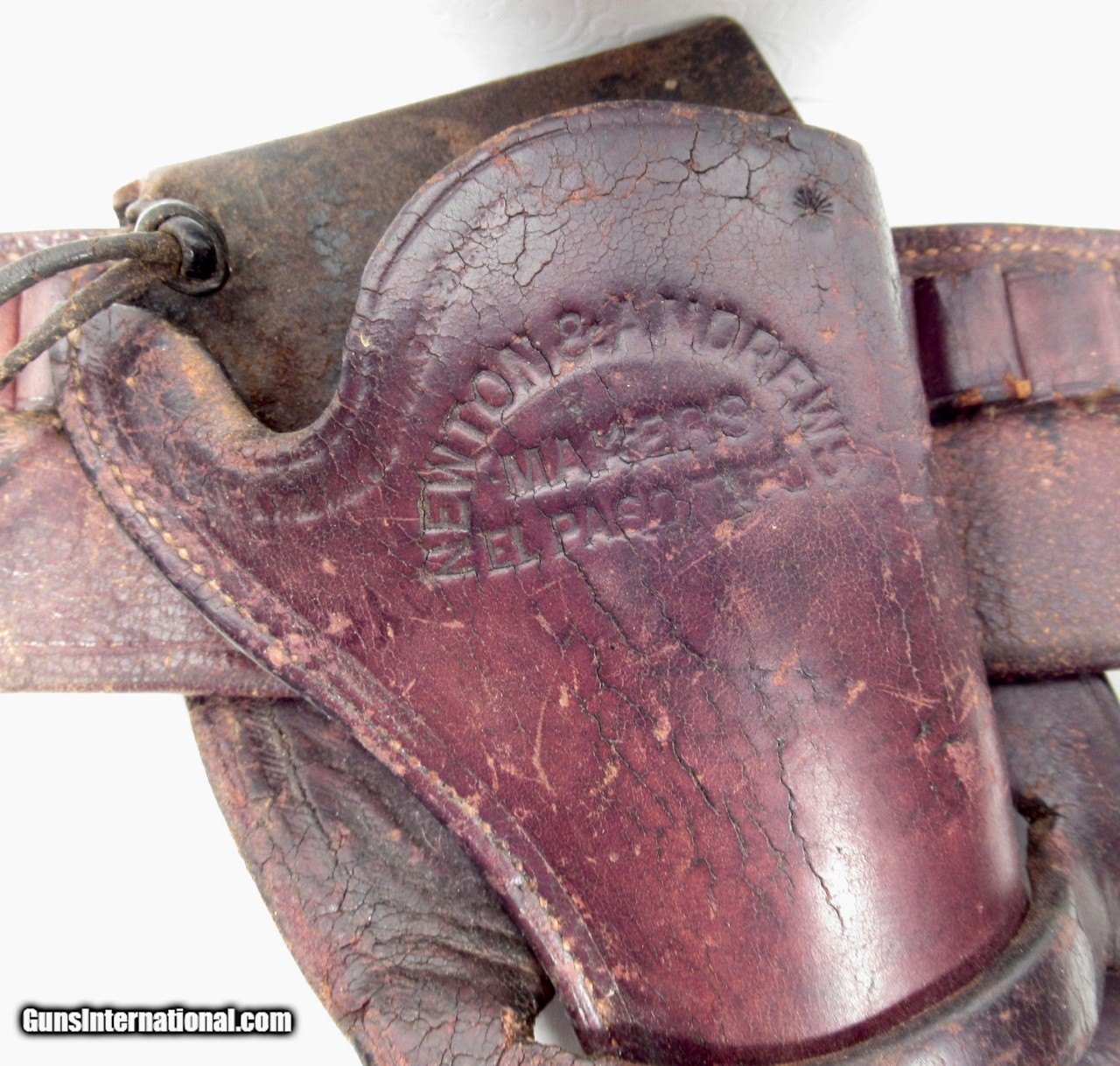 Description: Very Rare Double Loop Holster for 5 ½” Single Action Army; Marked “NEWTON & ANDREWS – MAKERS EL PASO TX”; This firm was in business from 1885 to 1890; Holster is Accompanied by Period Unmarked 40 ½” LOA Money Belt; All Original (See Photos for Condition); LIQUIDATING PERSONAL COLLECTION; Price: $4,500 Shipped; Price includes insured shipping; return policy: three days inspection from the date the items received; full refund of shipping both ways ONLY IF THE ITEM IS MISREPRESENTED. SOLD |