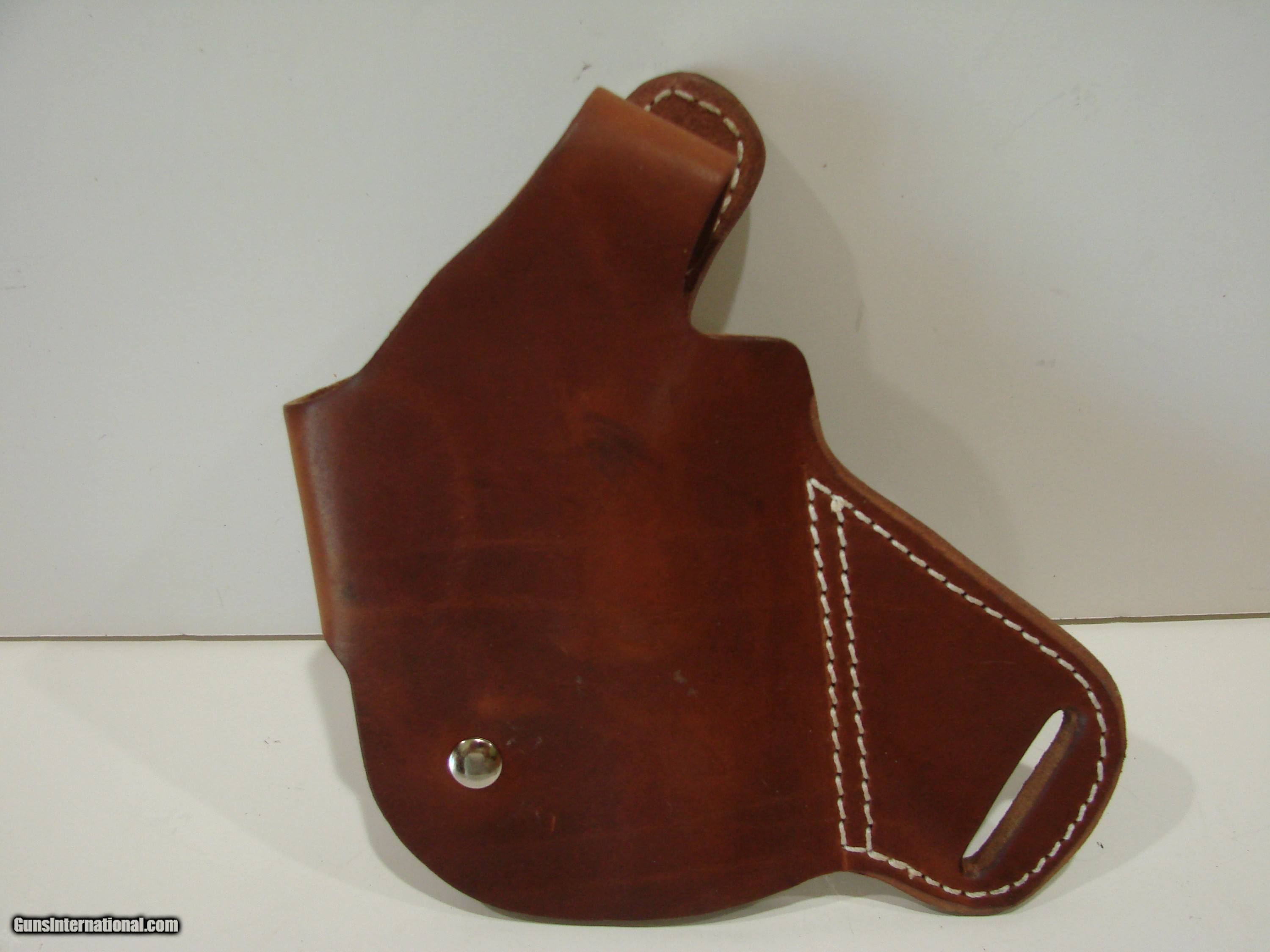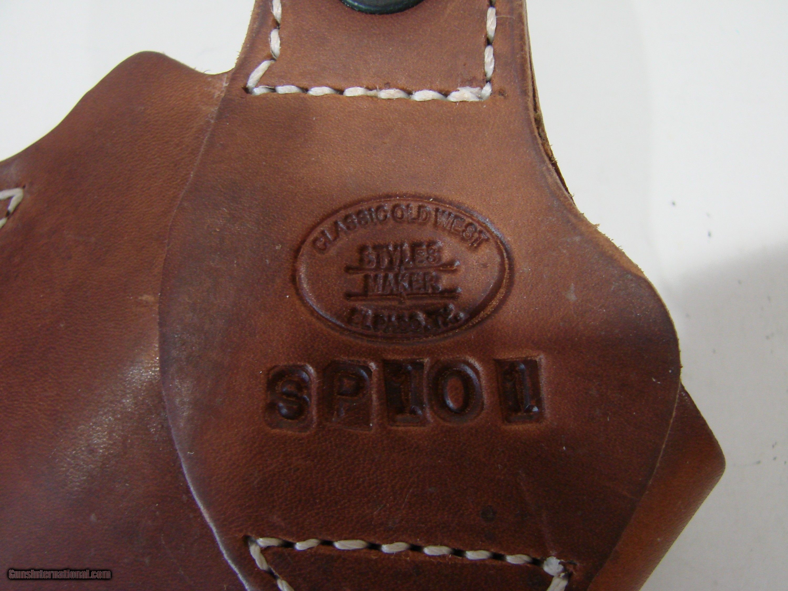 Description: This is a cross draw type leather holster for a Ruger SP 101 or similar revolver. Made by Classic Old West Style maker of El Paso. This is a outside waist band holster for a right handed person to wear on the left side and cross draw. Very handy for sitting or driving or any seated position. Custom fit for revolver and very snug retention with a thumb break strap and snap. Leather is still soft and pliable and in very good condition. Stitching is very good. I only used this a few times when traveling. phone 928-581-6325 or email Please leave a message if I don't answer Shipping included in USA SOLD |