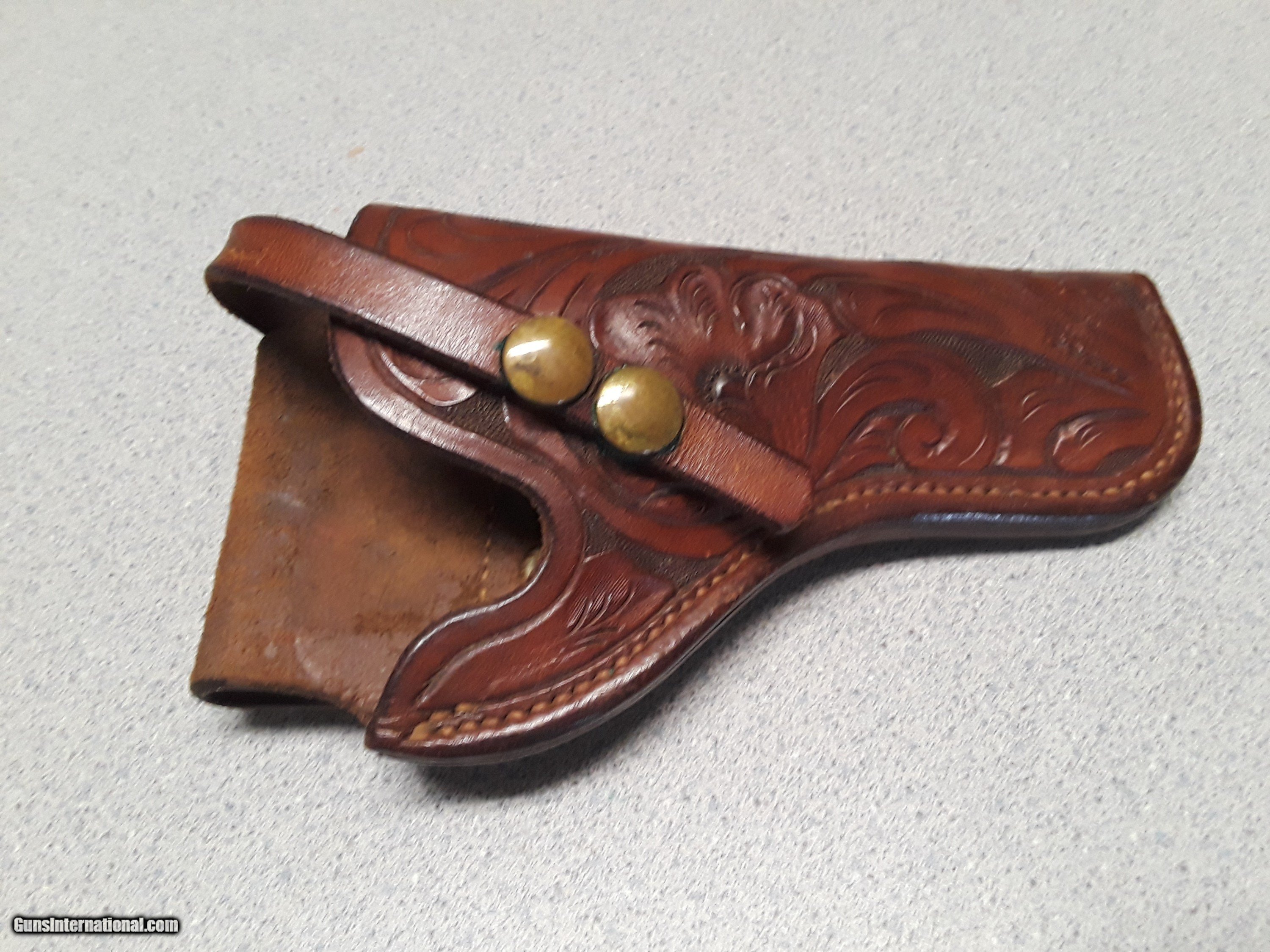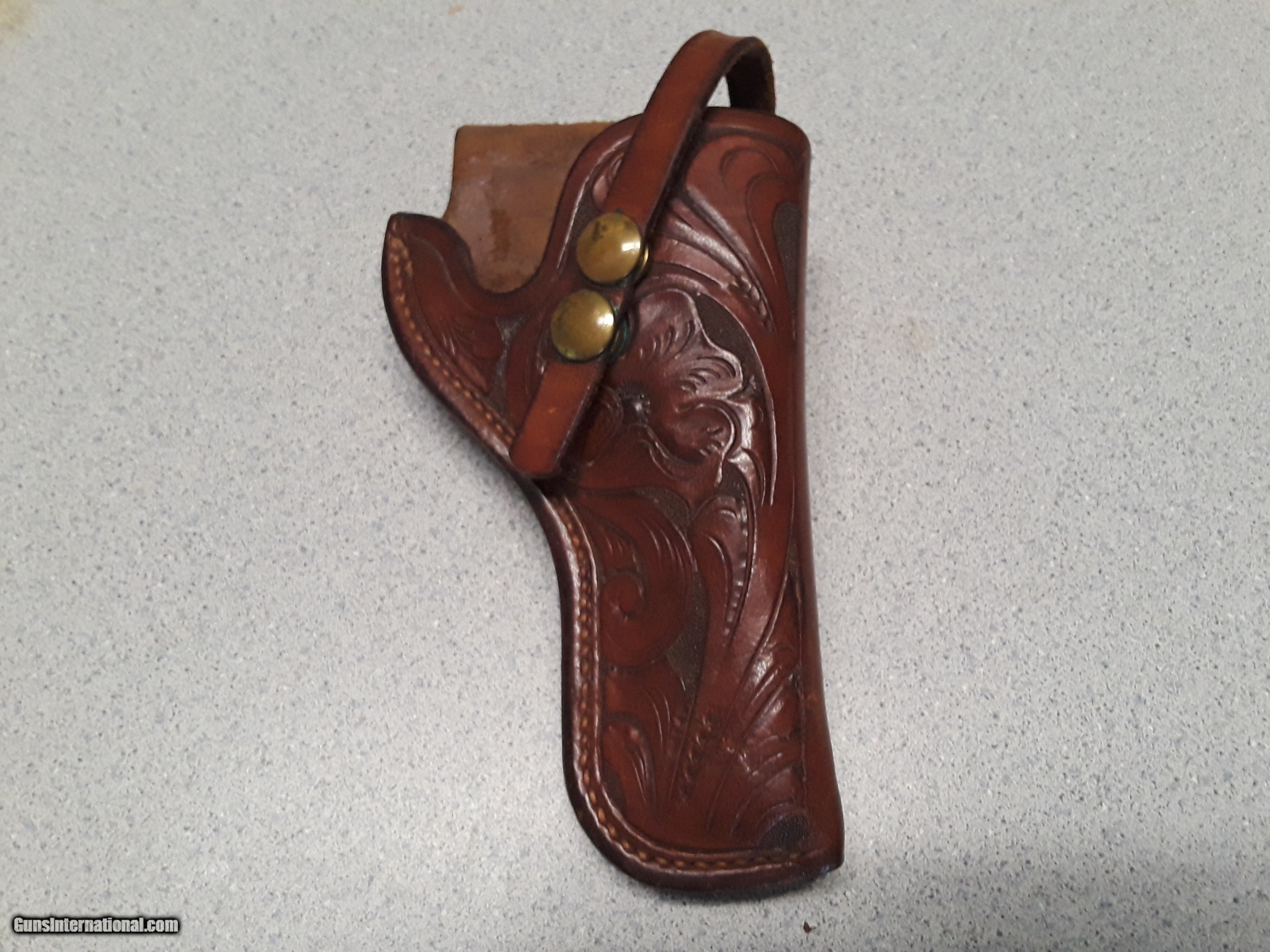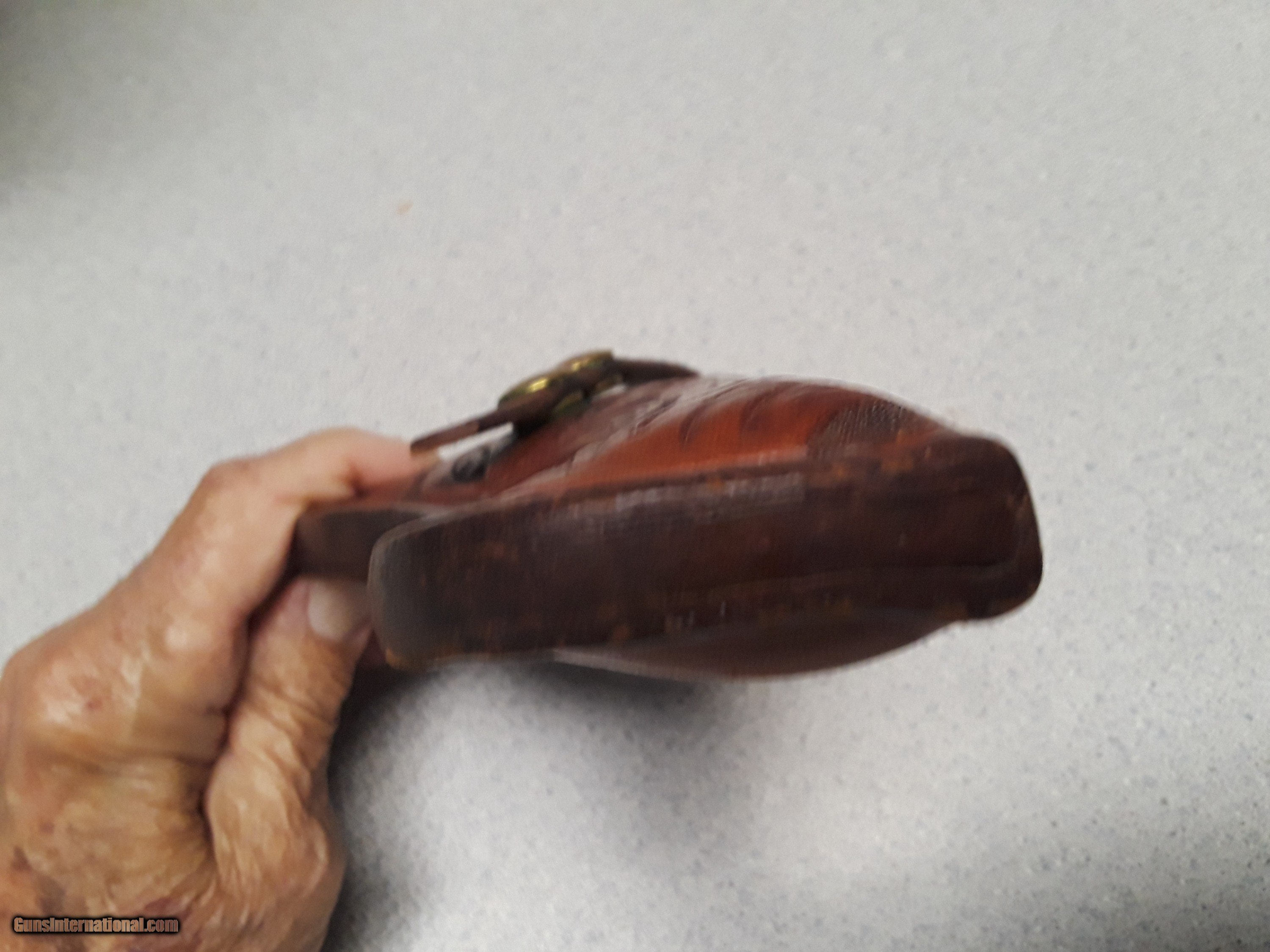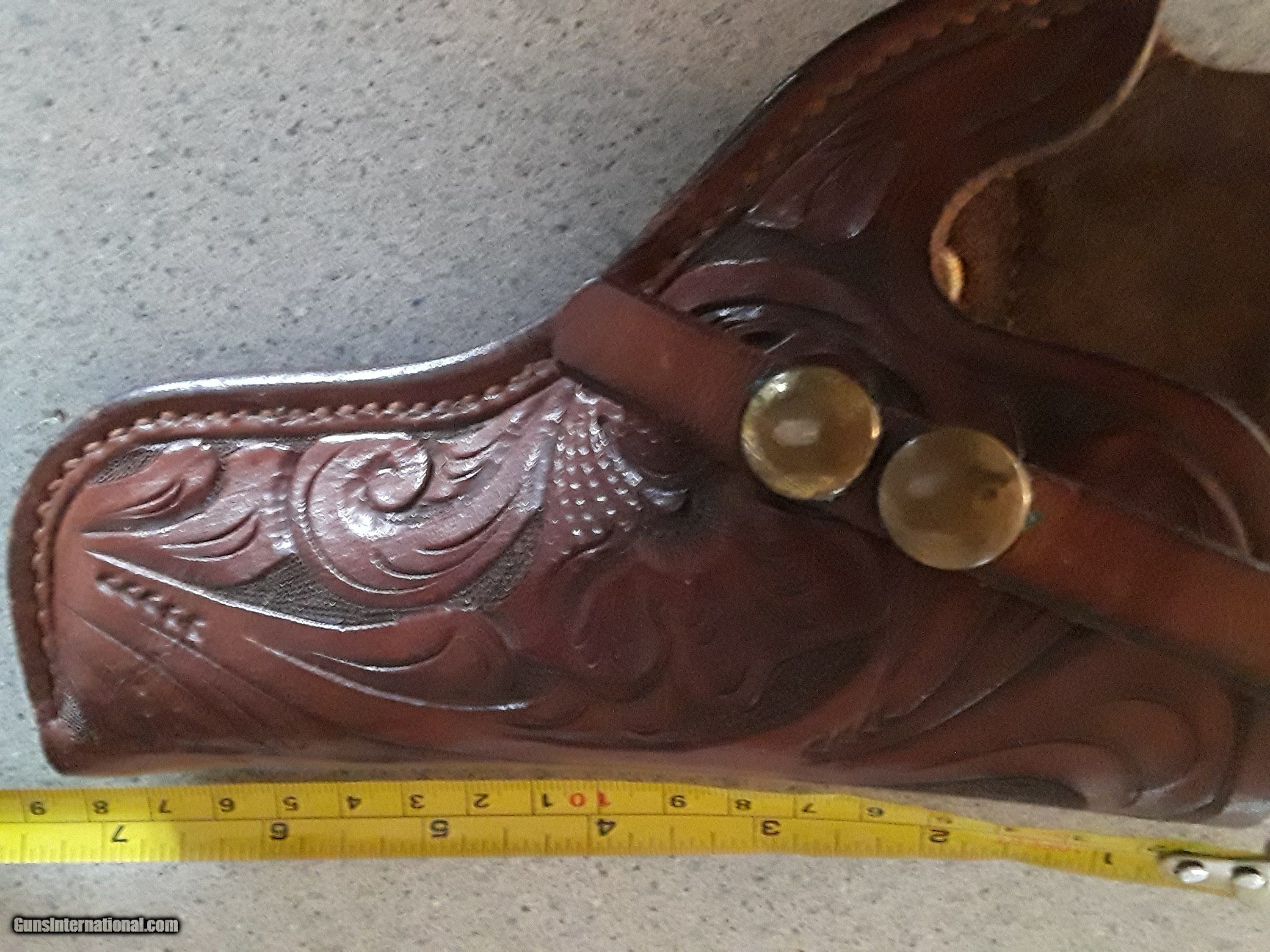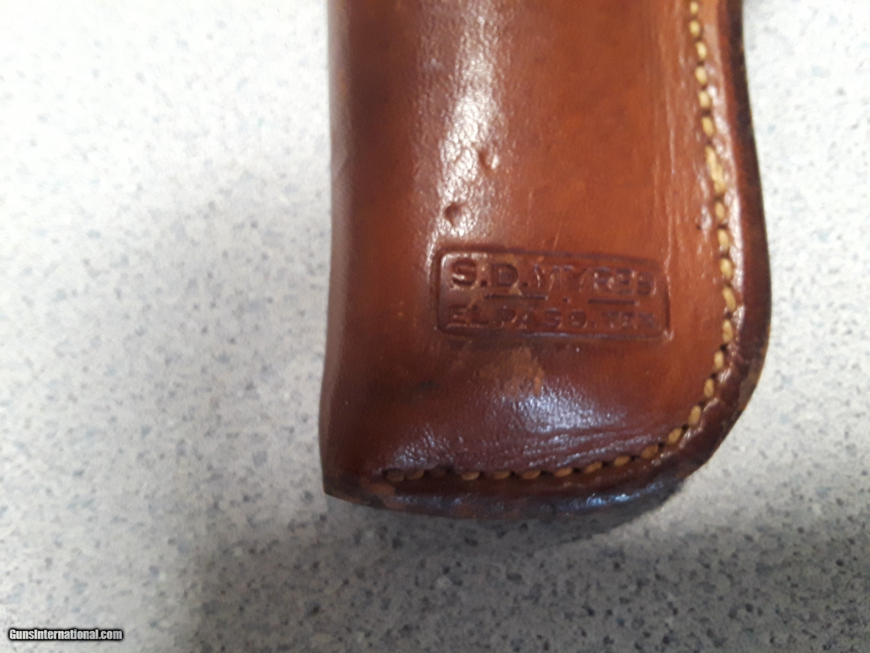 Description: The item for sale is a S.D. Myers Floral Carved Holster. The holster is marked S.D. Myres El. Paso Tex and is in beautiful condition. The leather and seams are in excellent condition as shown in the photos. We have not treated the leather as we believe that should be the buyer's choice. However, we recommend Black Rock. Please include $20 for shipping and insurance. The item will be shipped via USPS Priority Mail fully insured. (Photo taken with S&W Model 36) SOLD |