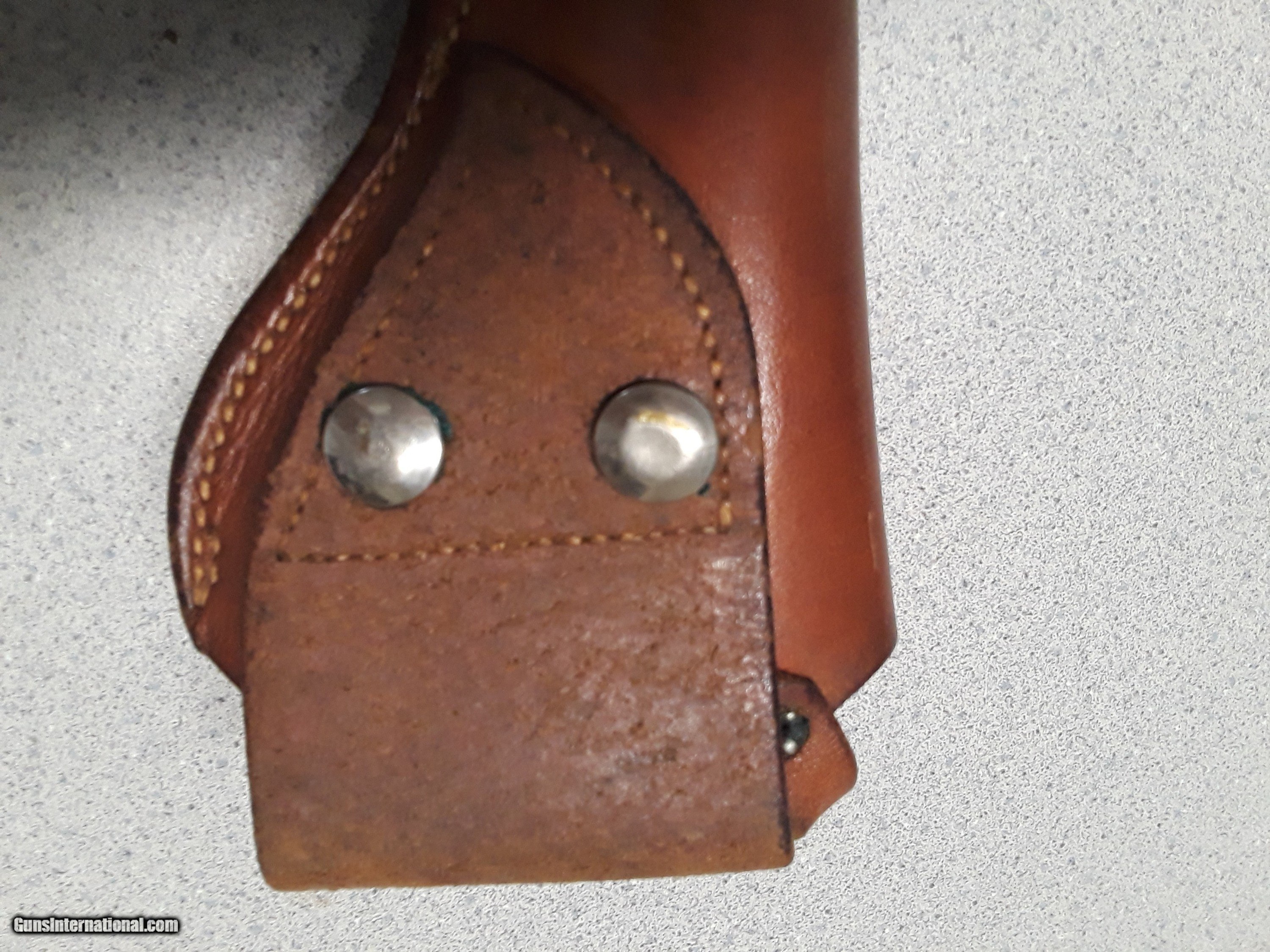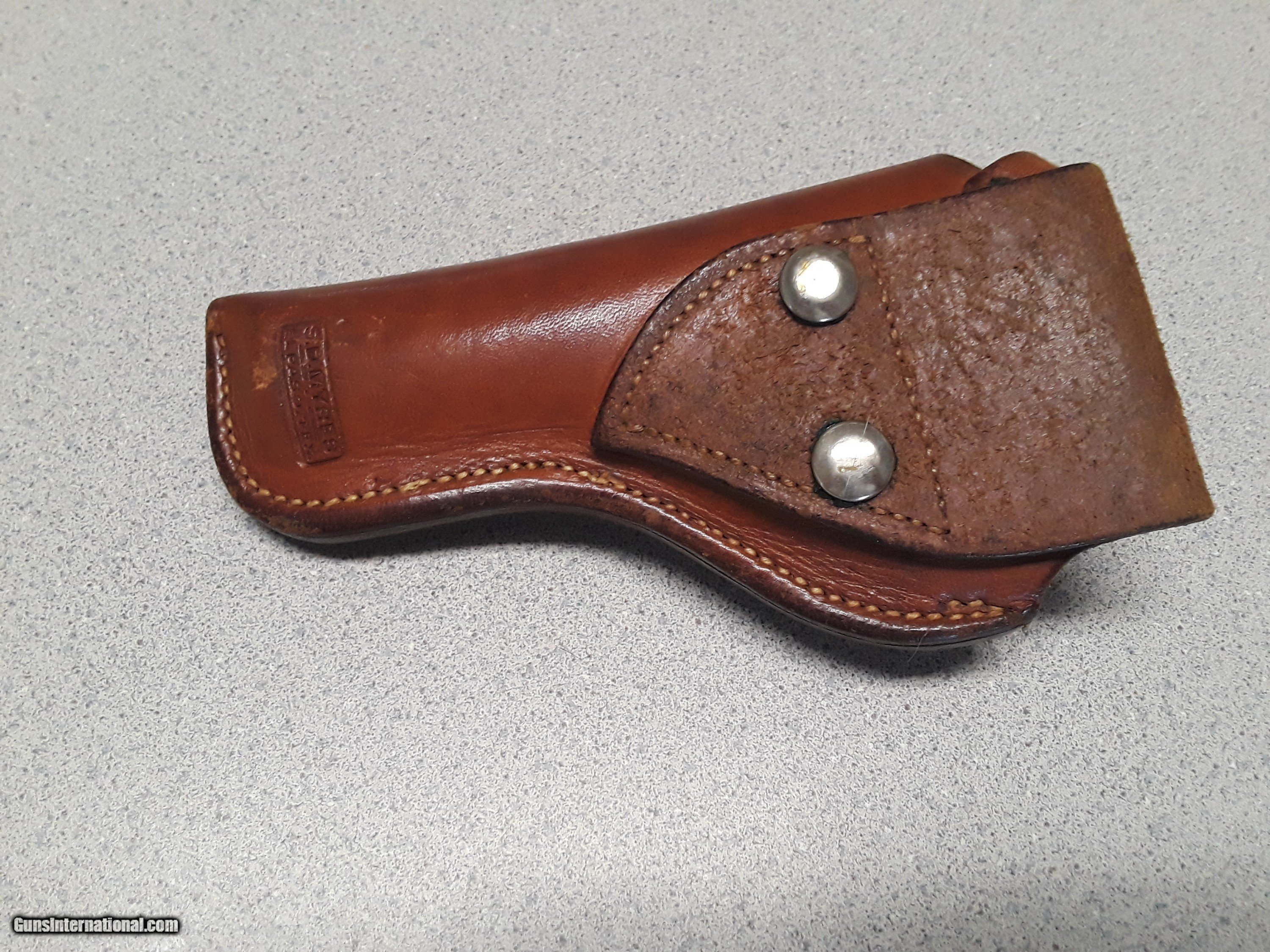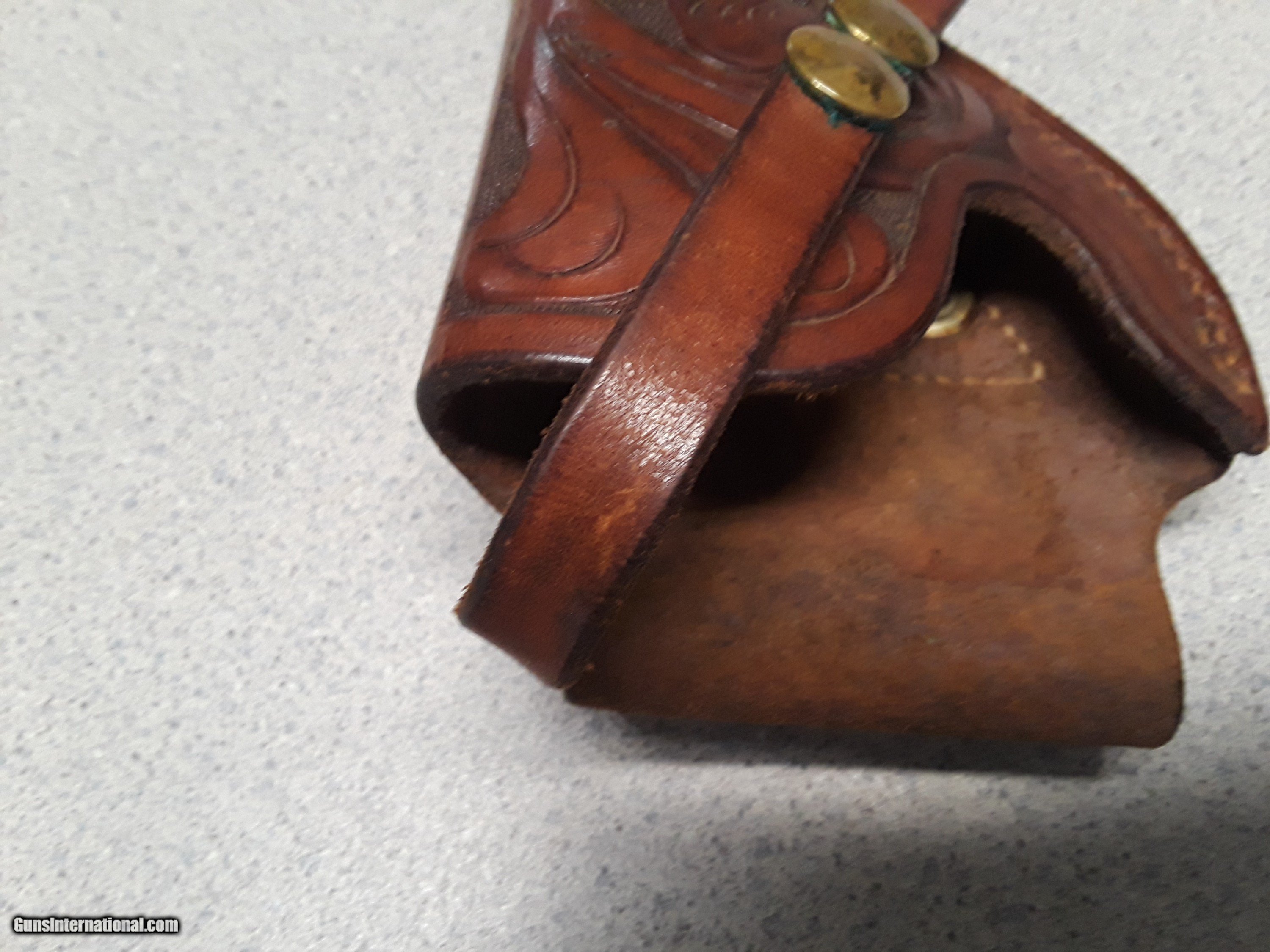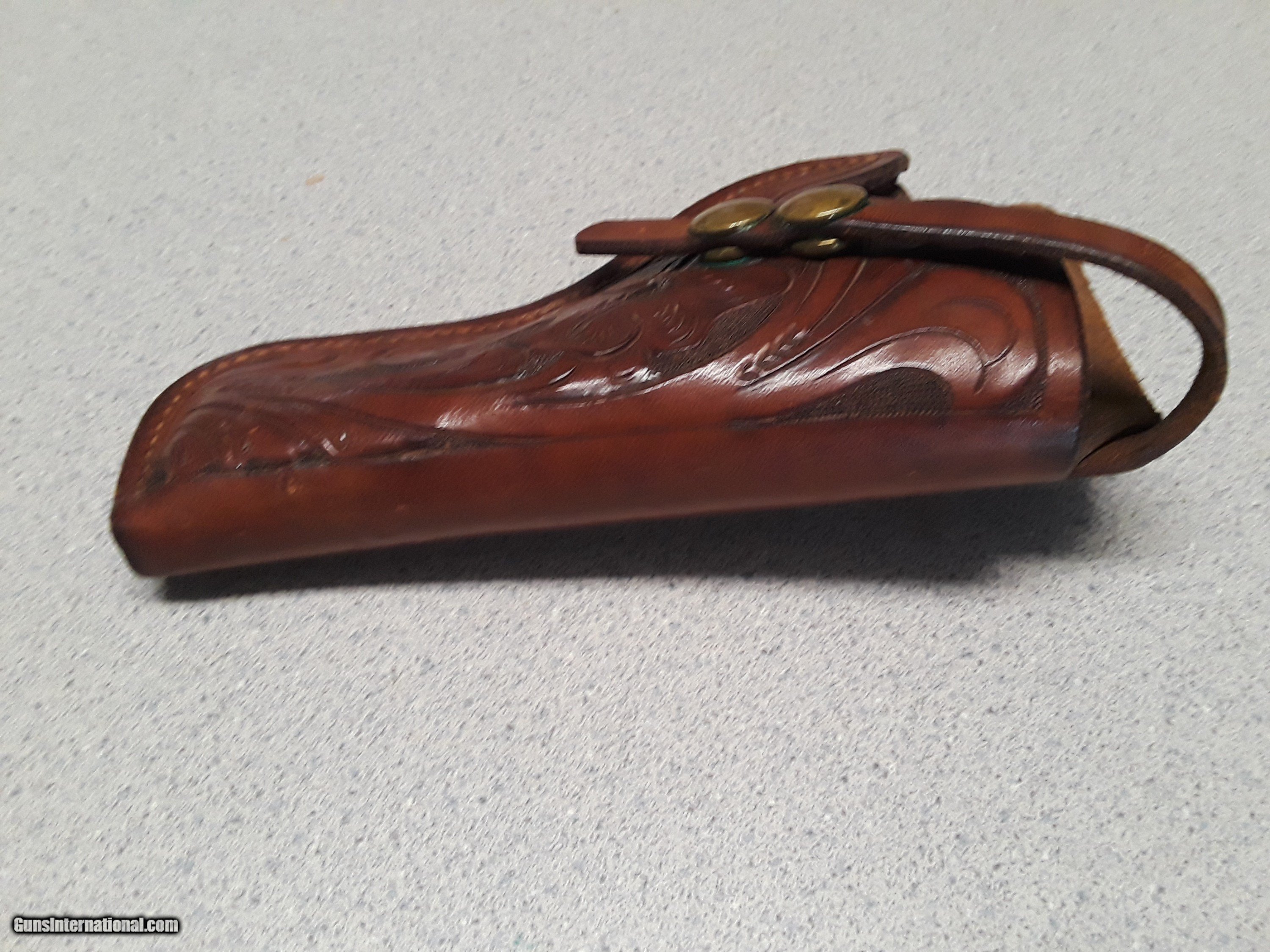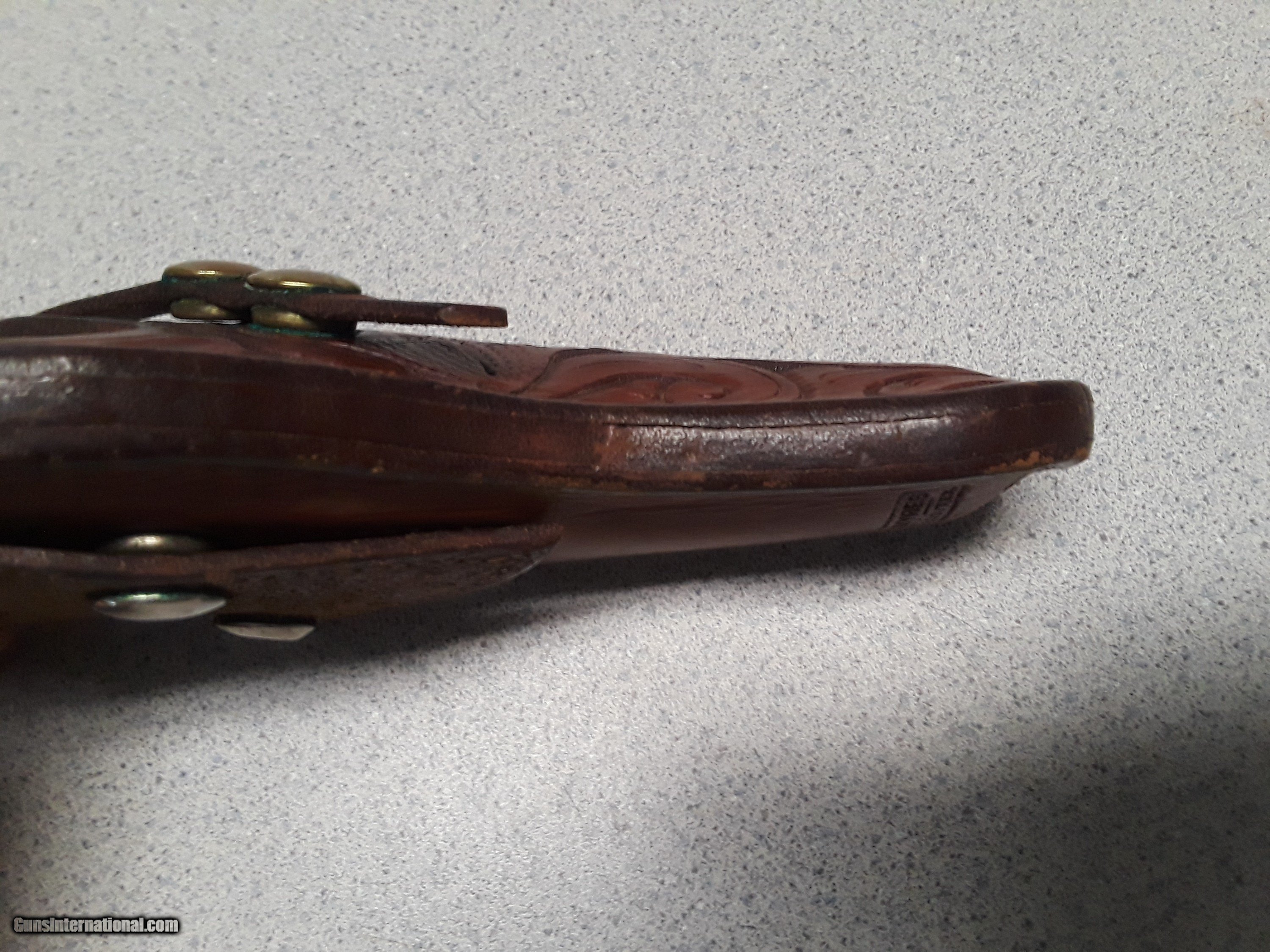 Description: The item for sale is a S.D. Myers Floral Carved Holster. The holster is marked S.D. Myres El. Paso Tex and is in beautiful condition. The leather and seams are in excellent condition as shown in the photos. We have not treated the leather as we believe that should be the buyer's choice. However, we recommend Black Rock. Please include $20 for shipping and insurance. The item will be shipped via USPS Priority Mail fully insured. (Photo taken with S&W Model 36) SOLD |