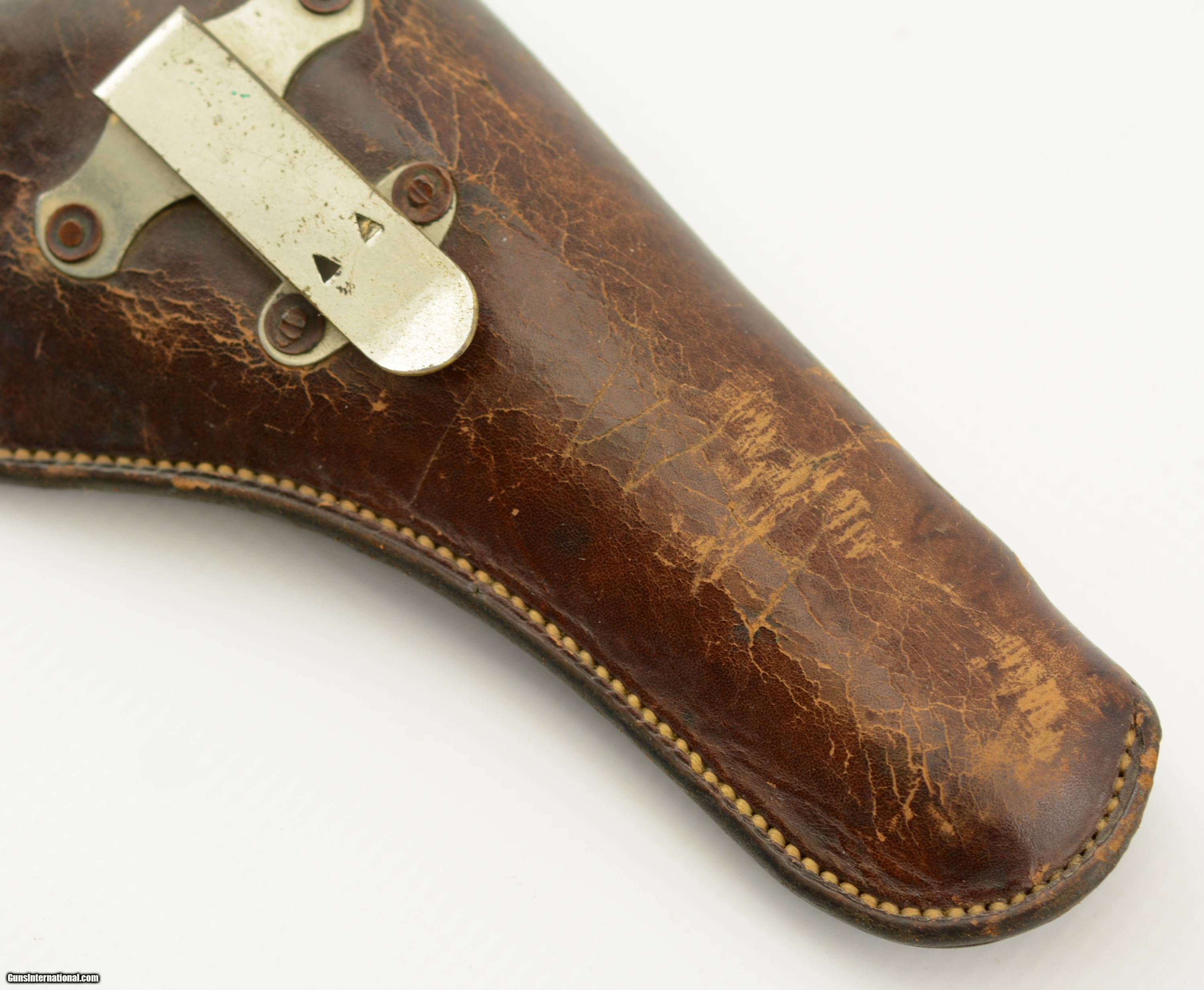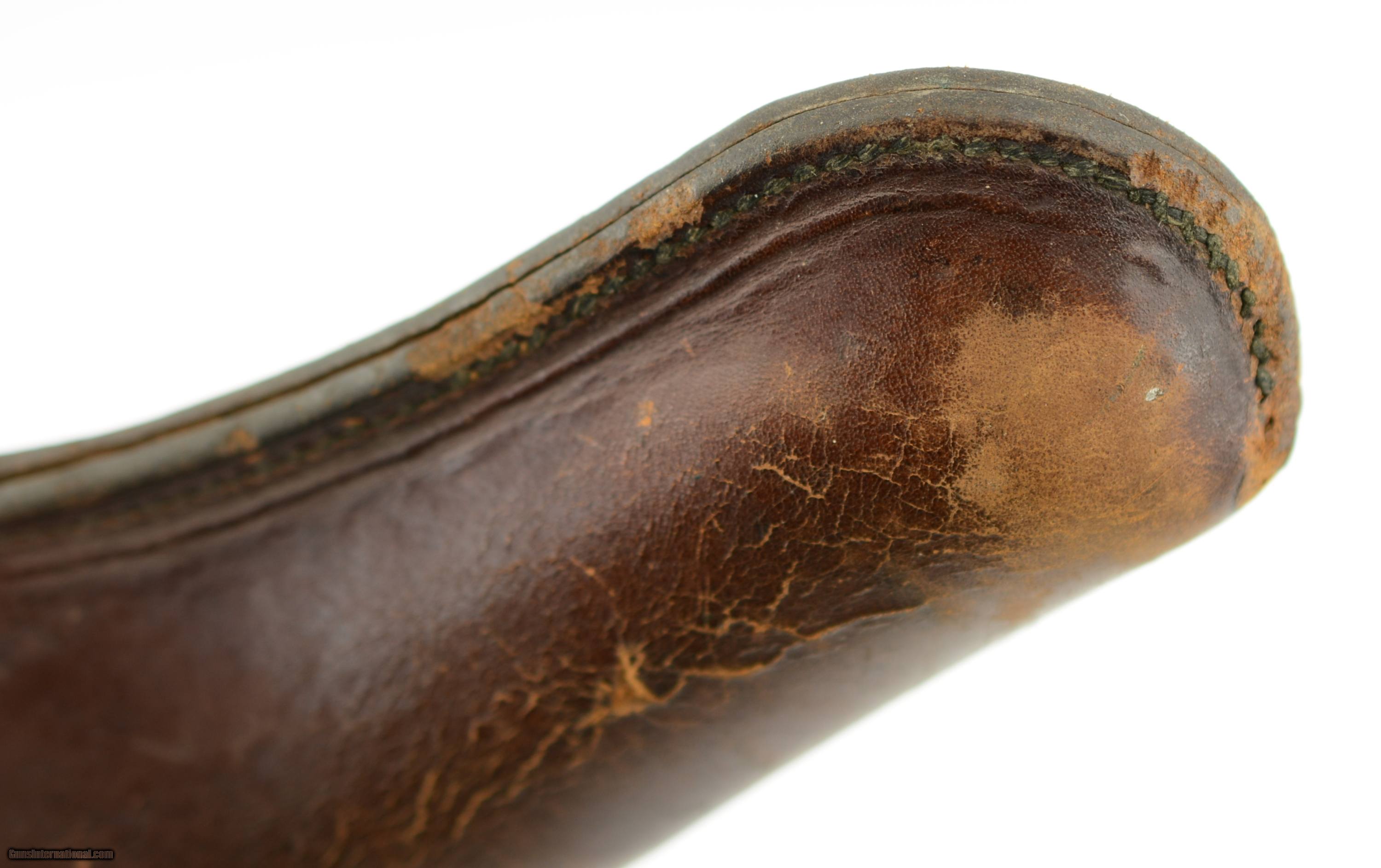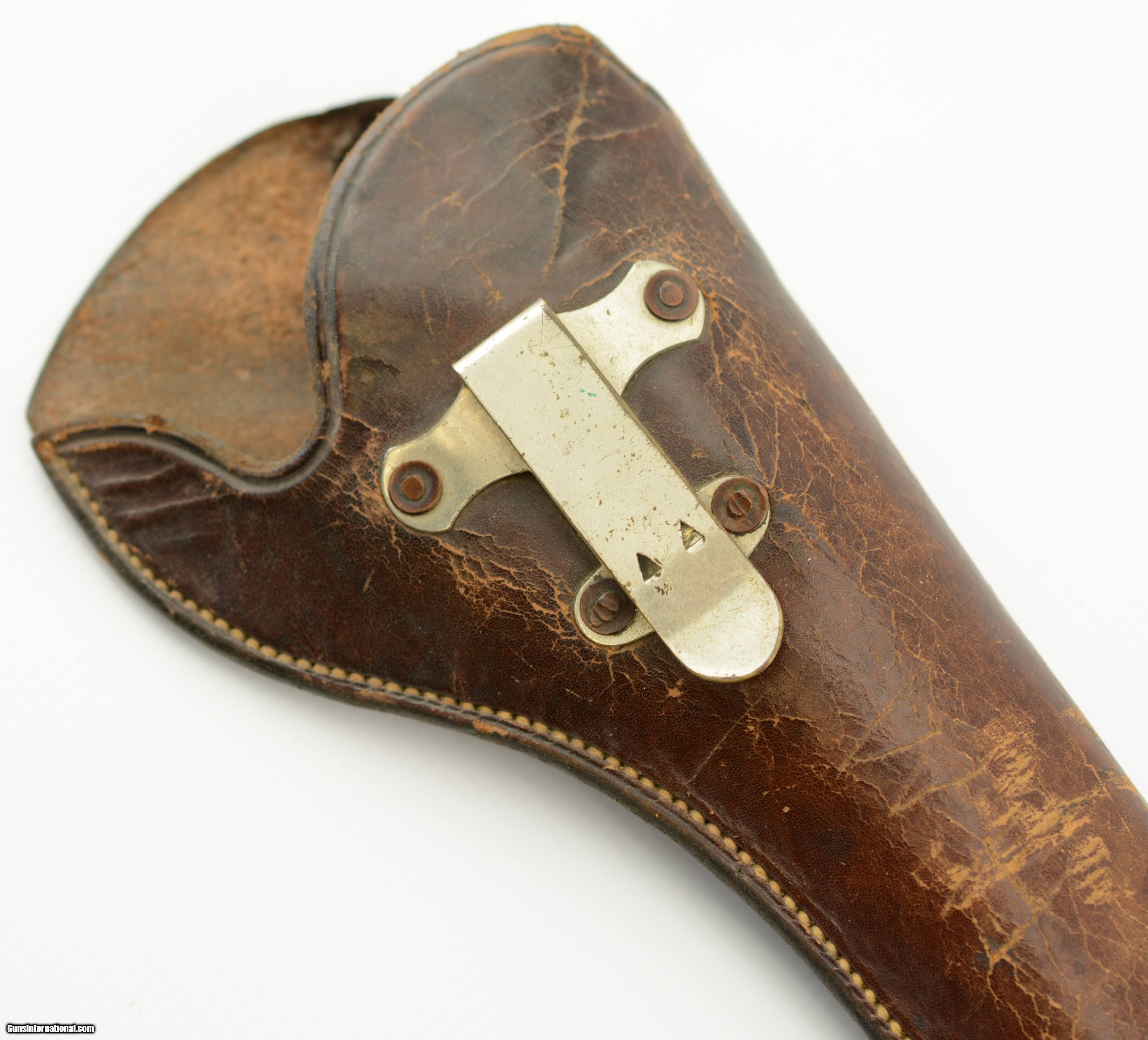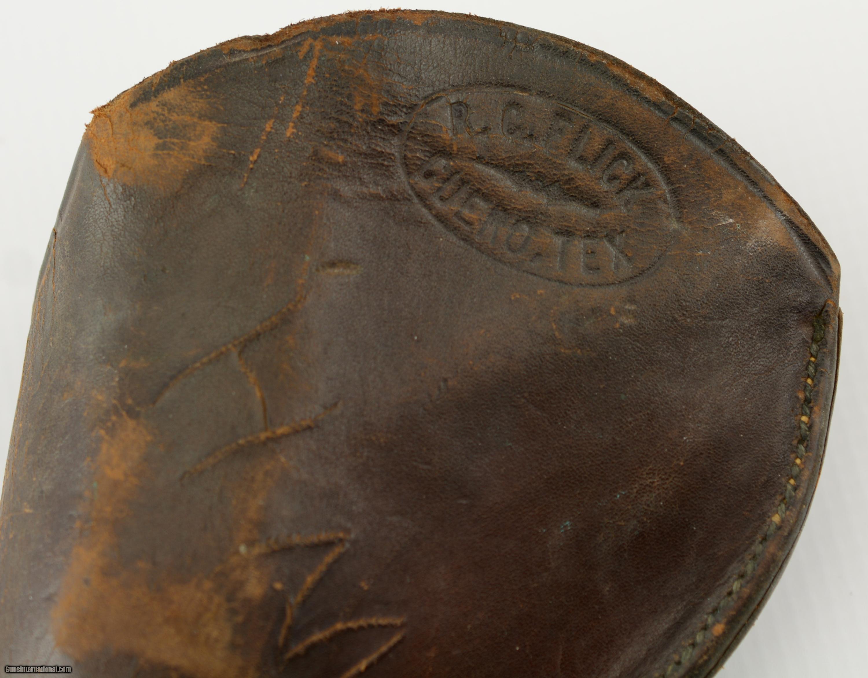 Description: This is a nice piece of American West history; an original RC Flick Cuero Texas marked inside the pants holster. Holster is 8 3/4" in length x 4 1/4" at its widest part. Should hold a 4" or perhaps 5" revolver. A previous owner scratched his initials "HM" or "WH" and the leather shows scuffing, some flaking, crackling and crazing. The stitching remains tight and the clip to secure the holster to the pants is securely attached. A fine looking Texas holster. SOLD Manufacturer: Flick Model: Holster |