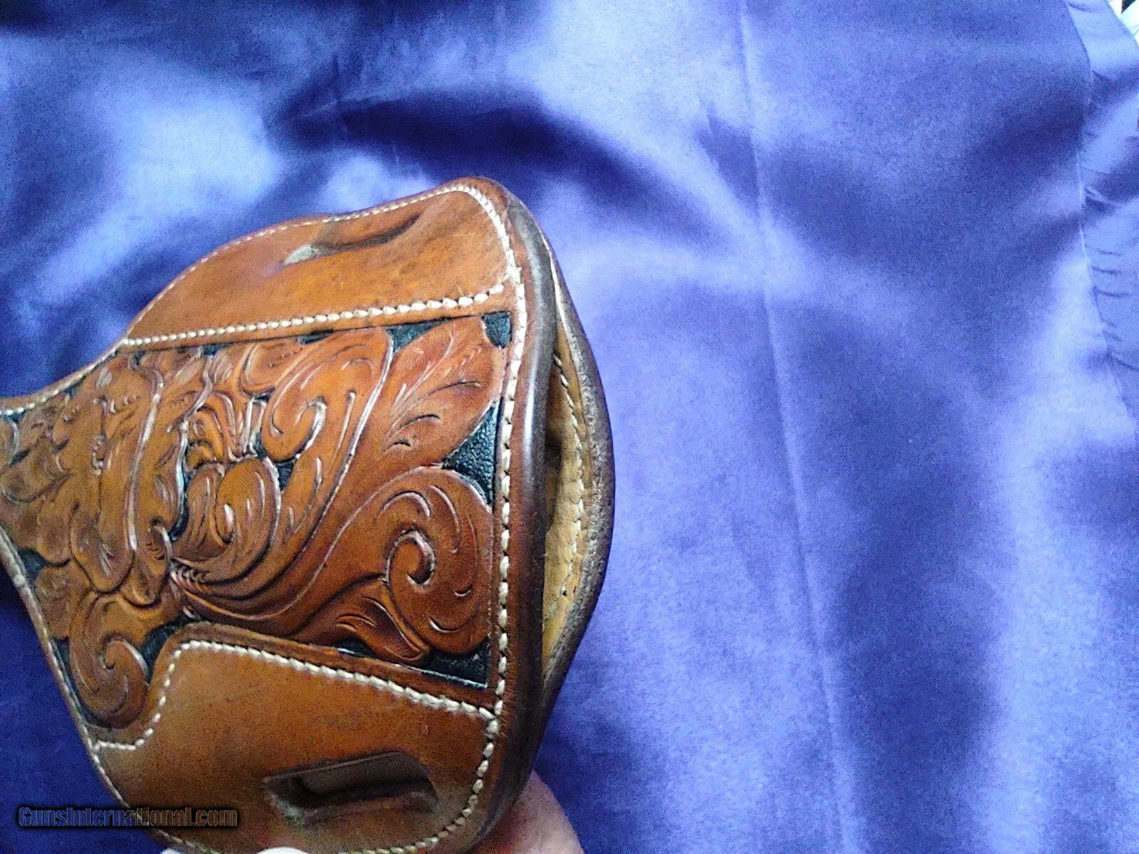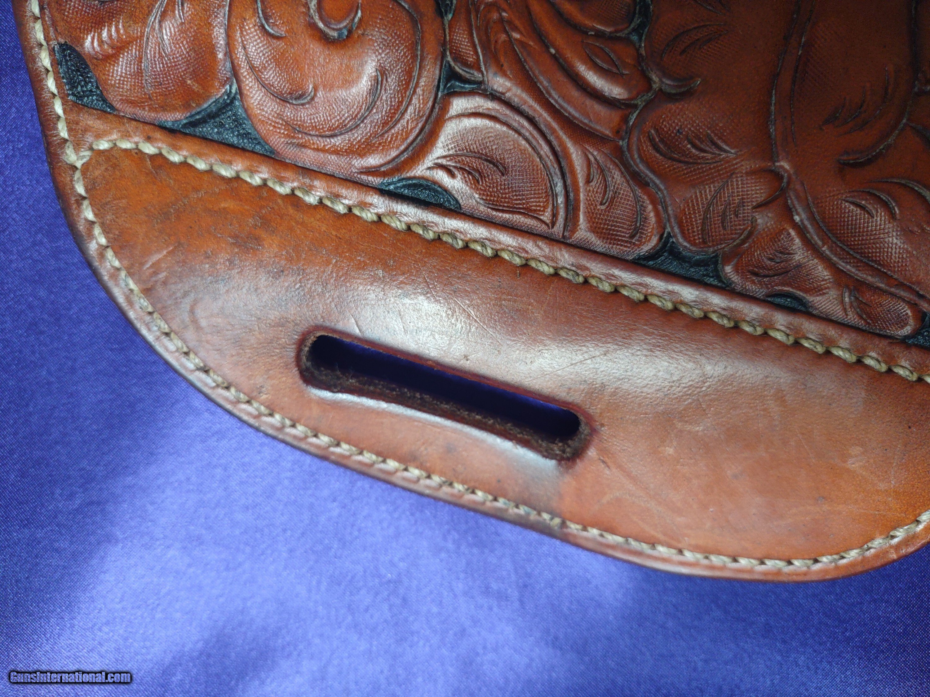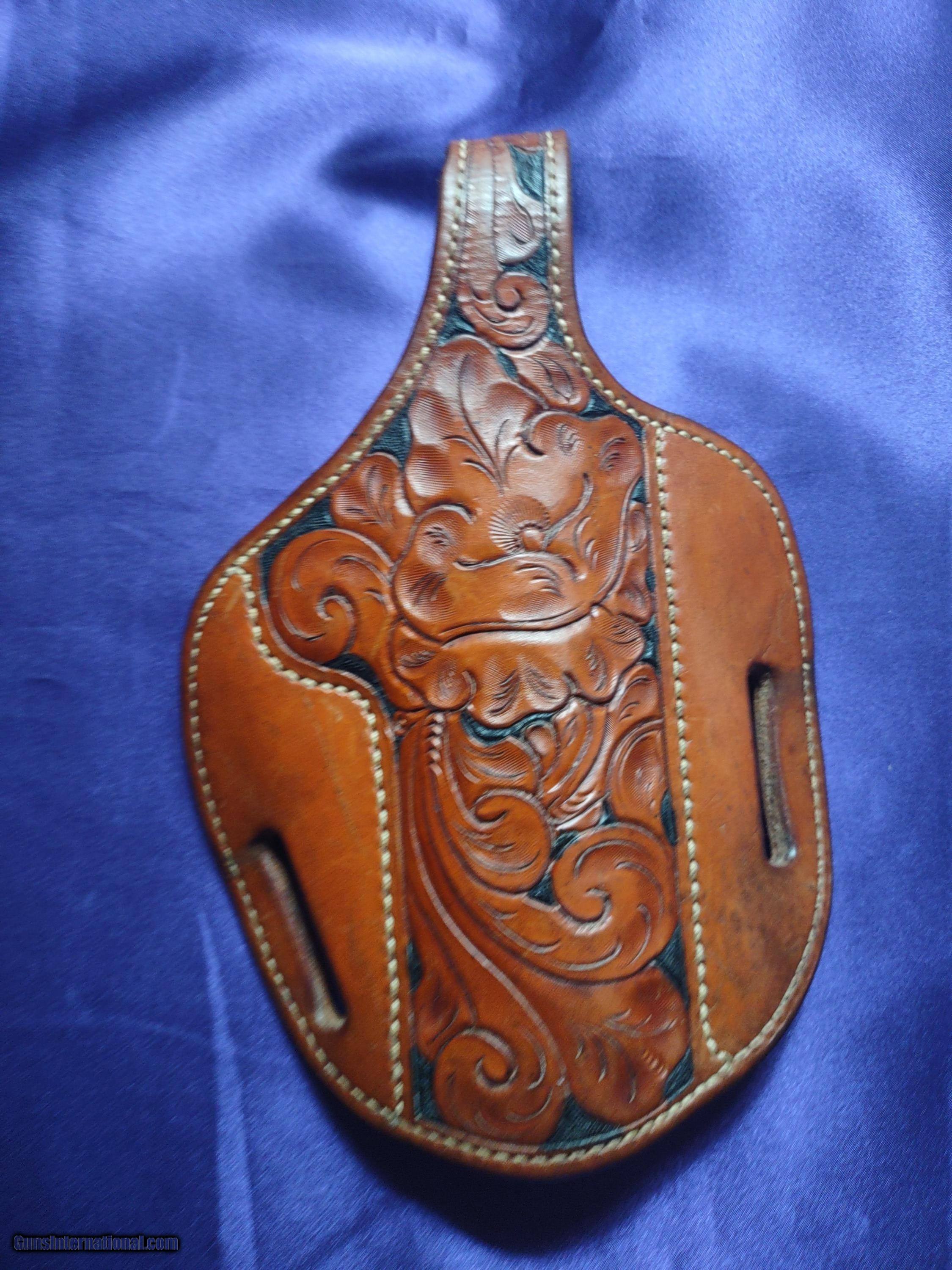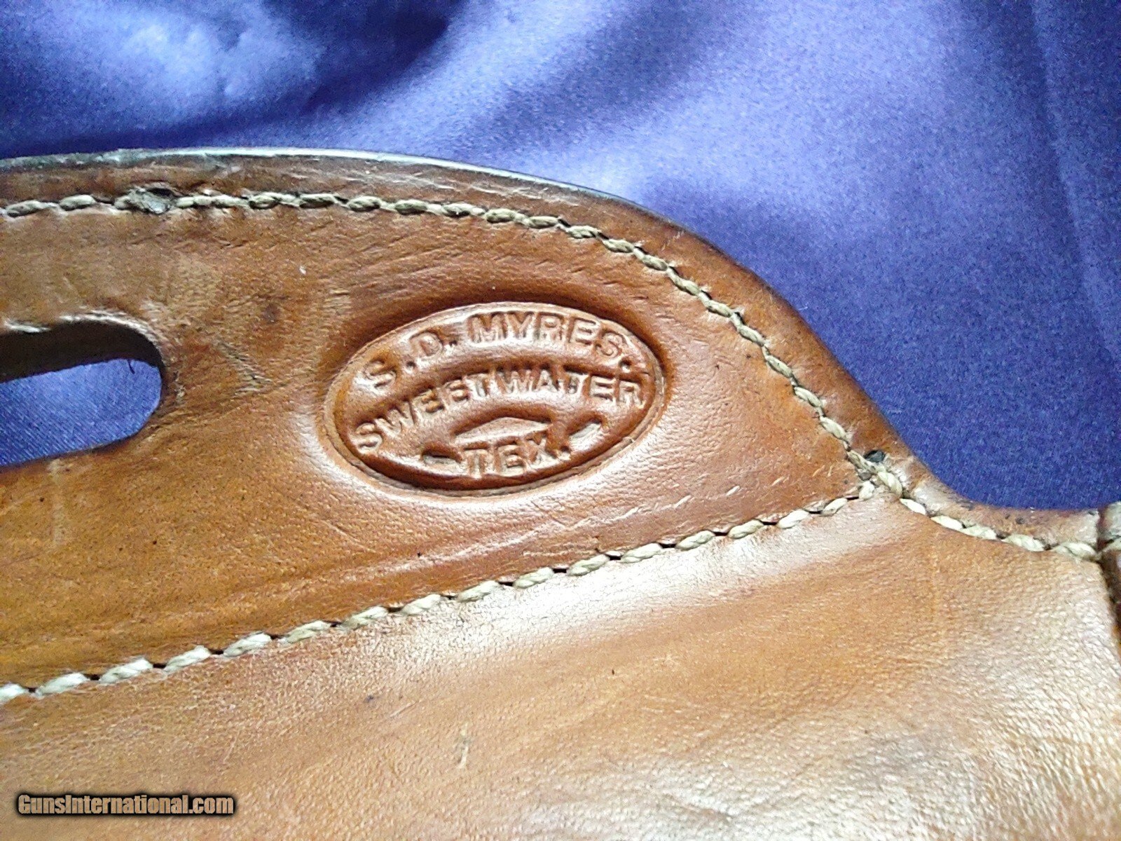 Description: SD MYRES SADDLE COMPANY tooled leather belt holster for a 1911 semi-automatic pistol with 5'" barrel made in or before 1920 in Sweetwater, Texas. Samuel Dale (SD) Myres was born in Cleburn, Texas in 1871 and founded SD Myres Saddle Company in 1898 in Sweetwater, Texas where he later became mayor and in 1920 moved to El Paso, Texas where he operated until he died in 1953 at the age of 82. The business continued to operate until 1969 when it closed. Over their 71 years of designing and marketing fine leather goods, Myres became known as the best saddlery in America and had a long list of famous clients including Ronald Reagan, Will Rogers, Pancho Villa, Tom Mix, Gene Autry, Ken Maynard and Monte Montana, just to name a few. This masterpiece is in remarkable condition with sensational hand tooling, 100% original threading, goat skin lining, steel double rivits/snaps and high quality natural leather with NO varnish. None any better! The price is $550 including free shipping to your home or workplace. Call or text me at 318-780-4242 if you are interested. Price: $550.00 Contact Seller |