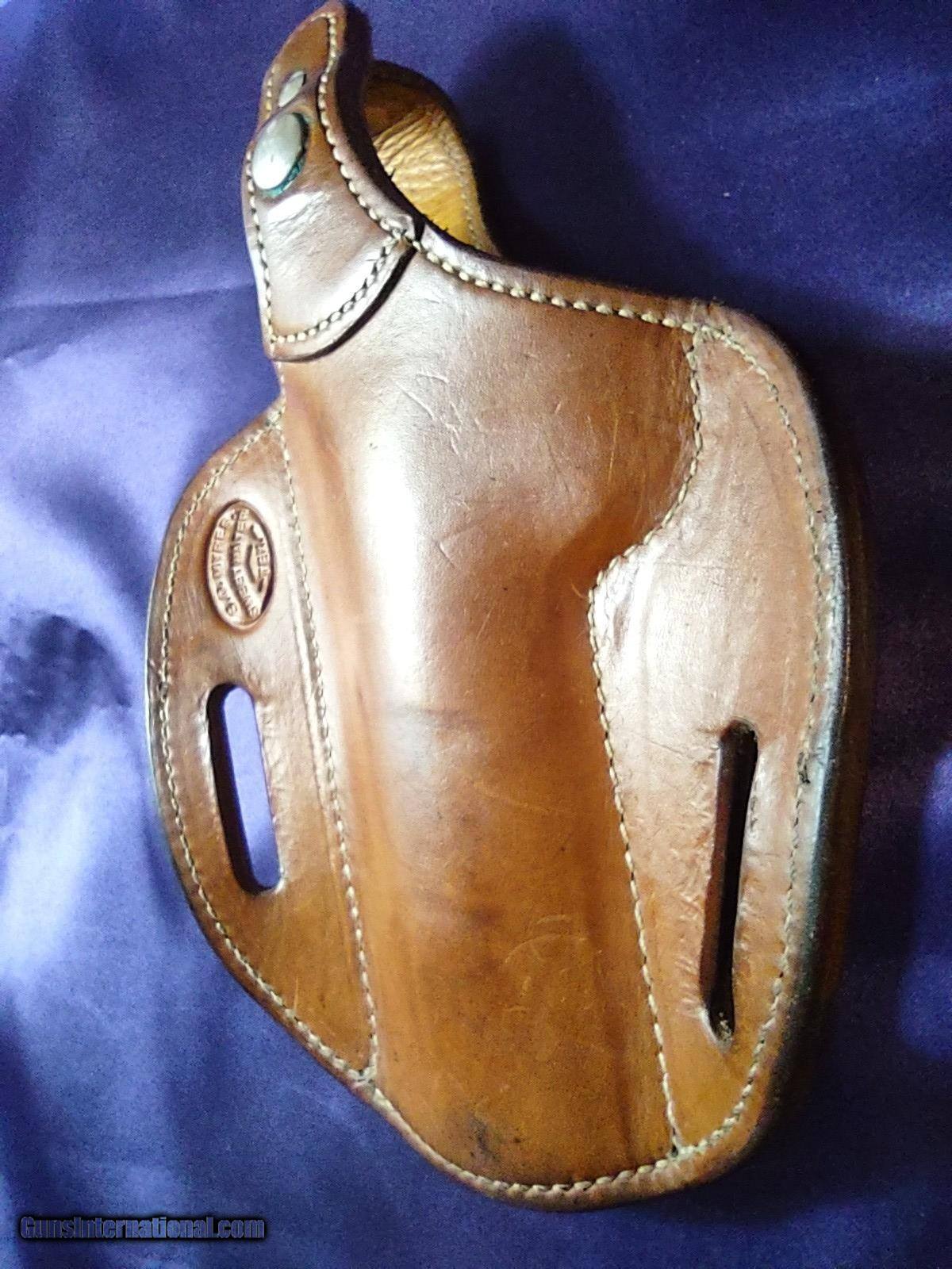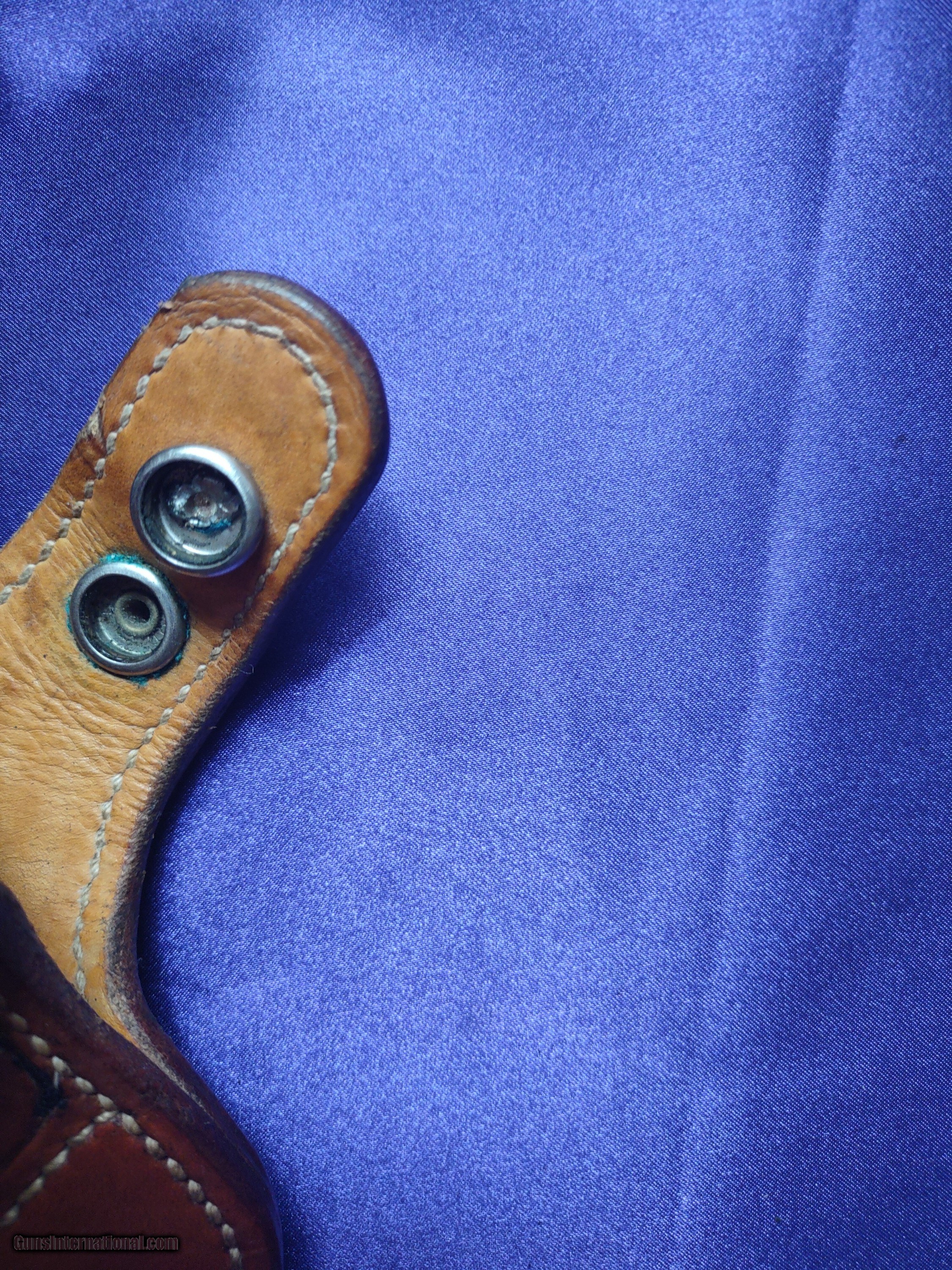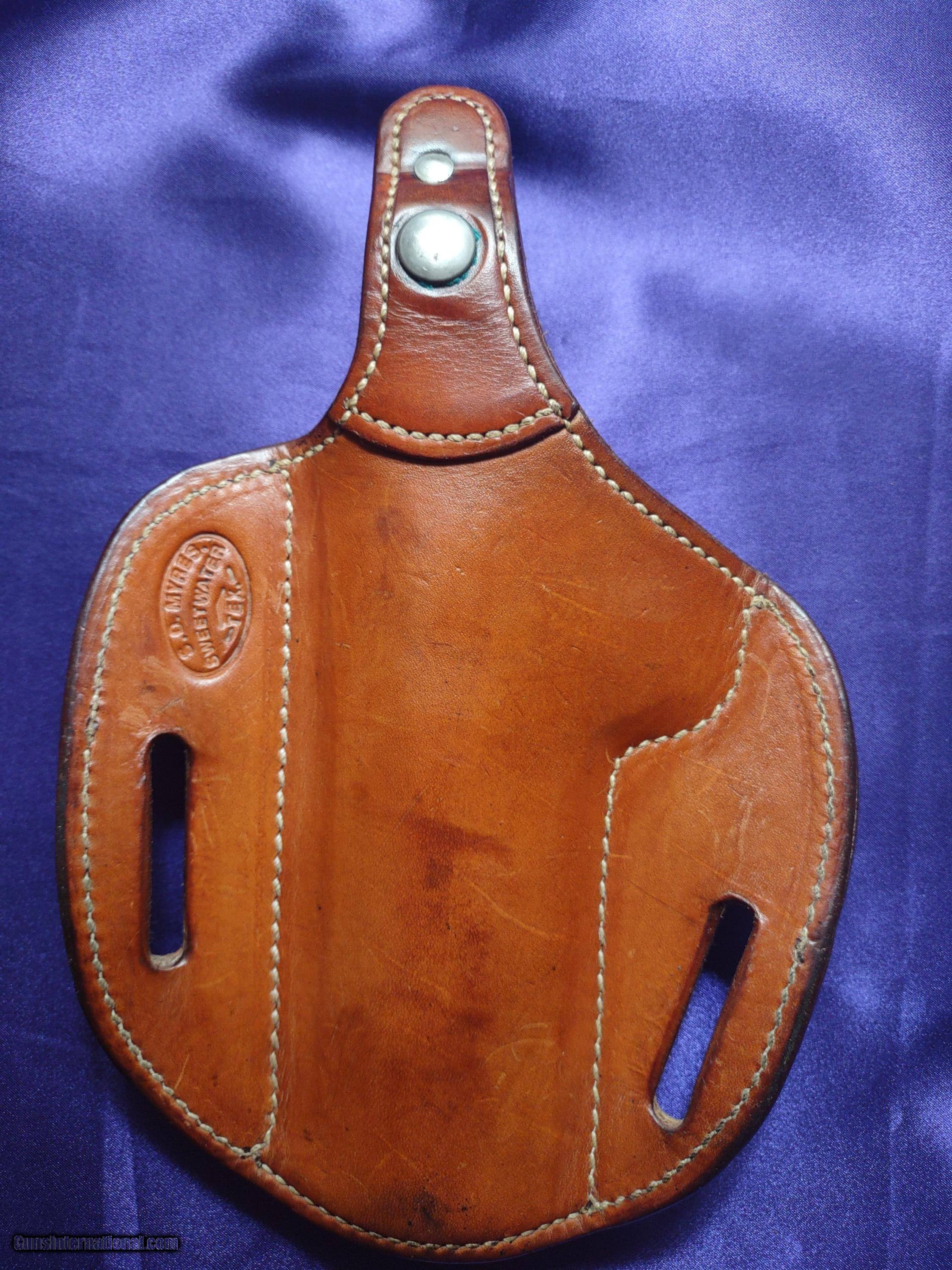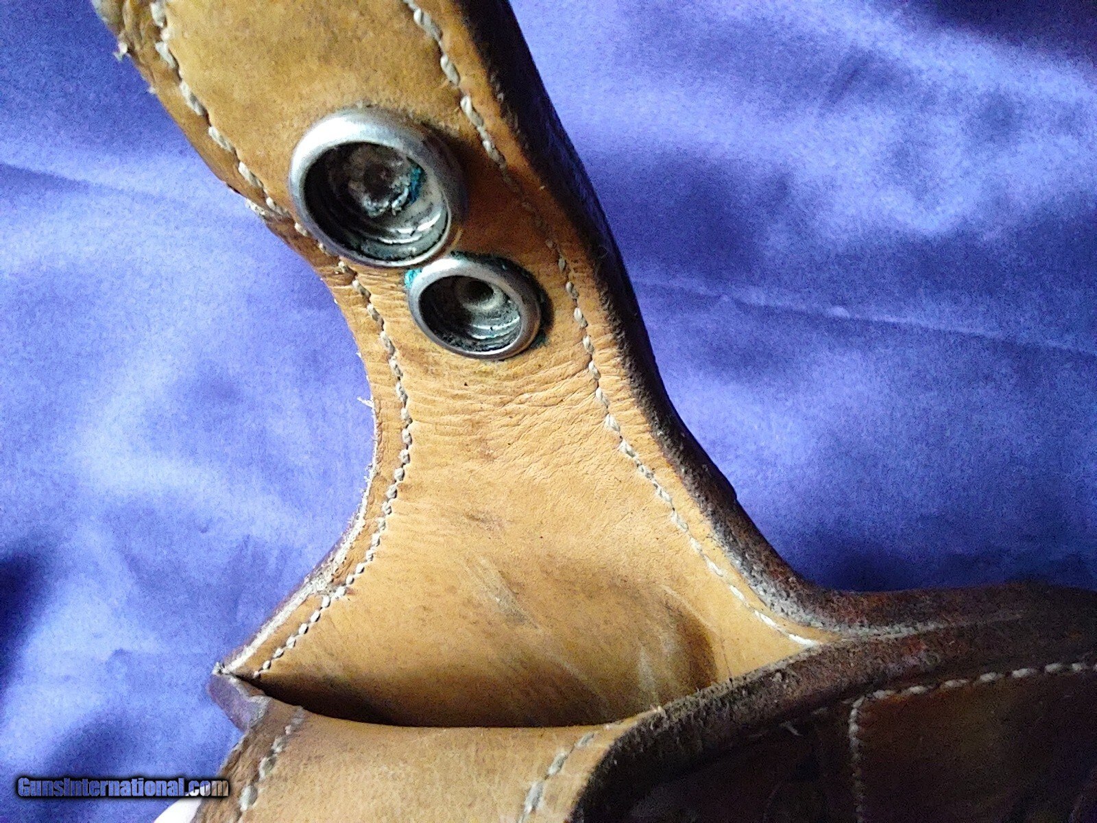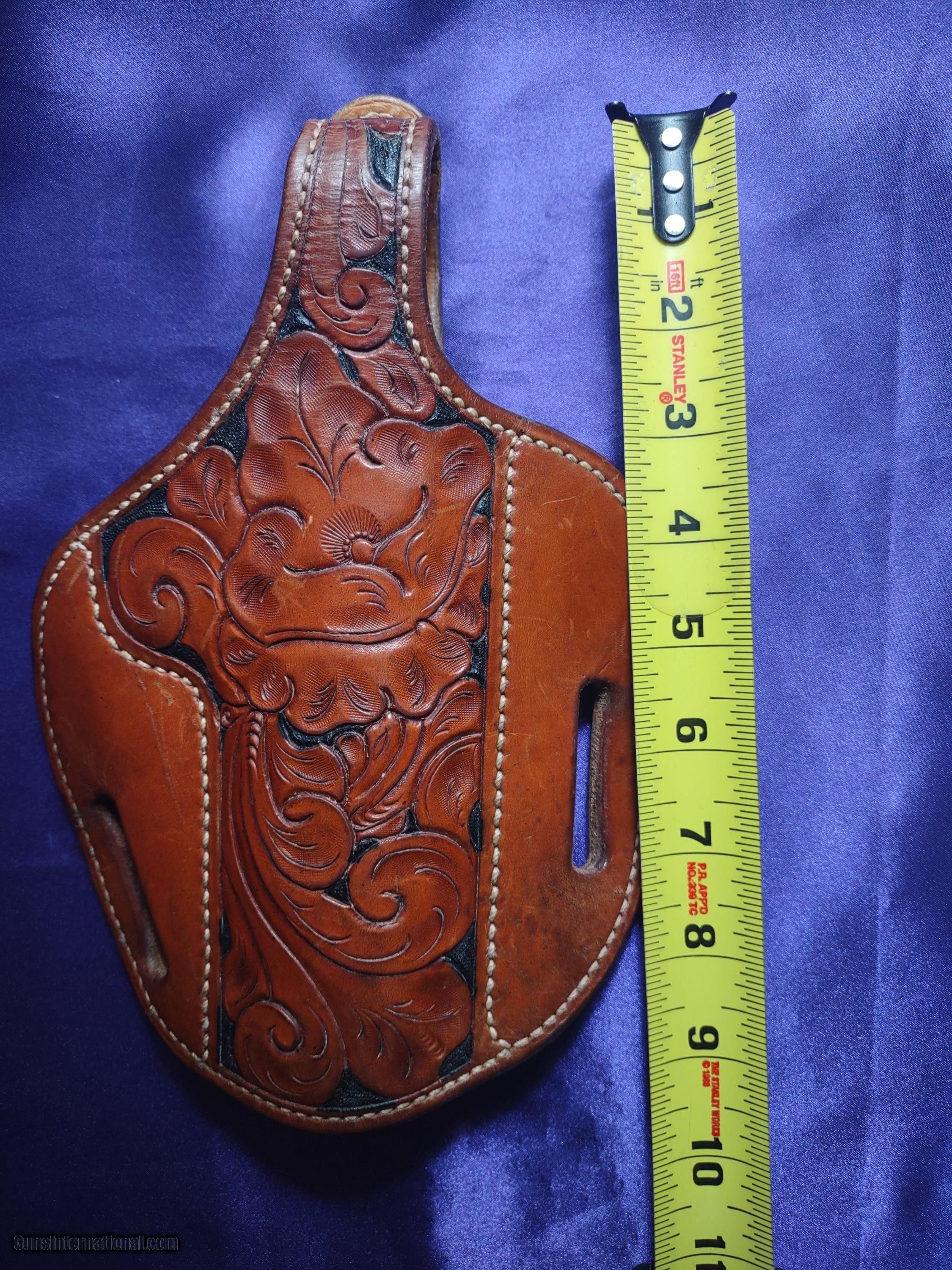 Description: SD MYRES SADDLE COMPANY tooled leather belt holster for a 1911 semi-automatic pistol with 5'" barrel made in or before 1920 in Sweetwater, Texas. Samuel Dale (SD) Myres was born in Cleburn, Texas in 1871 and founded SD Myres Saddle Company in 1898 in Sweetwater, Texas where he later became mayor and in 1920 moved to El Paso, Texas where he operated until he died in 1953 at the age of 82. The business continued to operate until 1969 when it closed. Over their 71 years of designing and marketing fine leather goods, Myres became known as the best saddlery in America and had a long list of famous clients including Ronald Reagan, Will Rogers, Pancho Villa, Tom Mix, Gene Autry, Ken Maynard and Monte Montana, just to name a few. This masterpiece is in remarkable condition with sensational hand tooling, 100% original threading, goat skin lining, steel double rivits/snaps and high quality natural leather with NO varnish. None any better! The price is $550 including free shipping to your home or workplace. Call or text me at 318-780-4242 if you are interested. Price: $550.00 Contact Seller |