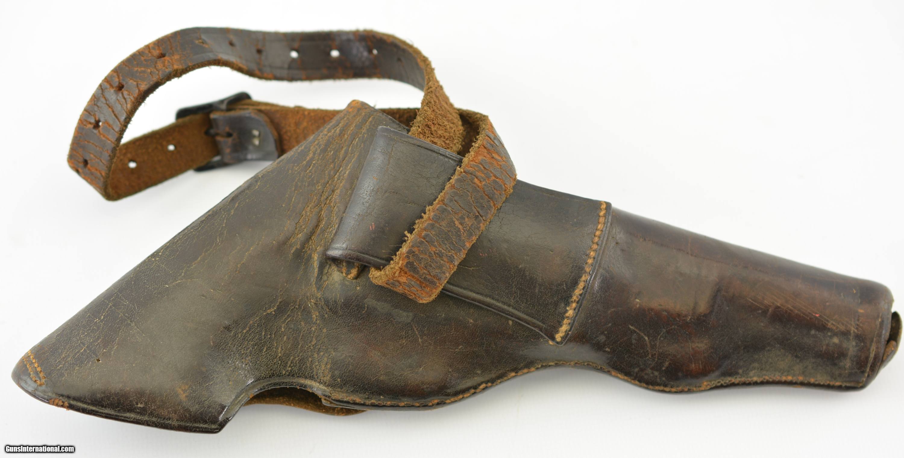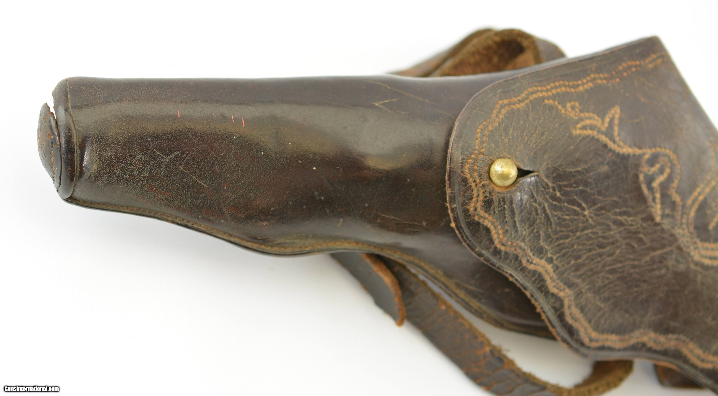 Description: This unmarked leather holster is for the Smith Wesson No 1 ½ SA revolver with a 3 1/2" barrel. Holster is 9 1/2" x 5" Designed for left hand or more likely “Butt Forward" carry; the holster also includes a small leather strap attached via buckle through the belt loop. There is a double row of stitching around the outside edges of the flap and more detailed stitching that resembles a crest or shield. The leather shows crackling and crazing on the flap and top edge while the body has a glossy sheen and some old scratches. The plug in the bottom has partially separated with about half the stitching missing. Holster has a great period “look" about it and should make a fine addition to your collection. SOLD Manufacturer: S&W Model: Holster |