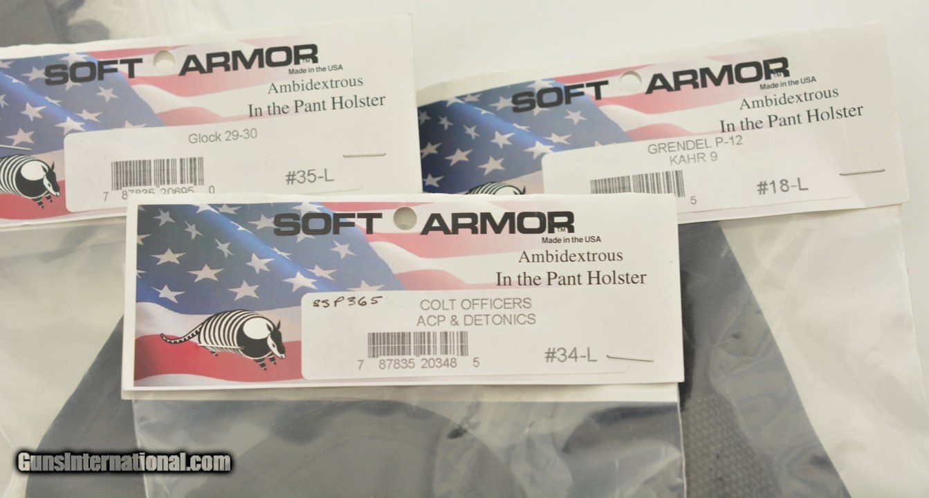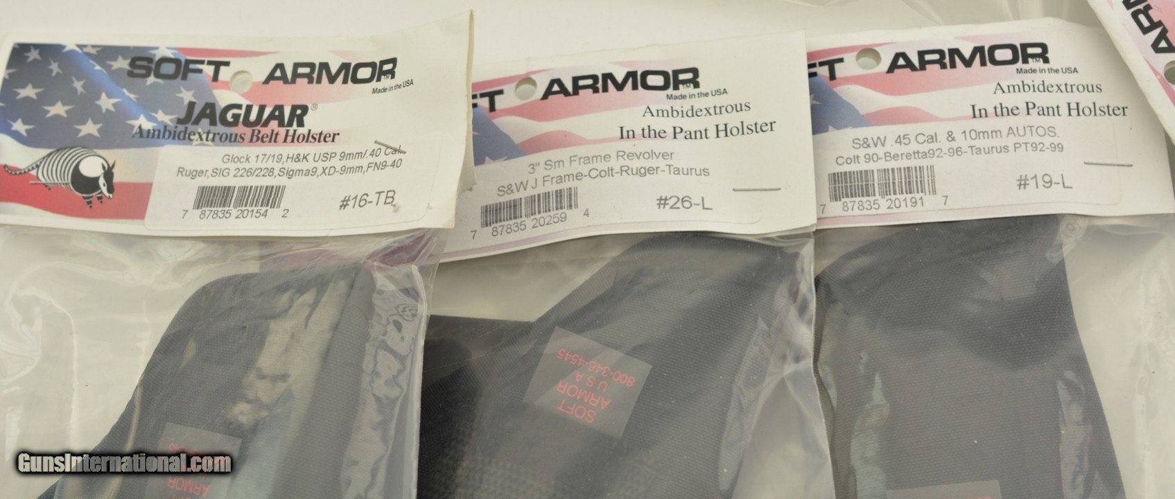 Description: This is a lot of NOS Soft Armor In The Pants Ambidextrous Holsters in original packaging, consisting of 1 #34-l, 35-L, 41-L, 26-L, 9-L,19-L, 18-L, 4-L, 16-TB, 16-L and a 36-L. This is a total of 11 new in the package holsters. Please see photos for further details. Price: $29.00 Contact Seller |