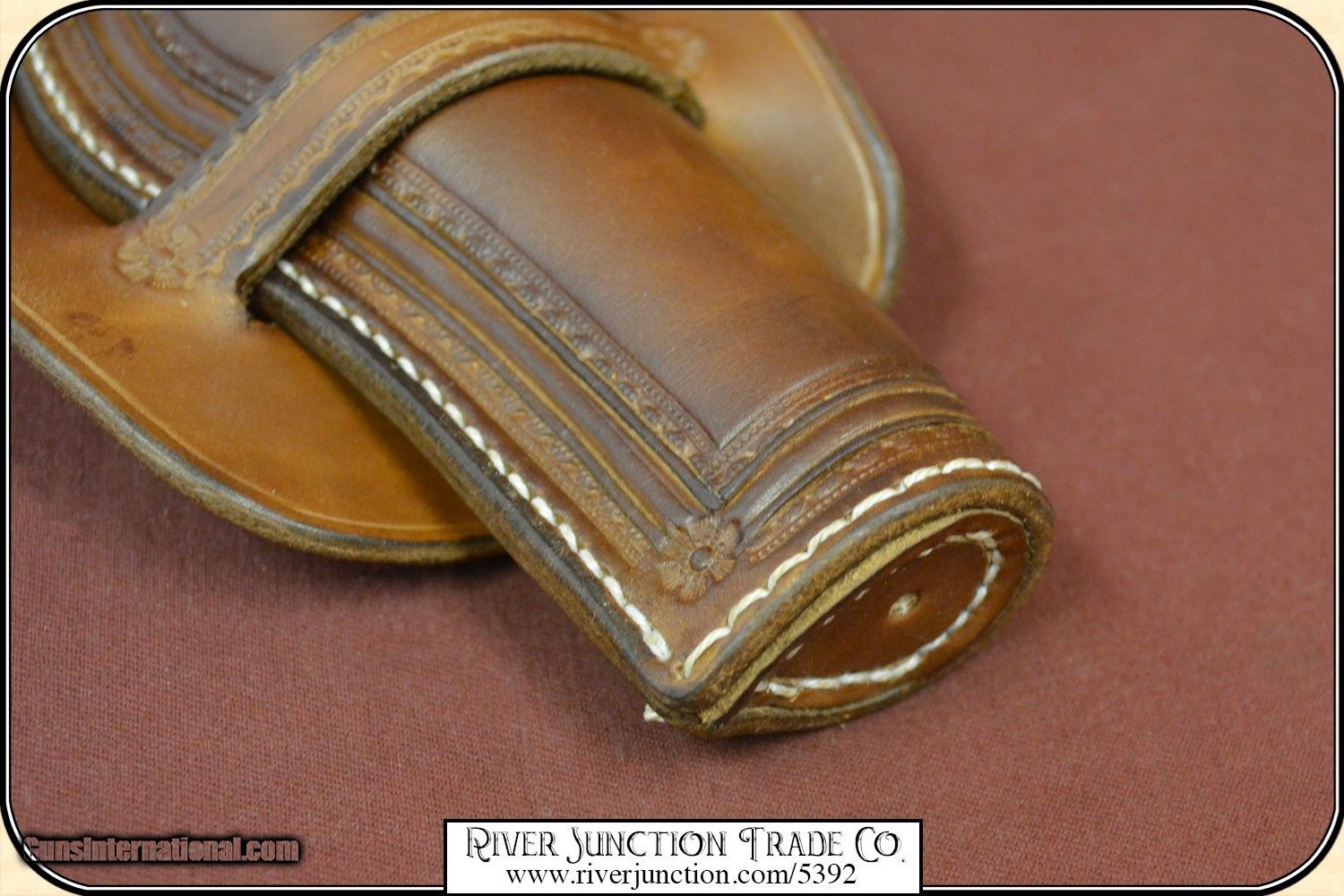 Description: For Colt S. A. 7-1/2" barrel. This Right Hand holster comes with the traditional Cheyenne style boarder stamped pouch and sewn in toe plug. Finished in an antique dark brown stain. It will fit 1873 Colt and Colt clones with 7-1/2" barrels, as well as Remington 1875 of the same era. All Ruger Vaqueros, 1851 Colt Navy, 1861 Colt Navy and 1860 Colt Armies in appropriate barrel lengths. Holsters of like-quality commonly sell for $150 to $200. MADE IN THE USA. Most all of our holster designs are made from originals we have found. These holster are crafted for River Junction by our most talented leather-smith. Each piece is hand-made for us and cut in their shop from the hide. The piece is worked and tooled right on the crafter's bench and all are dyed, oiled and sewn by hand. It is the hand sewing that makes for the strongest stitch much superior to the machine stitch. All that at the most favorable price. Payment: Item, can be ordered on line with a credit card or paypal on our sight. Just Google (riverjunction) and type in the River Junction Trade Co. item number ( 5392 ) in the search box. Before you checkout you will see shipping cost and total. OR If you prefer: Pay by cash, postal money order, cashiers check, personal & business checks. We wait for checks to clear. We always answer questions and entertain offers. Have questions? Call me 563-880-4588. Jim SOLD |