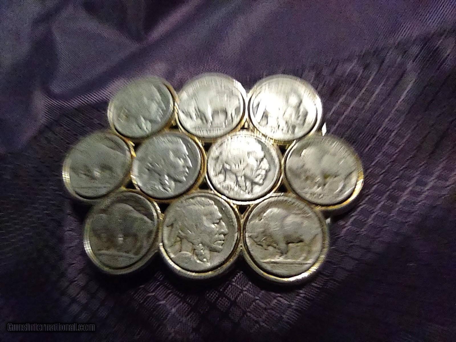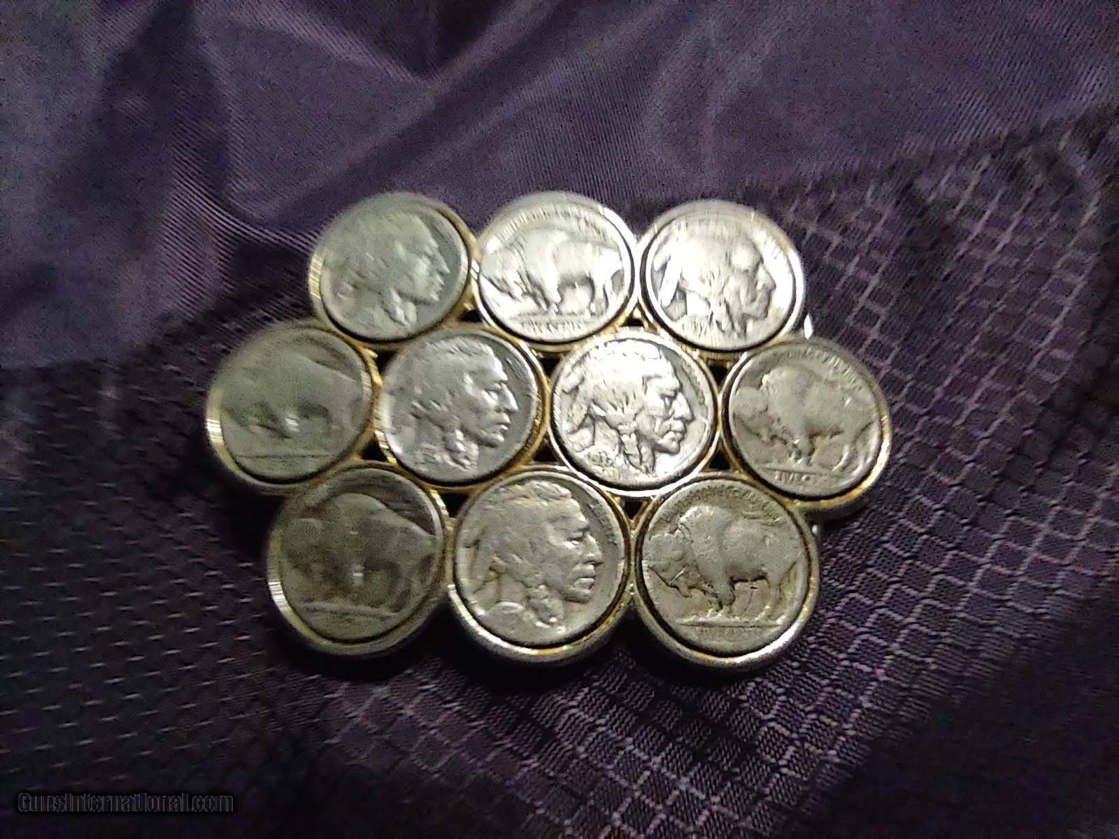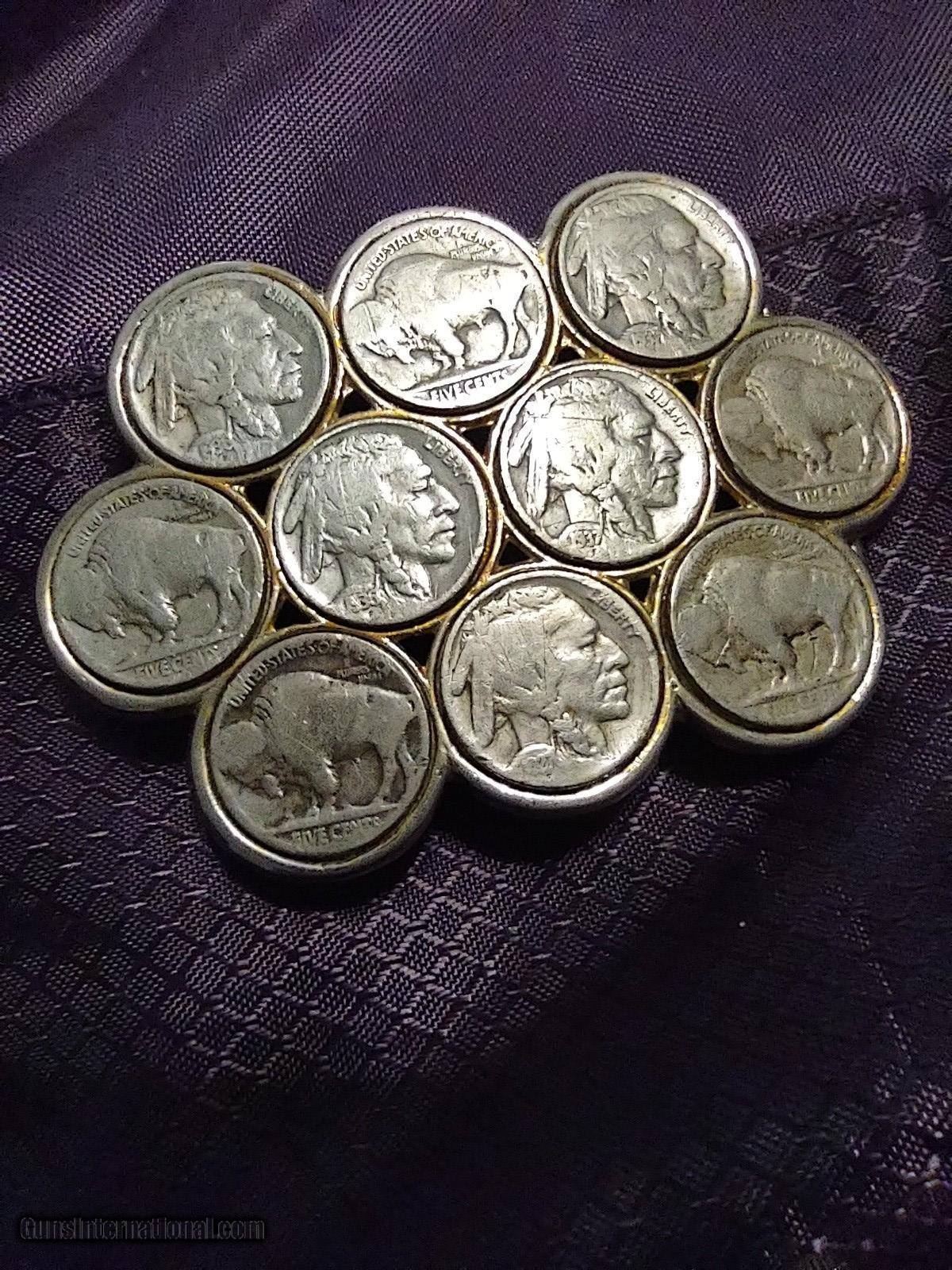 Description: BUFFALO NICKEL BELT BUCKLE with 10 circulated coins with Indian side dates of 1936, 1937 and 1927. The buckle will fit a leather belt up to 1 5/8" wide. The length of the buckle is 3 3/4" with height of 2 9/16". The buckle is very well built and really looks good. Who made it, when was it made or where was it made? I have no clue. The price is $60 including mailing to your home or workplace. Call or text me at 318-780-4242 if you are interested. SOLD |