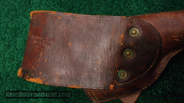 Description: Made by the Rock Island Arsenal and stamped '1910'. Inspectors initials 'H.E.K.' also stamped on back. Crisp U.S. marking on front. Holster is complete, even bottom plug and ring are present. VG overall cond, leather is still very supple and bendable, some age crazing and scuffing-mostly to the flap. A very interesting, fine cond piece of U.S. Military history! Leroy Merz Antique Firearms specializes in antique and vintage Winchesters and other fine American firearms. Since 1965 Mr. Merz has taken part in the world of firearms and has been a contributor to many well known reference books. Just recently we mailed the 124th edition of our privately-published catalog. We have hundreds of additional guns in every price range at our home online. Search for Merz Antiques in google. SOLD |