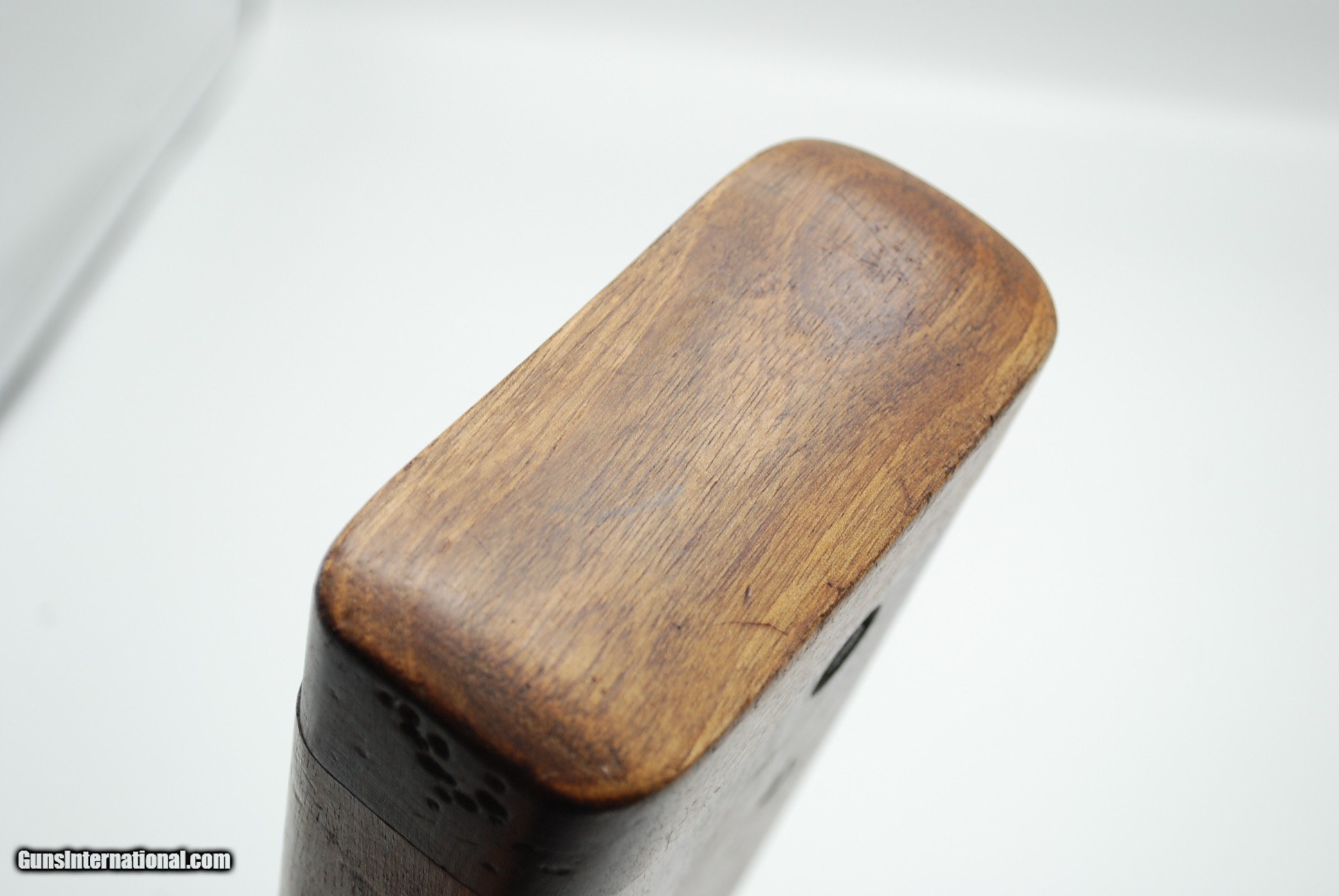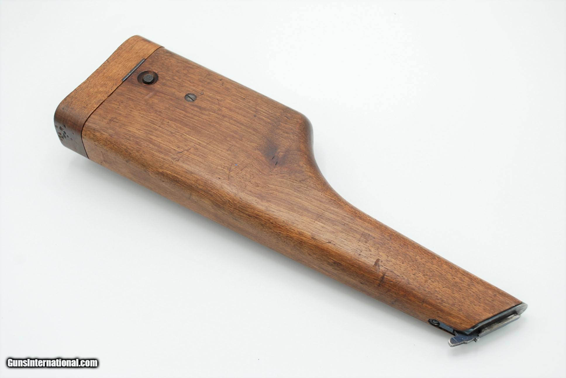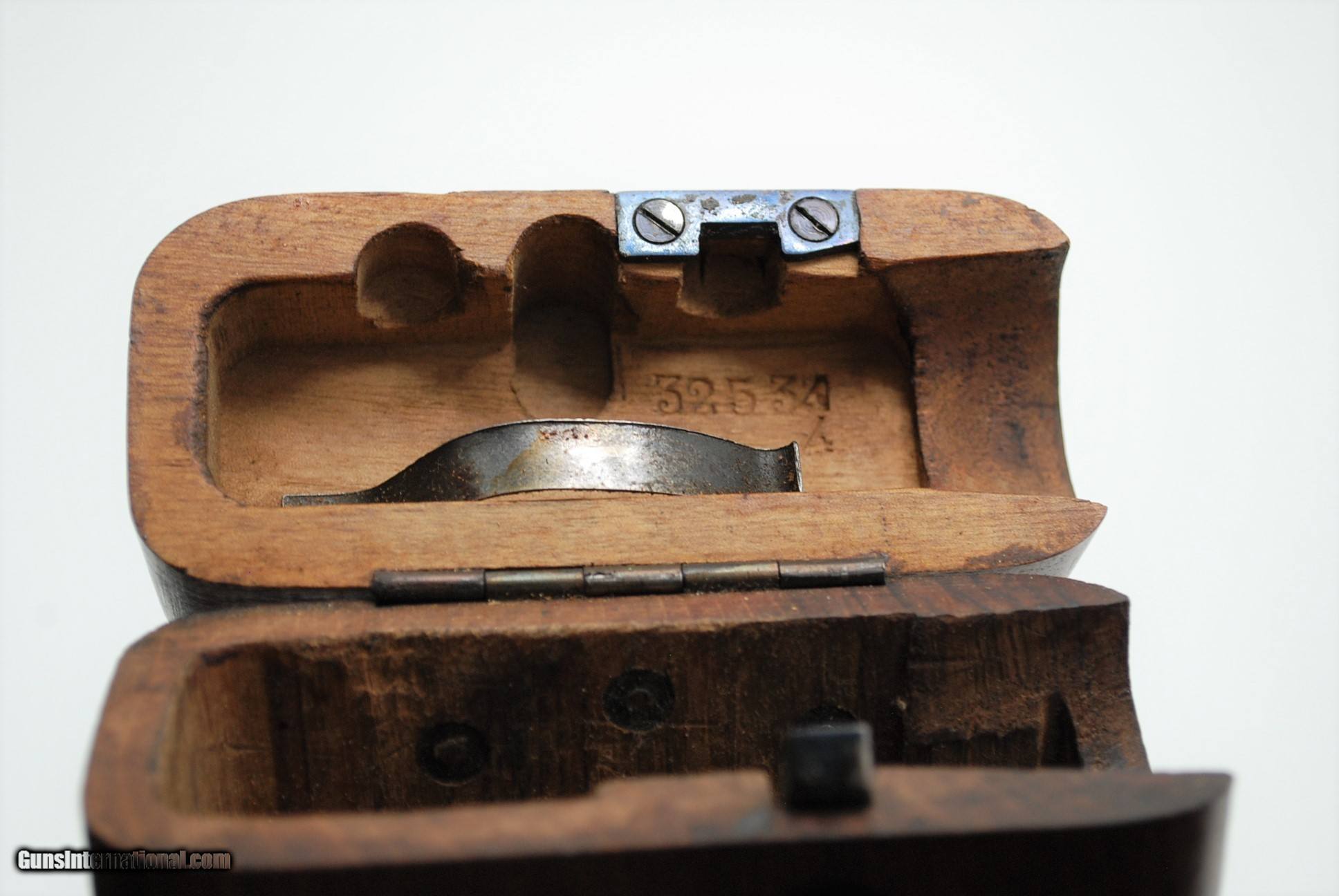 Description: Ok, in 15 years of doing this full time this is only the second one Ive had. They looks almost identical to Mauser shoulder stocks but they are beefier, wider, slightly longer and made of different wood. They also have serial numbers stamped on the inside of the lid. This particular one is in excellent all original condition, with no cracks or chips. Most of the original varnish is present on the wood and most of the metal parts retain original blue. Everything functions flawlessly. SOLD |
