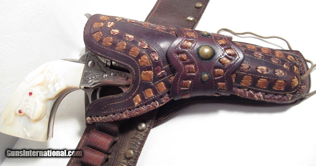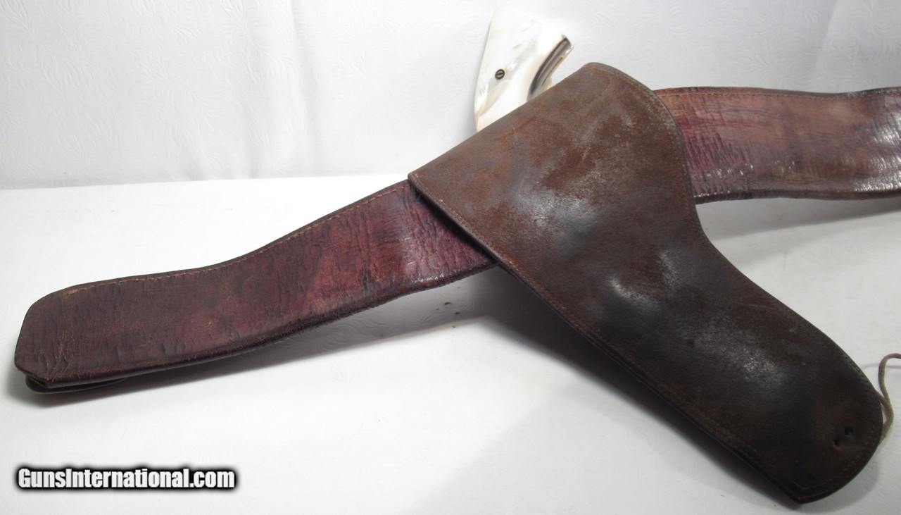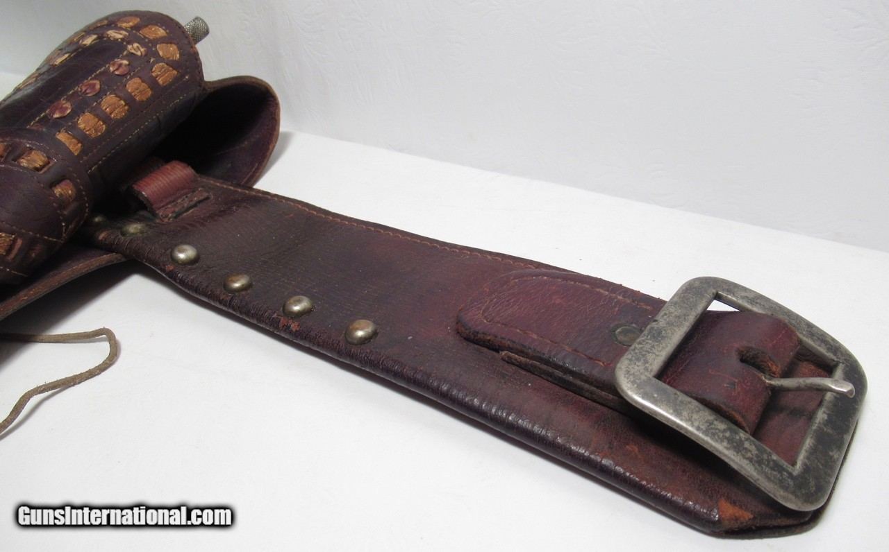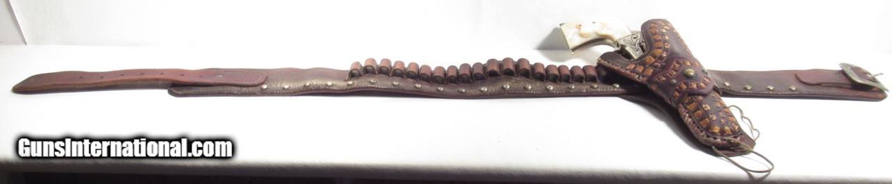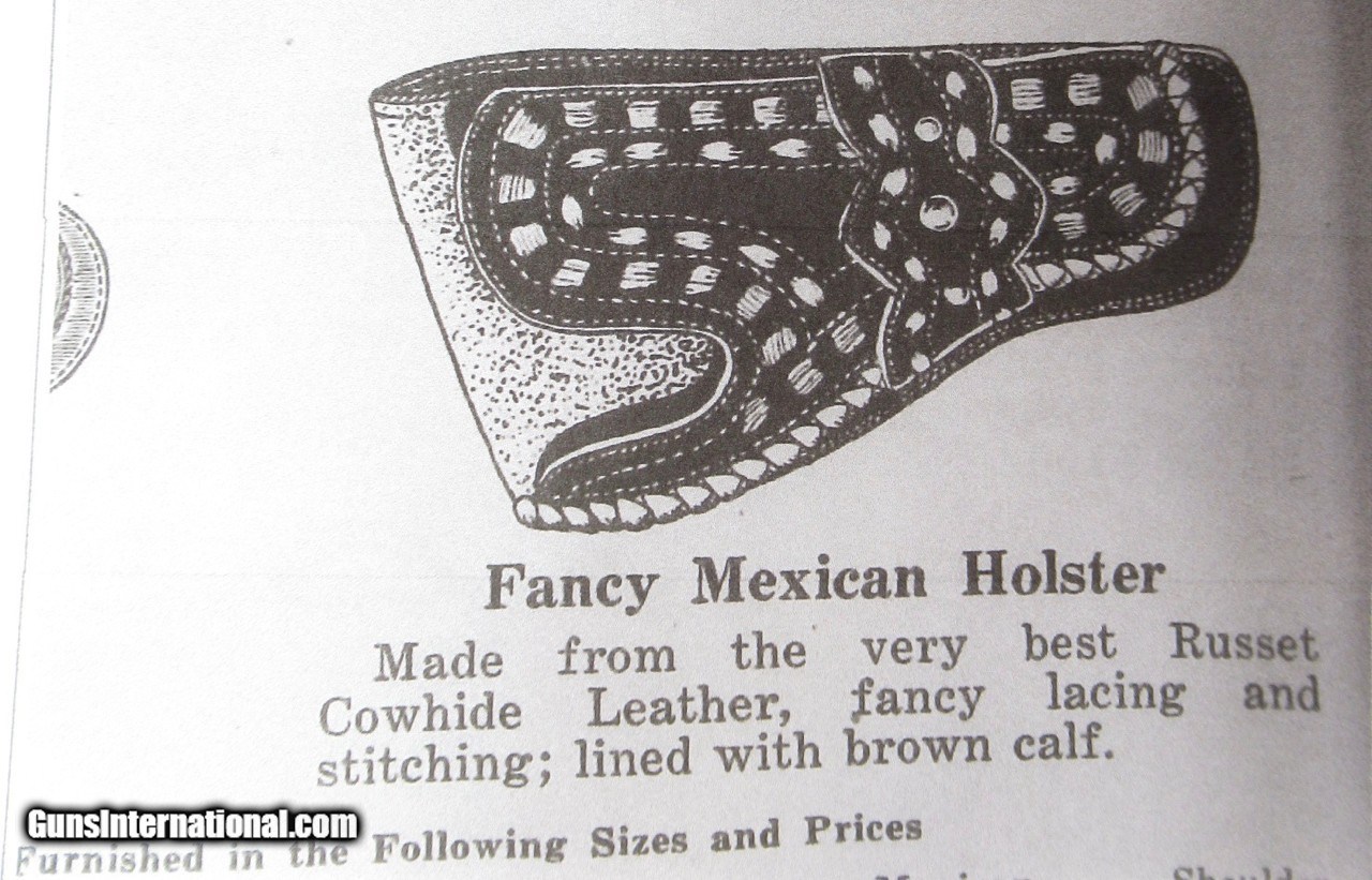 Description: Wolf & Klar Holster for a Colt SAA 45; This Holster is Shown on Page 104 of the 1925 Wolf & Klar Catalog; Comes with a Spotted Money Belt 43” L.O.A. with .45 Caliber Loops, Very Rare Item!; Shown with Wolf & Klar Shipped Colt SAA (Revolver not included); LIQUIDATING PERSONAL COLLECTION; Price: $2,500 + $30 S&H; Price includes insured shipping; return policy: three days inspection from the date the items received; full refund of shipping both ways ONLY IF THE ITEM IS MISREPRESENTED. SOLD |
