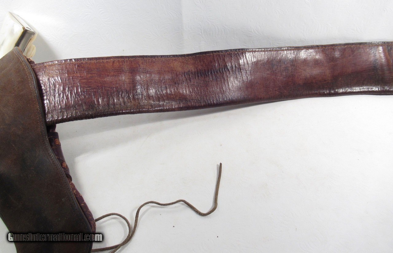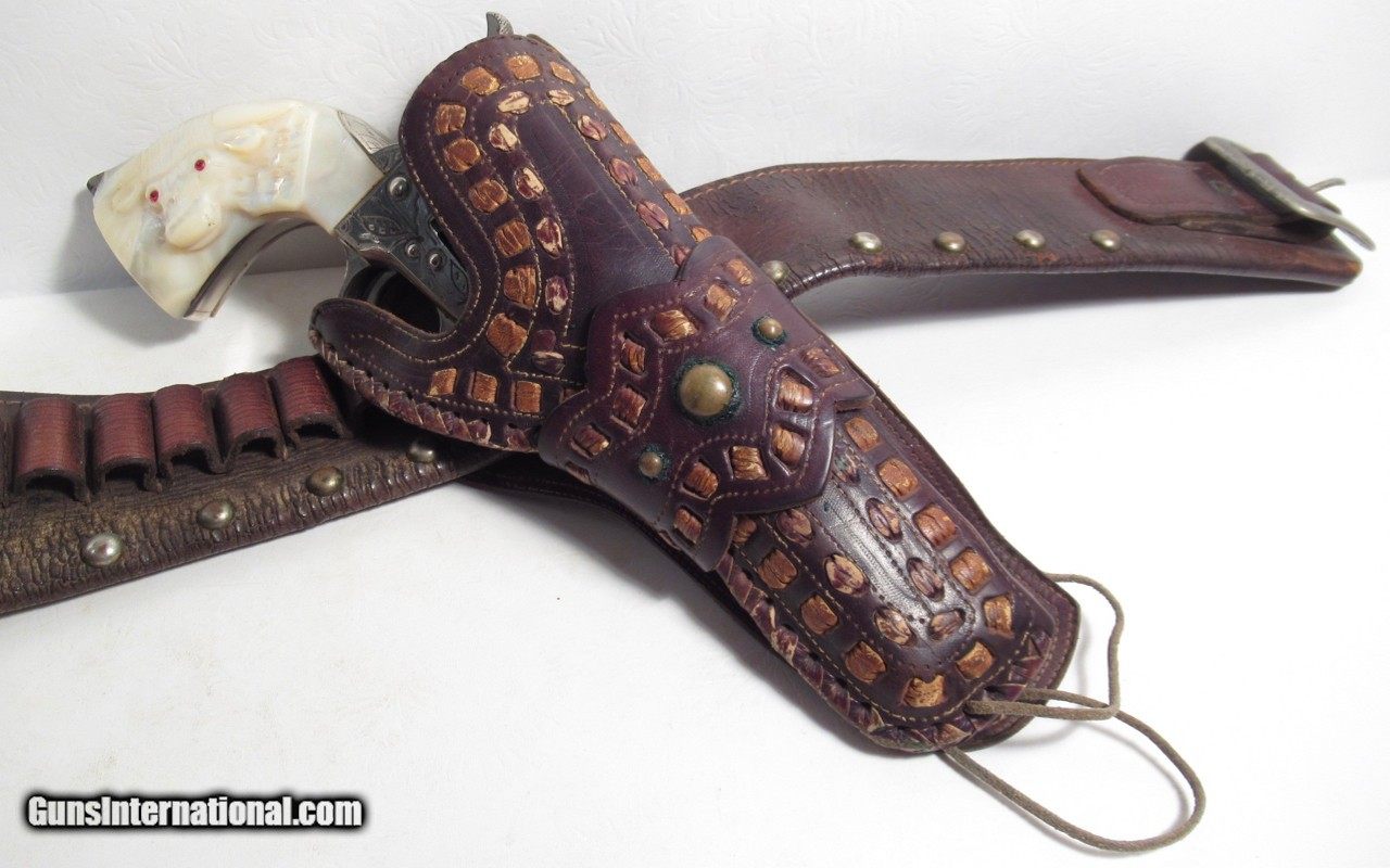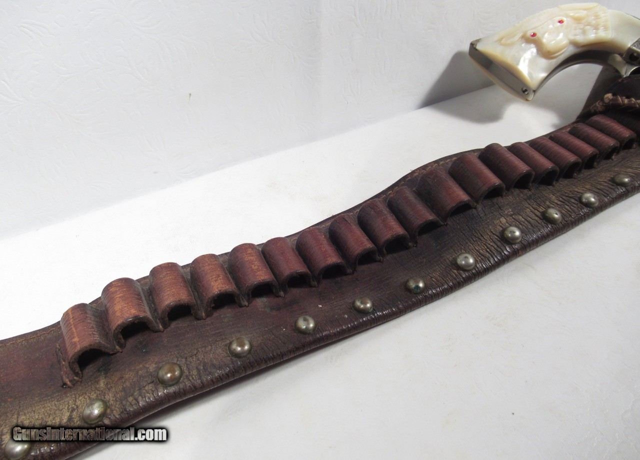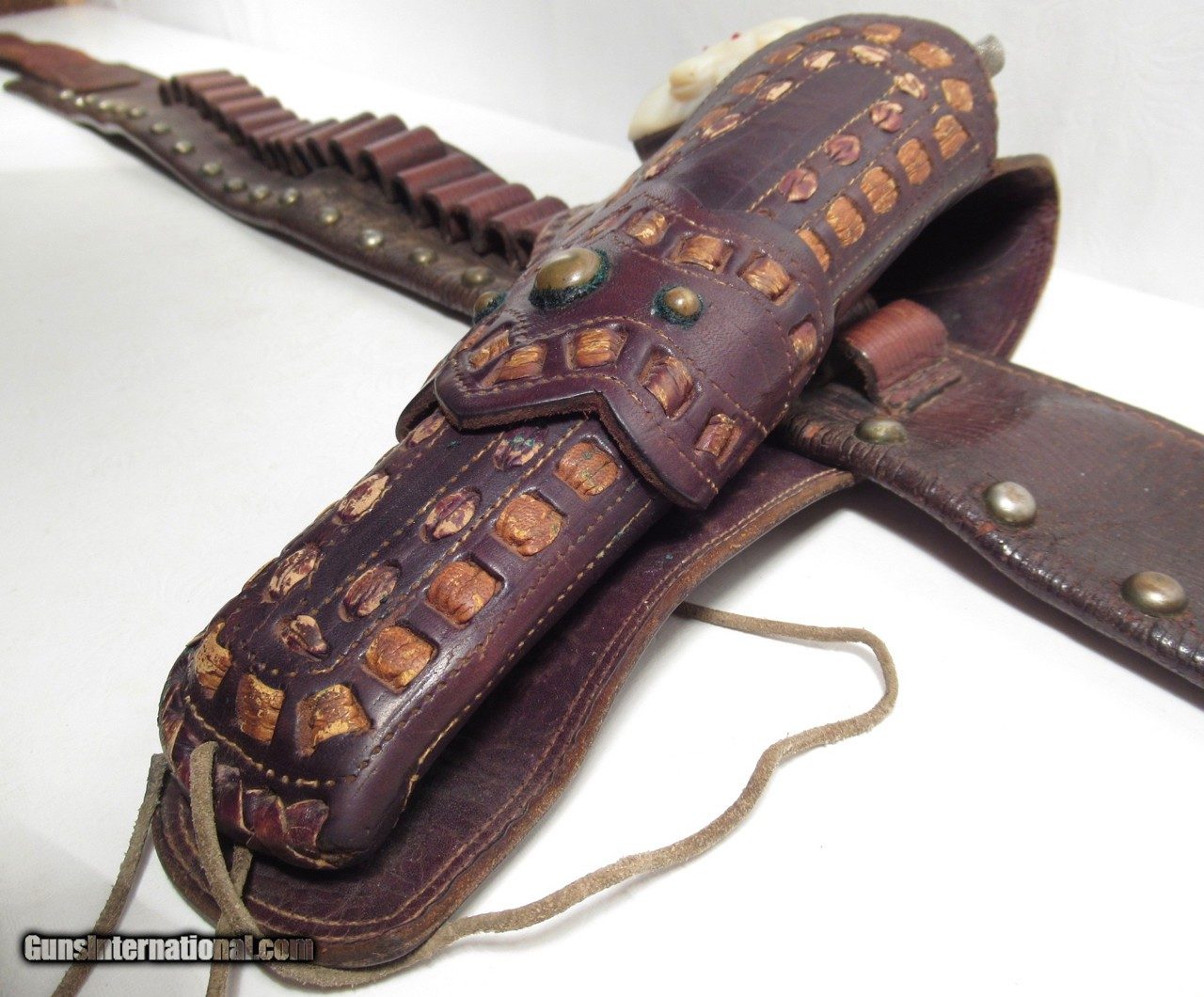 Description: Wolf & Klar Holster for a Colt SAA 45; This Holster is Shown on Page 104 of the 1925 Wolf & Klar Catalog; Comes with a Spotted Money Belt 43” L.O.A. with .45 Caliber Loops, Very Rare Item!; Shown with Wolf & Klar Shipped Colt SAA (Revolver not included); LIQUIDATING PERSONAL COLLECTION; Price: $2,500 + $30 S&H; Price includes insured shipping; return policy: three days inspection from the date the items received; full refund of shipping both ways ONLY IF THE ITEM IS MISREPRESENTED. SOLD |