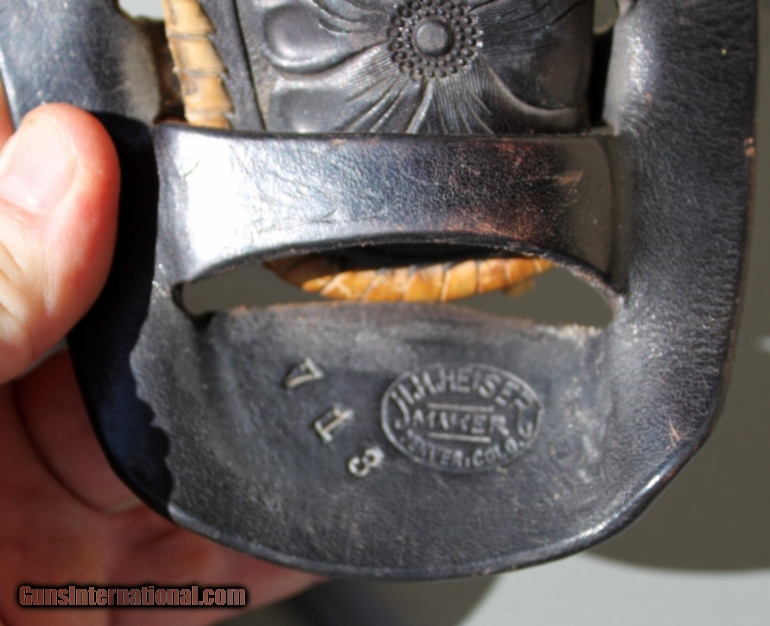 Description: SOLD !! Nice Heiser Western Double Loop Holster. The model #713 is properly marked with the oval H. H. Heiser Denver Colorado makers mark logo which dates this holster from 1919 through 1955. The leather is in excellent condition. The rawhide welting is very good except for the back side of the open toe where it is missing(see pics). From research I think the following guns will fit in this holster. Smith & Wesson "N" Frame Revolvers S&W 1926 .44 / Military or S&W 1950 .44 Military / S&W .38 / .44 Heavy Duty or the S&W .357 Magnum. See pictures for accurate description and condition. Sale price includes free shipping in the Cont. US. Please see my other items for more vintage leather accessories. SOLD |