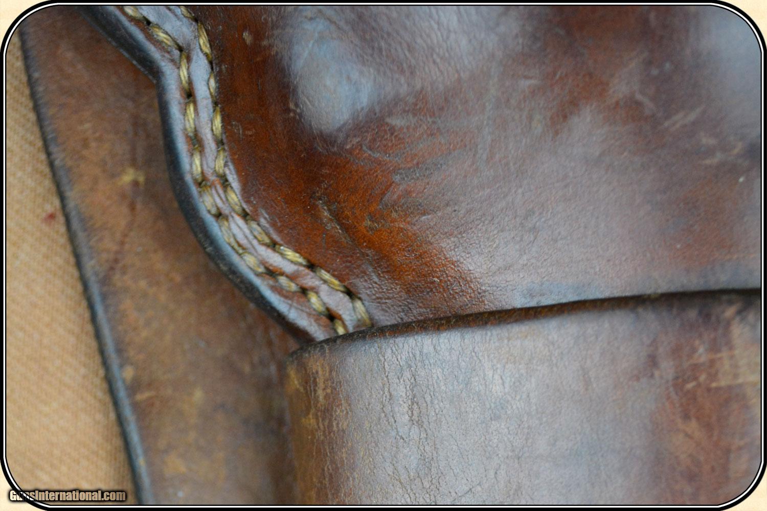 Description: "Mexican Loop" Pattern Holster for a Colt New Service Double Action revolver with 5 1/2 inch barrel or shorter. Maker unknown. This right hand holster features form fit pouch with double stitched main seam, and a single straight loop. Made of dark honey colored leather. The piece has a gracefully re-curved throat profile. A full silhouette skirt that owner modified by cutting a portion of skirt away and then hand laced back to the skirt to make the whole rig ride higher on the belt. You can see this worked as it shows signs of wear in this configuration. Has very nice age patina with no rips, tear or breaks. Will provide many years of service. My Colt is not included. PAYMENT Cash, postal money order, cashiers check, personal & business checks. May order at riverjucntion on-line with credit card. SOLD |