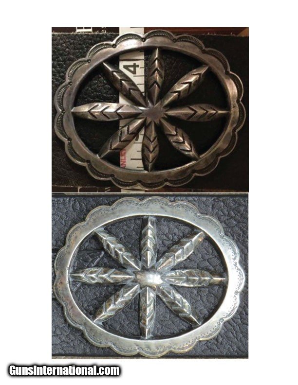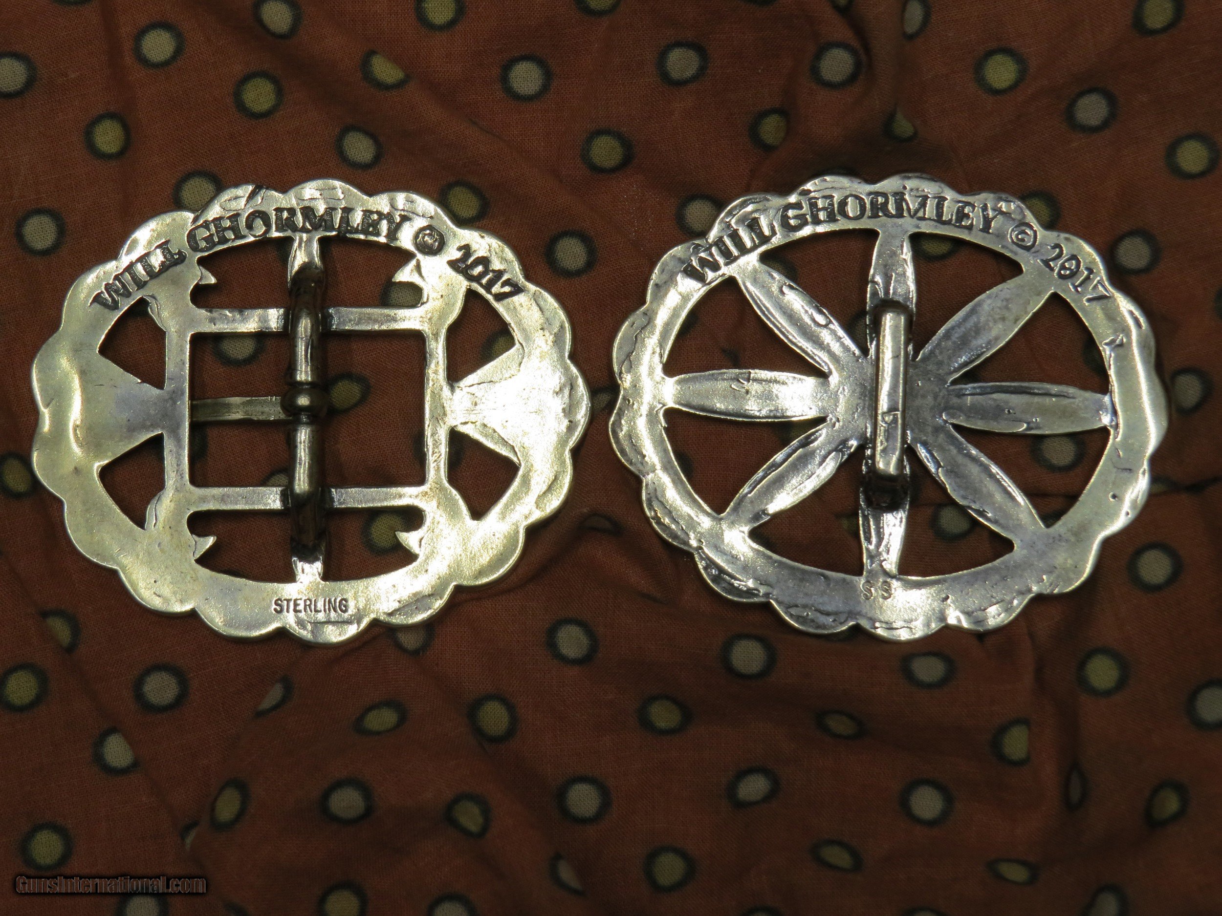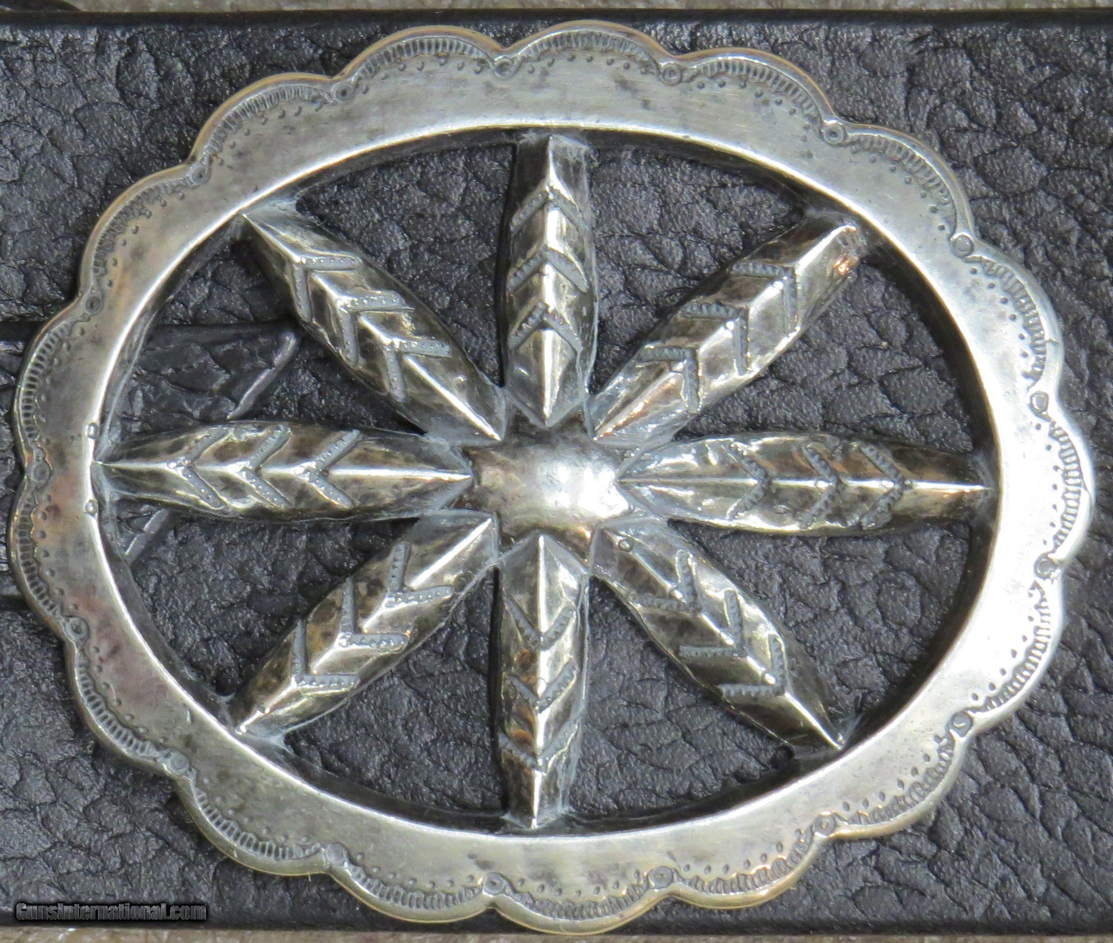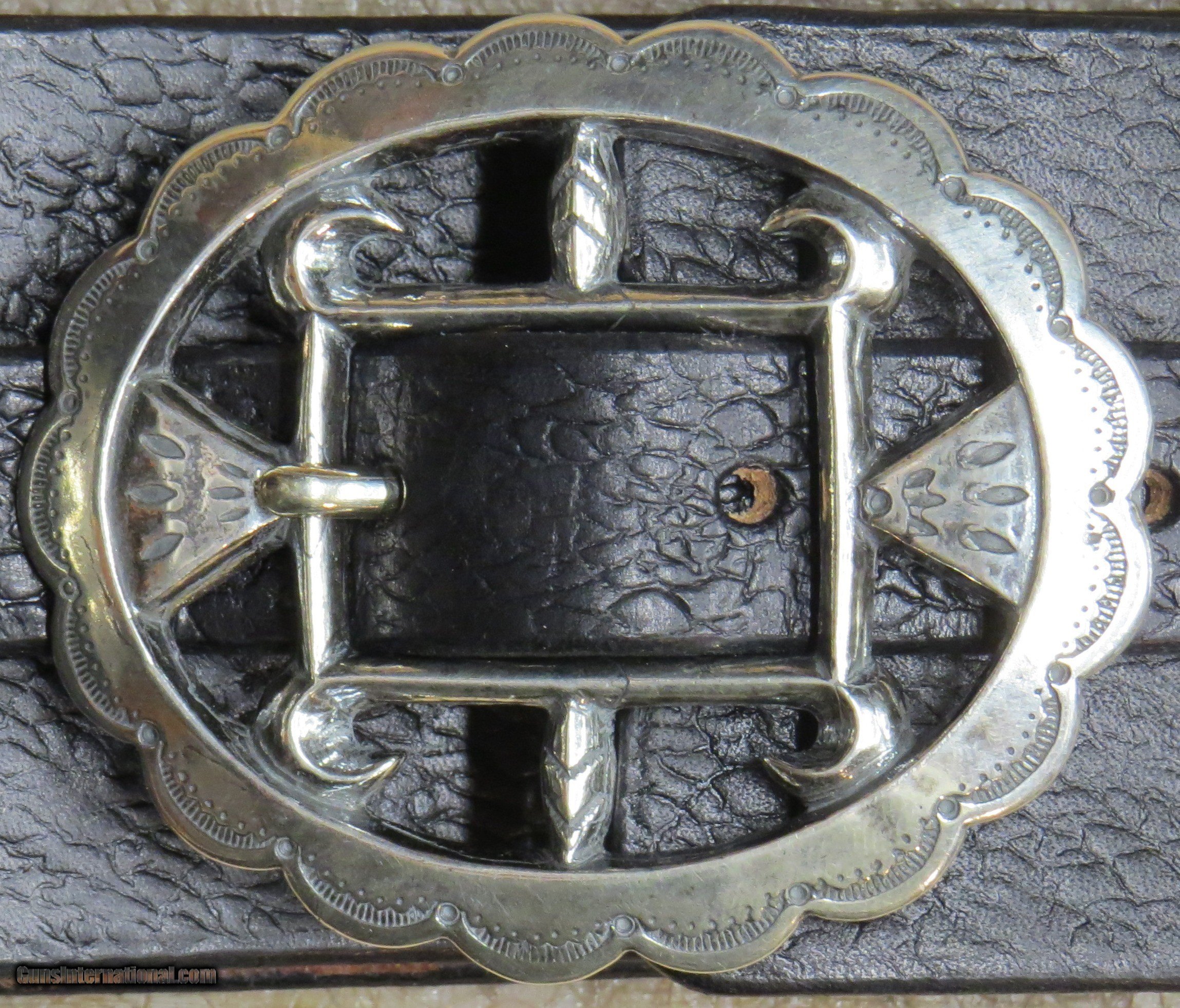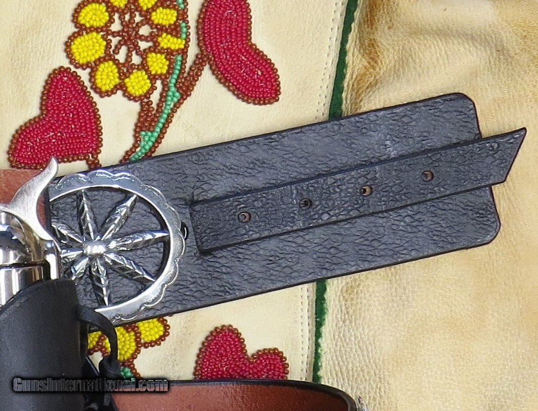 Description: Sold, but a Grand Teton Rig can still be custom made for you! GUN AND BEADED UTE BUCKSKIN SHIRT NOT INCLUDED! I currently have a set of ten sterling silver conchos and one sterling silver buckle. I can make a Grand Teton Rig to fit any weapon and any belt length. A Grand Teton Rig with this sterling silver hardware can be made for $2400, plus shipping and insurance. Will Ghormley's Grand Teton Rig is the most accurate reproduction of the rig worn by Alan Ladd in the 1953 movie "Shane". This is due in part to Ghormley's extensive research. But Alan Ladd's son David also contributed photos, measurements, and family stories about the rig. This gave Ghormley access to details unavailable to every other craftsman making replicas. The belt handed down to David from his father, and worn by Alan Ladd's granddaughter Shane, is missing the original holster and buckle. But Ghormley was able to recreate a duplicate to the original buckle that is now worn on the original belt. The attention to detail can be seen in the photo comparing one of the original conchos on Alan Ladd's belt with one of the concho reproductions by Ghormley. David Ladd didn't want any hardware made identical to the originals to discourage people from claiming reproductions were originals from the movie. A close-up of Ghormley's concho reveals the small details distinguish Ghormley's reproductions from the originals. Also, the back side of the conchos and buckle bear Ghormley's name, copyright, and date. A close-up of the buckle now on Alan Ladd's belt, also shows the distressed surface of the leather. This surface texture is reproduced by Ghormley on the Grand Teton Rigs he makes. The unique billet of Ladd's belt is reproduced with an adjustable billet and chape to keep the distance between the buckle and the conchos on each side of the buckle equal (something that wasn't done on the three or more belts used by Ladd in the movie). At least one of the rigs used for the movie had the holster riveted to the light-weight belt. Perhaps this was to keep the leather from rolling down from the weight of the weapon. But it might have been to keep the holster from riding up on the belt while the gun was being drawn in action shots. A close-up from the movie shows the rivets not seen on other rigs, as Rodd Redwing twirls the gun as Ladd's gun-handling double. The movie holster was built to fit a Colt 1873 Single Action Army with a 5 1/2" barrel. It carried a nickel plated SAA with the trigger and front sight removed, and a 7 1/2" barrel that stuck out through the toe. The weapon could only be fired by fanning the hammer. However, a double action Colt Model 1909 was modified to look like the SAA, and Ladd used this weapon in the shootout scenes in the saloon while going through the motion of fanning the hammer. Presumably the M1909 was carried in a different holster. Ladd can be seen carrying the weapon nestled down in the holster when it wasn't being used during a scene. But in sequences where the gun would be drawn, the holster was tight enough the weapon could be staged in the holster with the trigger guard completely out of the holster. The hero-holster also had a horizontally mounted hammer thong to retain the weapon. Along the main-stem of the holster was a repeated "S" stamp which Ghormley has replicated. All details have been carefully researched for the most accurate reproduction being made. No "Shane" rig currently being manufacture carries with it the provenance or connection with Alan Ladd or the movie. Ghormley's museum quality reproductions and originals are sought after and valued around the globe. His "Hand of God" gun rig created for Russell Crowe in the remake of "3:10 to Yuma", has become an iconic modern classic. Ghormley will only make a handful of sterling silver Grand Teton Rigs in his lifetime. This one could be custom made for you and become an instant collectable. It will take about four weeks from the time the order is received till the custom-made Grand Teton Rig is ready for shipping. SOLD |