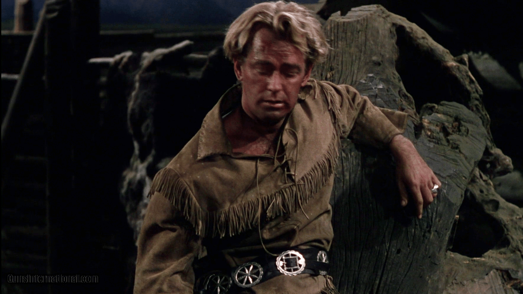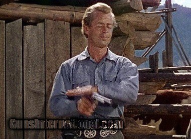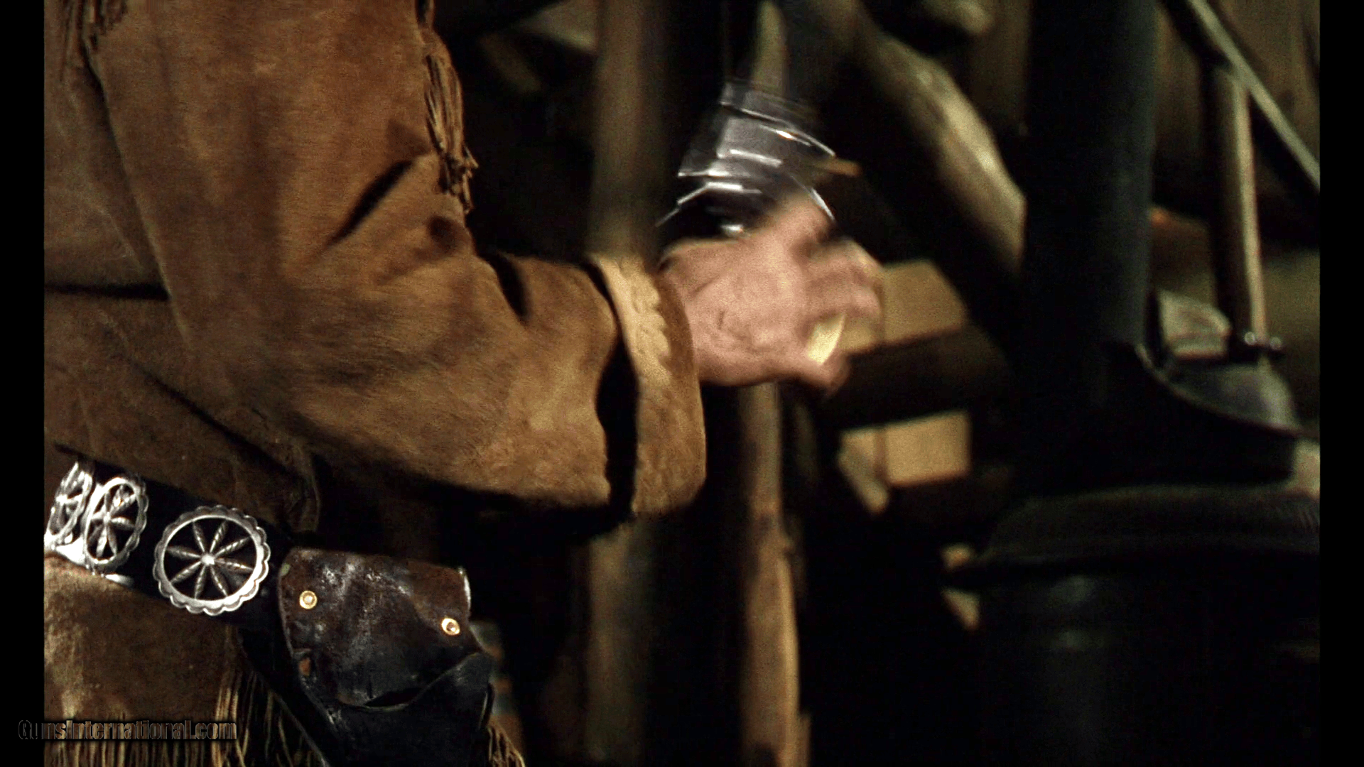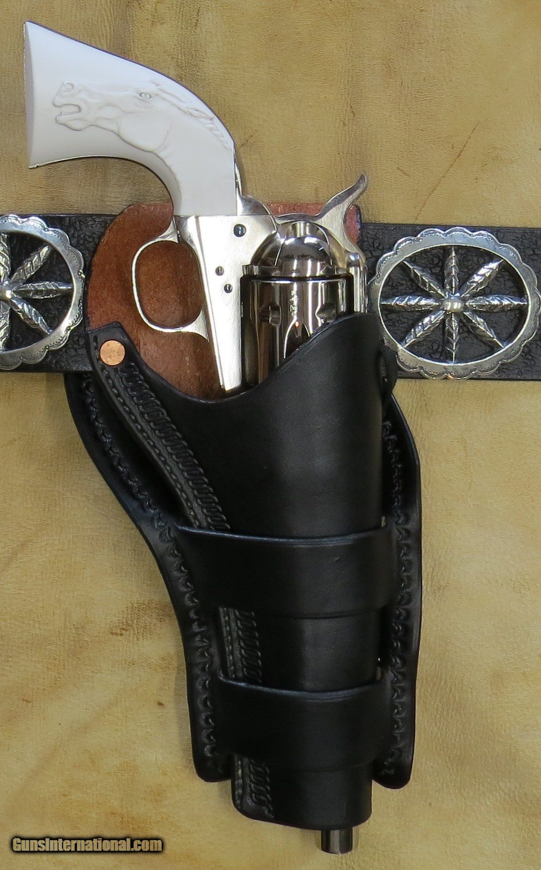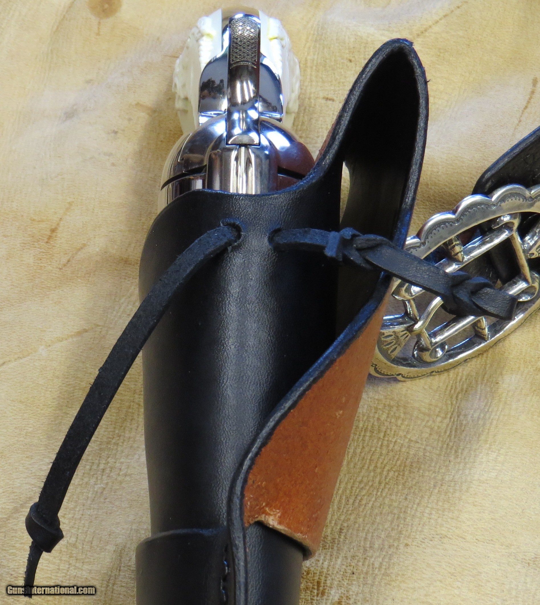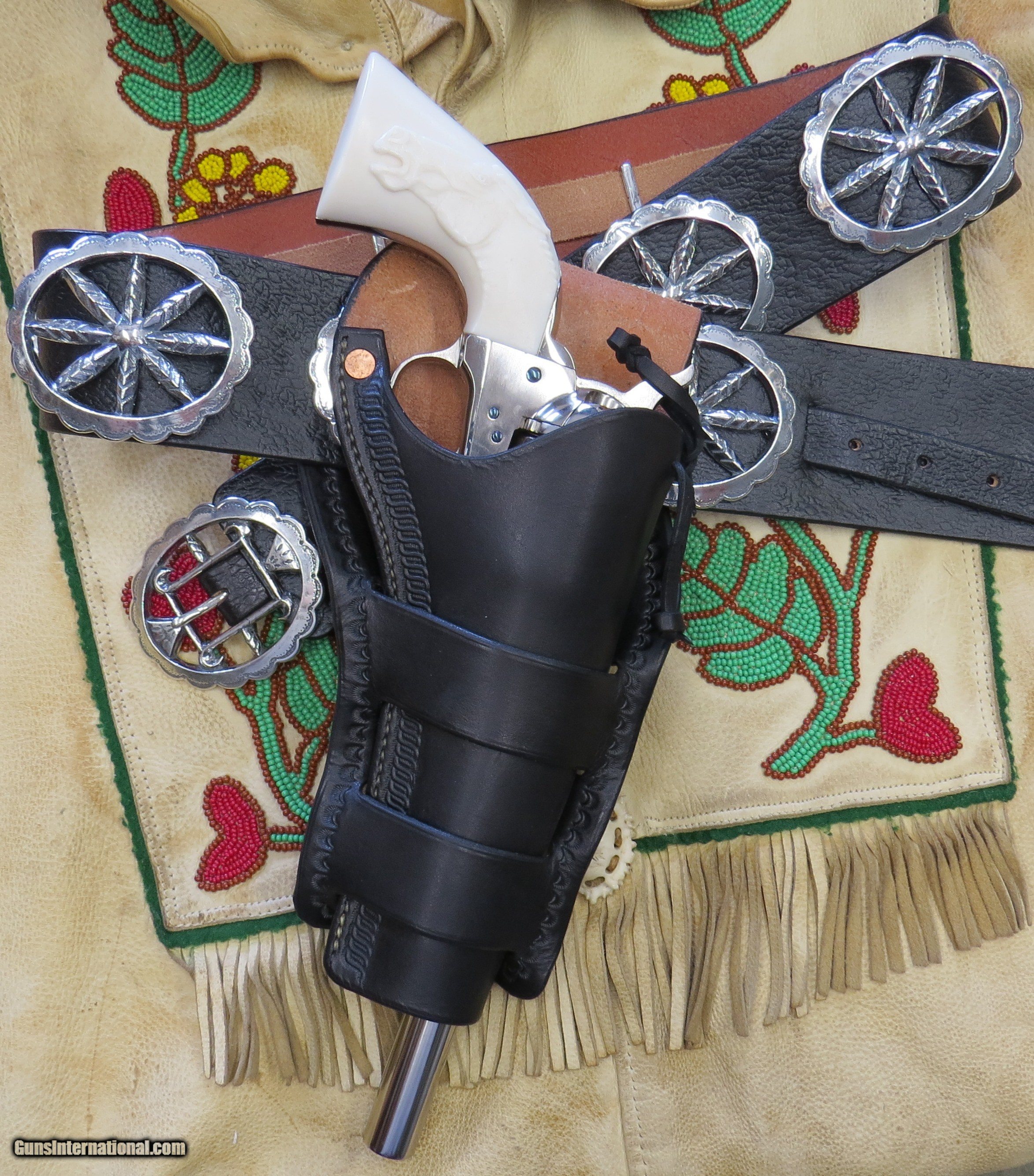 Description: Sold, but a Grand Teton Rig can still be custom made for you! GUN AND BEADED UTE BUCKSKIN SHIRT NOT INCLUDED! I currently have a set of ten sterling silver conchos and one sterling silver buckle. I can make a Grand Teton Rig to fit any weapon and any belt length. A Grand Teton Rig with this sterling silver hardware can be made for $2400, plus shipping and insurance. Will Ghormley's Grand Teton Rig is the most accurate reproduction of the rig worn by Alan Ladd in the 1953 movie "Shane". This is due in part to Ghormley's extensive research. But Alan Ladd's son David also contributed photos, measurements, and family stories about the rig. This gave Ghormley access to details unavailable to every other craftsman making replicas. The belt handed down to David from his father, and worn by Alan Ladd's granddaughter Shane, is missing the original holster and buckle. But Ghormley was able to recreate a duplicate to the original buckle that is now worn on the original belt. The attention to detail can be seen in the photo comparing one of the original conchos on Alan Ladd's belt with one of the concho reproductions by Ghormley. David Ladd didn't want any hardware made identical to the originals to discourage people from claiming reproductions were originals from the movie. A close-up of Ghormley's concho reveals the small details distinguish Ghormley's reproductions from the originals. Also, the back side of the conchos and buckle bear Ghormley's name, copyright, and date. A close-up of the buckle now on Alan Ladd's belt, also shows the distressed surface of the leather. This surface texture is reproduced by Ghormley on the Grand Teton Rigs he makes. The unique billet of Ladd's belt is reproduced with an adjustable billet and chape to keep the distance between the buckle and the conchos on each side of the buckle equal (something that wasn't done on the three or more belts used by Ladd in the movie). At least one of the rigs used for the movie had the holster riveted to the light-weight belt. Perhaps this was to keep the leather from rolling down from the weight of the weapon. But it might have been to keep the holster from riding up on the belt while the gun was being drawn in action shots. A close-up from the movie shows the rivets not seen on other rigs, as Rodd Redwing twirls the gun as Ladd's gun-handling double. The movie holster was built to fit a Colt 1873 Single Action Army with a 5 1/2" barrel. It carried a nickel plated SAA with the trigger and front sight removed, and a 7 1/2" barrel that stuck out through the toe. The weapon could only be fired by fanning the hammer. However, a double action Colt Model 1909 was modified to look like the SAA, and Ladd used this weapon in the shootout scenes in the saloon while going through the motion of fanning the hammer. Presumably the M1909 was carried in a different holster. Ladd can be seen carrying the weapon nestled down in the holster when it wasn't being used during a scene. But in sequences where the gun would be drawn, the holster was tight enough the weapon could be staged in the holster with the trigger guard completely out of the holster. The hero-holster also had a horizontally mounted hammer thong to retain the weapon. Along the main-stem of the holster was a repeated "S" stamp which Ghormley has replicated. All details have been carefully researched for the most accurate reproduction being made. No "Shane" rig currently being manufacture carries with it the provenance or connection with Alan Ladd or the movie. Ghormley's museum quality reproductions and originals are sought after and valued around the globe. His "Hand of God" gun rig created for Russell Crowe in the remake of "3:10 to Yuma", has become an iconic modern classic. Ghormley will only make a handful of sterling silver Grand Teton Rigs in his lifetime. This one could be custom made for you and become an instant collectable. It will take about four weeks from the time the order is received till the custom-made Grand Teton Rig is ready for shipping. SOLD |
