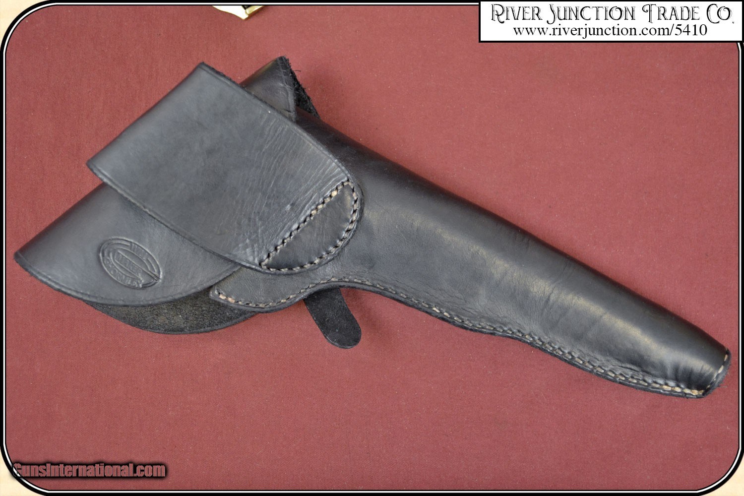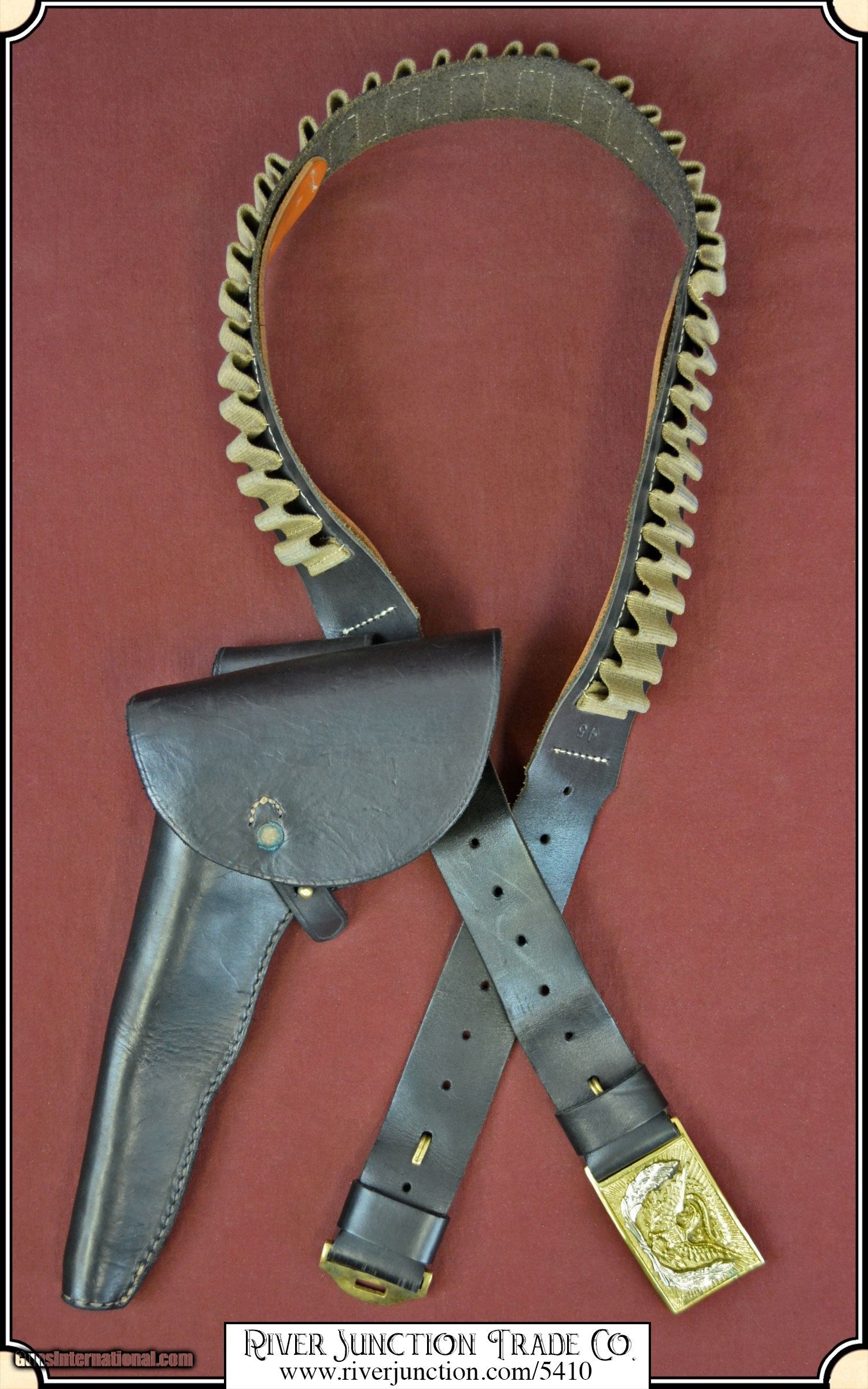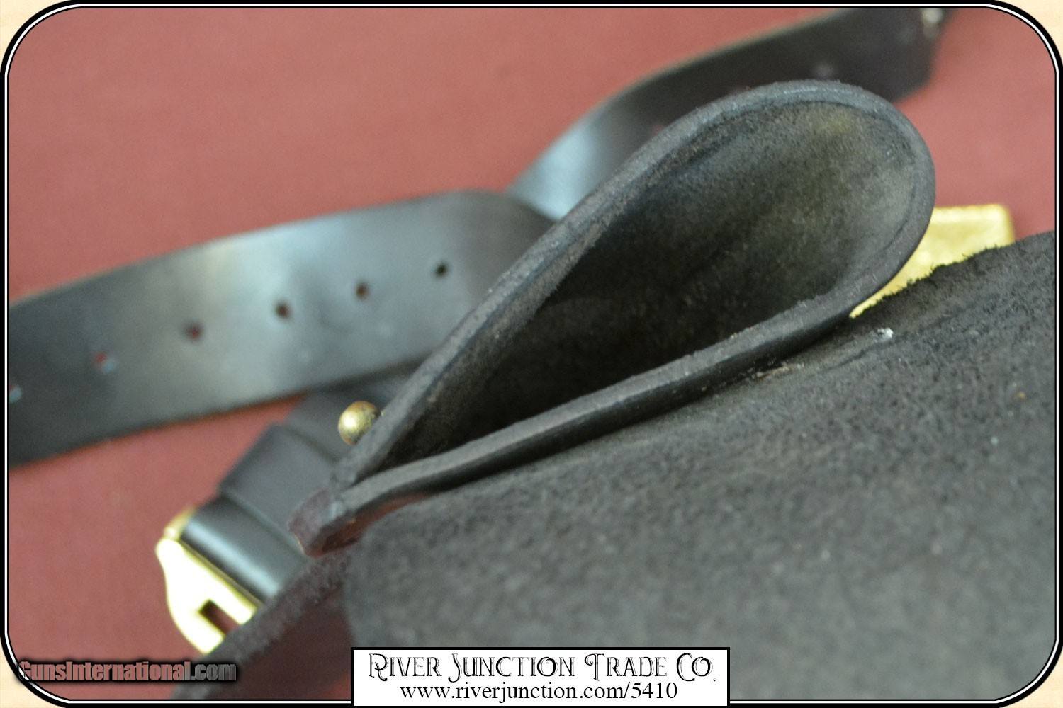 Description: Will Ghormley made this belt and holster. The belt is an early experimental military "Fair Weather Christian" cartridge belt. The belt was built to carry govt. .45-70 carbine cartridges. (will also carry .45LC, .44-40WCF, .38-40 WCF, and others) The 1851 Officer's Saber Belt Plate Buckle was used to fasten many of the early prototypes. The belt is a fully adjustable, "one size fits all". The holster is marked "WILL GHORMLEY MAKER". Both belt and holster are Hell for stout, and would give a century of hard use. This outfit is as new, showing no wear. Will fit a large selection of frontier era revolvers with 7 1/2 to 8 inch barrels. To have this rig made would cost $300.00 plus a long wait. Here it is ready to carry your Colt 1873, Colt 1878, Remington 1875 & 1890, Colt 1851,61,60, and 72. plus many others. Payment: Item, can be ordered on line with a credit card or paypal on our sight. Just Google (riverjunction) and type in the River Junction Trade Co. item number (5410) in the search box. Before you checkout you will see shipping cost and total. OR If you prefer: Pay by cash, postal money order, cashiers check, personal & business checks. We wait for checks to clear. We always answer questions and entertain offers. Have questions? Call me 563-880-4588. Jim SOLD |
