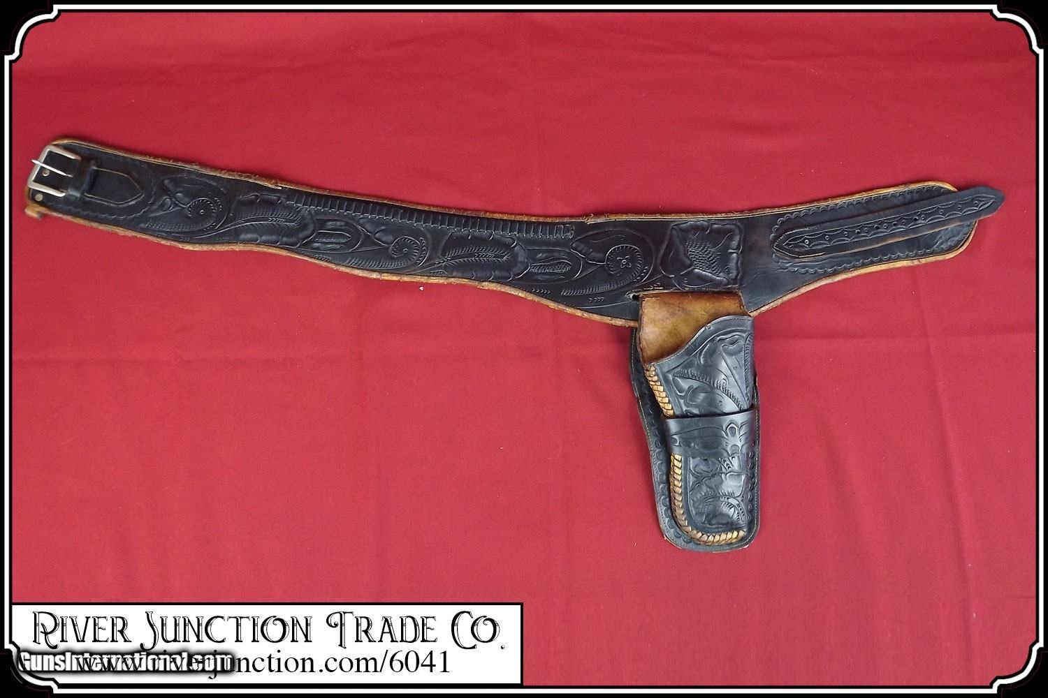 Description: Floral carved pattern holster for a 4 3/4 inch barreled Colt Single Action army revolver. Maker unknown, but very well produced and worthy of any famous B Western Movie Star. This right hand holster features beautiful hand carved floral styling throughout the belt and holster. Made of midnight black colored leather the rig is fully lined in the belt and holster. The piece has a gracefully re-curved throat profile for your Colt SAA or other revolvers of like size. 37 bullet loops in .22 caliber, along the top edge of the belt. All stitching is intact and tight. From the buckle to the center hole in the belt measures 37 inches. All the leather is fully alive and will give long use. The lining on the back has a tear see photo. Payment: Item, can be ordered on line with a credit card or paypal on our sight. Just Google (riverjunction) and type in the River Junction Trade Co. item number (6041) in the search box. Before you checkout you will see shipping cost and total. OR If you prefer: Pay by cash, postal money order, cashiers check, personal & business checks. We wait for checks to clear. We always answer questions and entertain offers. Have questions? Call me 563-880-4588. Jim SOLD |