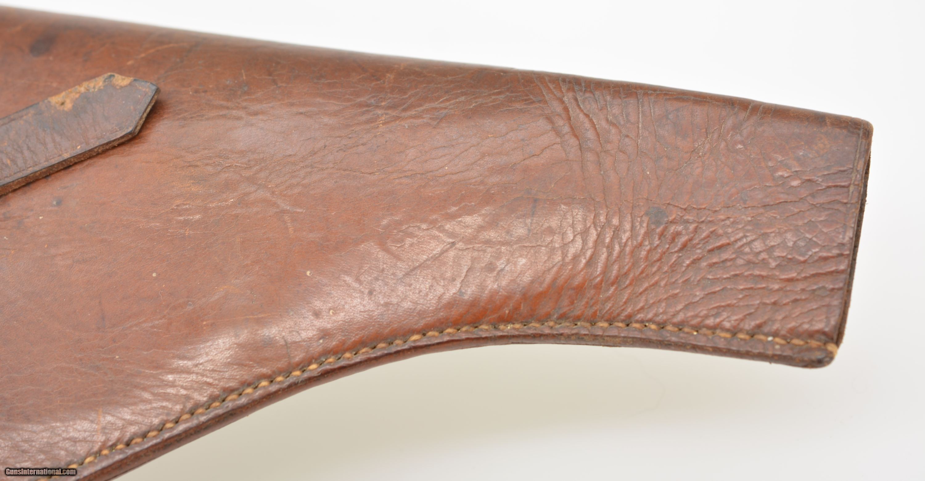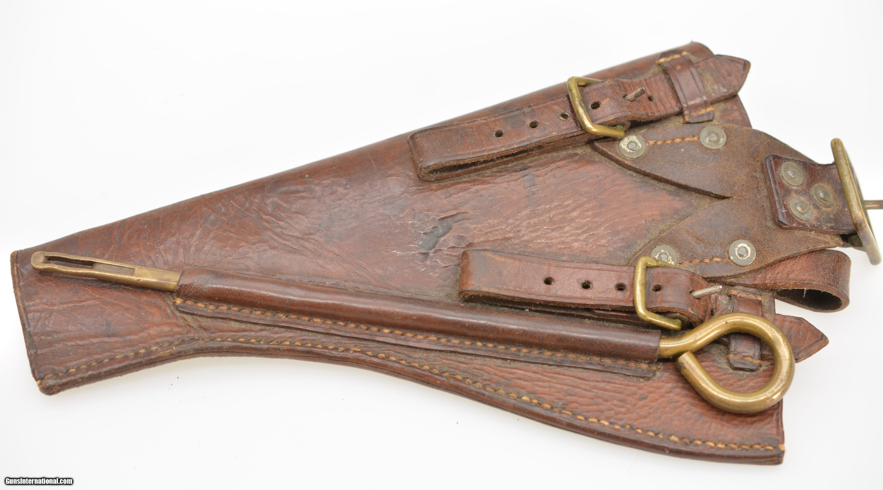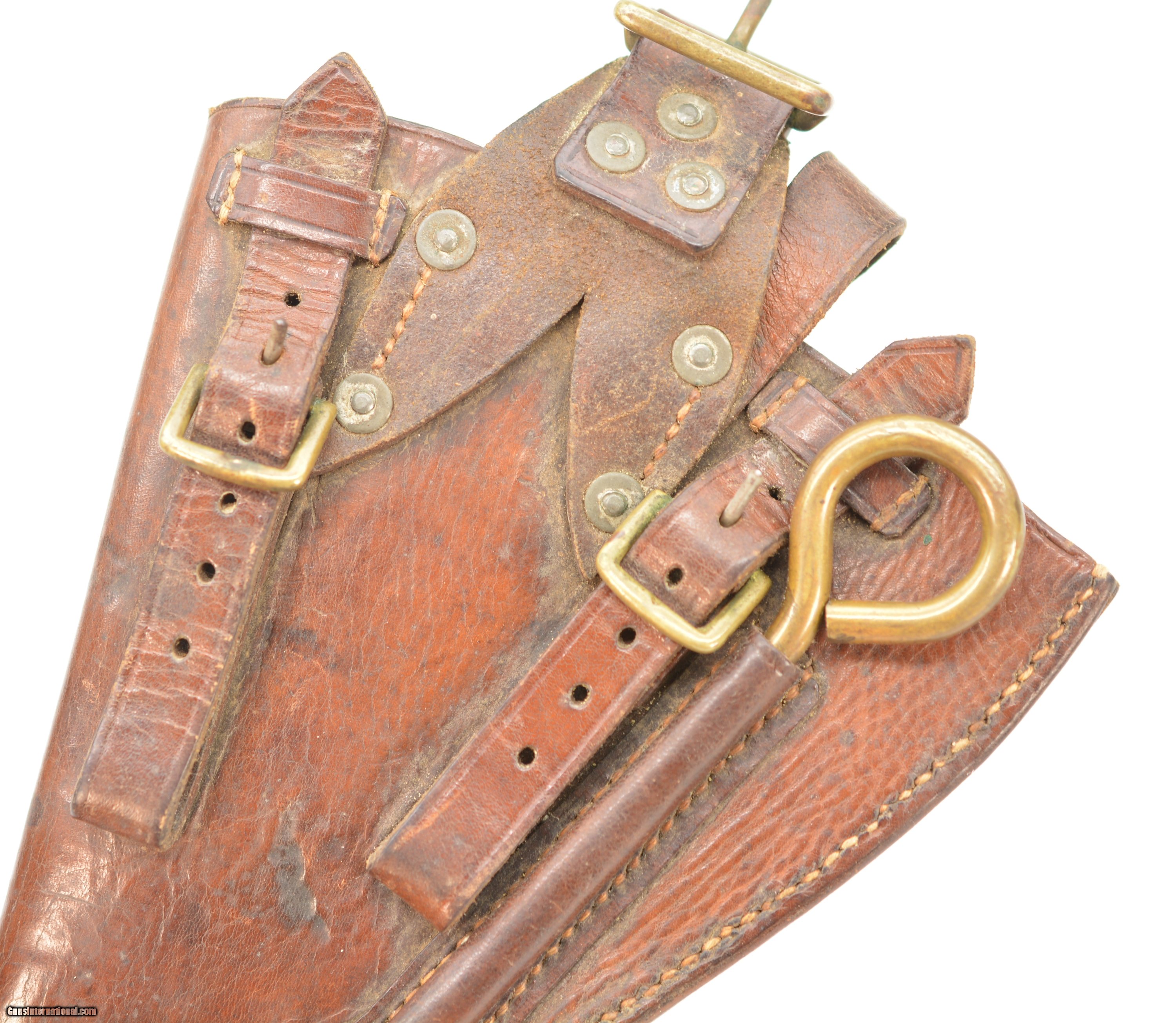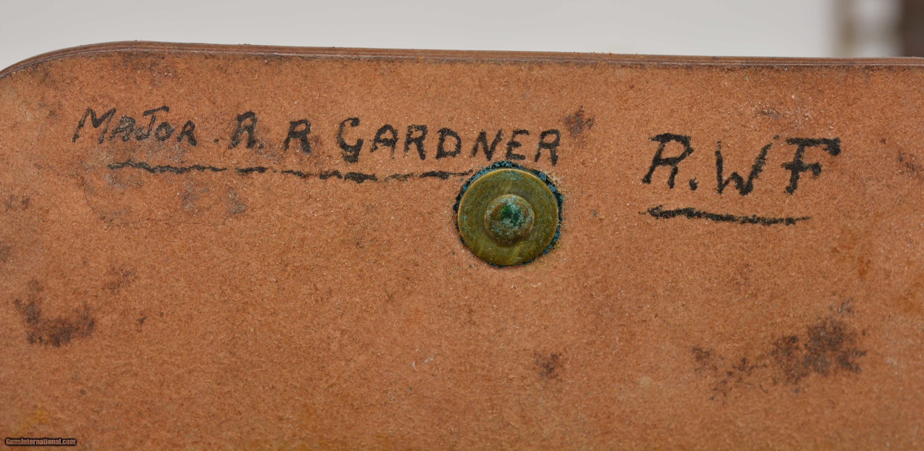 Description: This is an open-top holster and cartridge pouch set belonging to Major R.R. Gardner of the Royal Welch Fusiliers. The holster is designed to accommodate large frame revolvers such as the Webley Mark VI and is stamped “Underwood & Co. Ltd" 1915 with the original brass cleaning rod stamped “L&S" with sound stitching and supple leather. The ammunition pouch is marked on the inside flap with “Major R.R. Gardner R.W.F." and is in very good condition with some surface crazing and flaking of the finish. A very nice, identified, World War I holster set. SOLD Manufacturer: Webley Model: Holster |