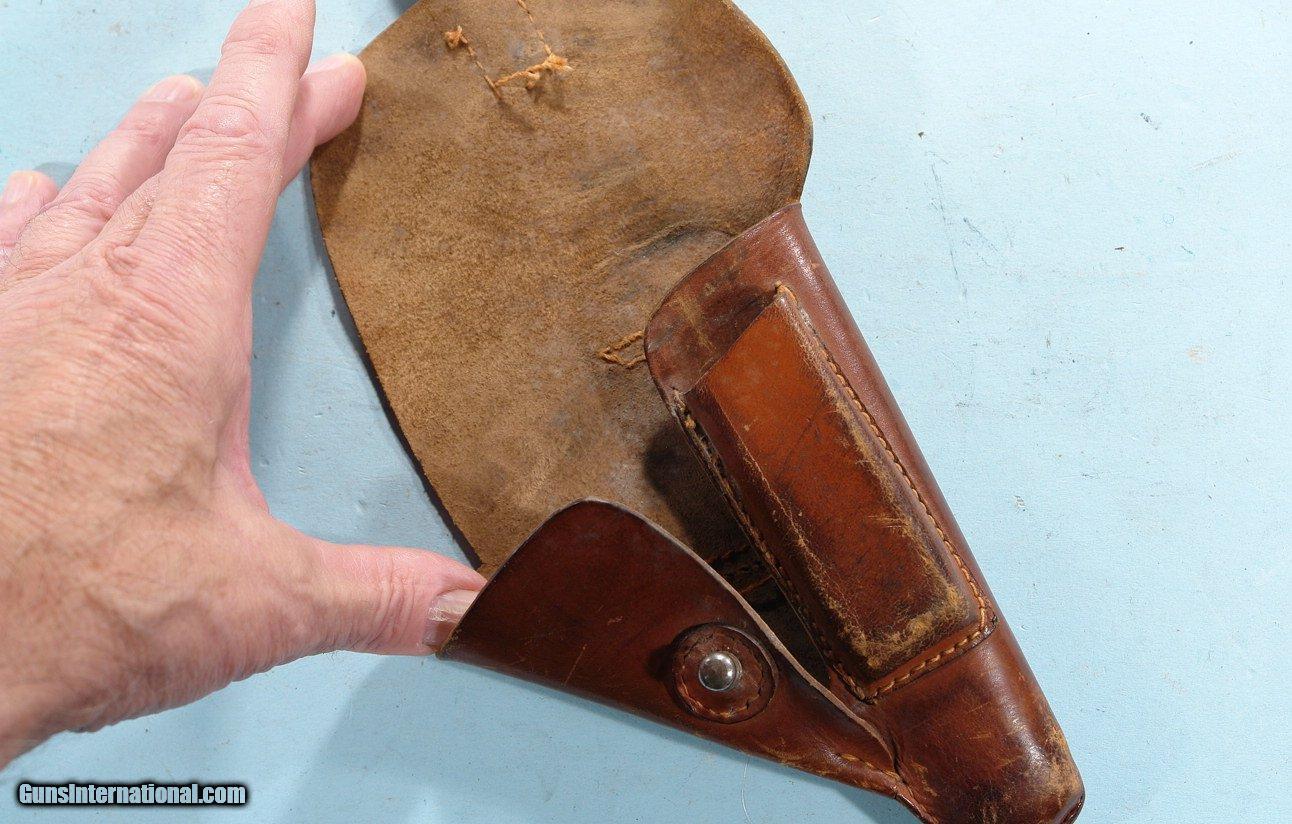 Description: WWII OR WW2 WALTHER PPK HOLSTER OR OTHER MEDIUM AUTOMATIC WITH MAG POUCH. Brown leather with intact tab and stub. Stitching on belt loop needs help (held on by two stitches) but easy fix. Walther PPK fits perfectly as does magazine but will fit any medium size auto. M34 or Ortgies, etc. Unmarked. SOLD |
