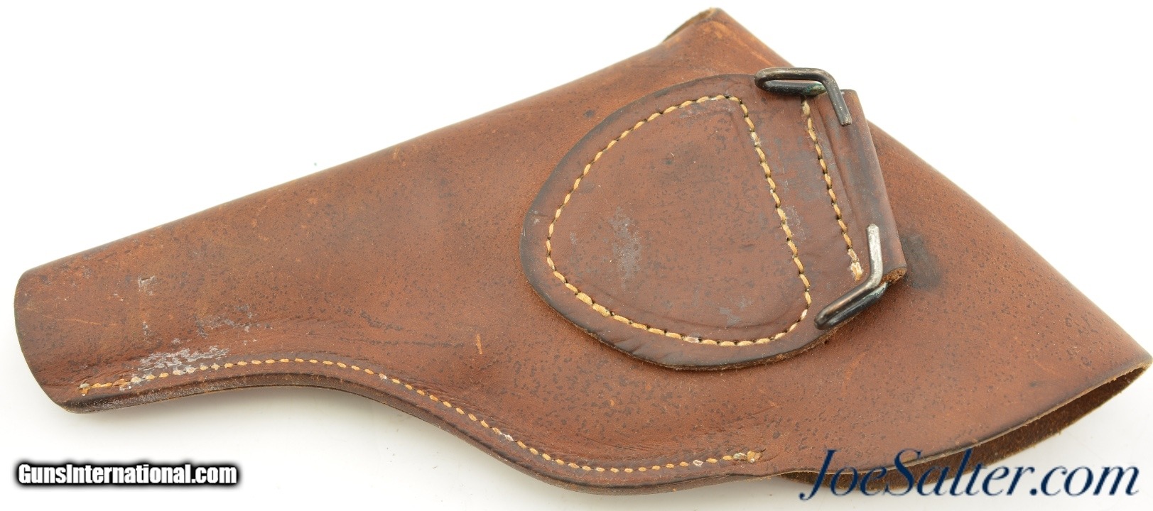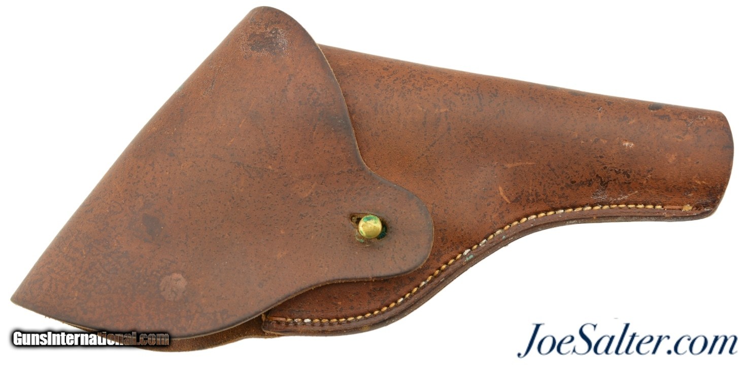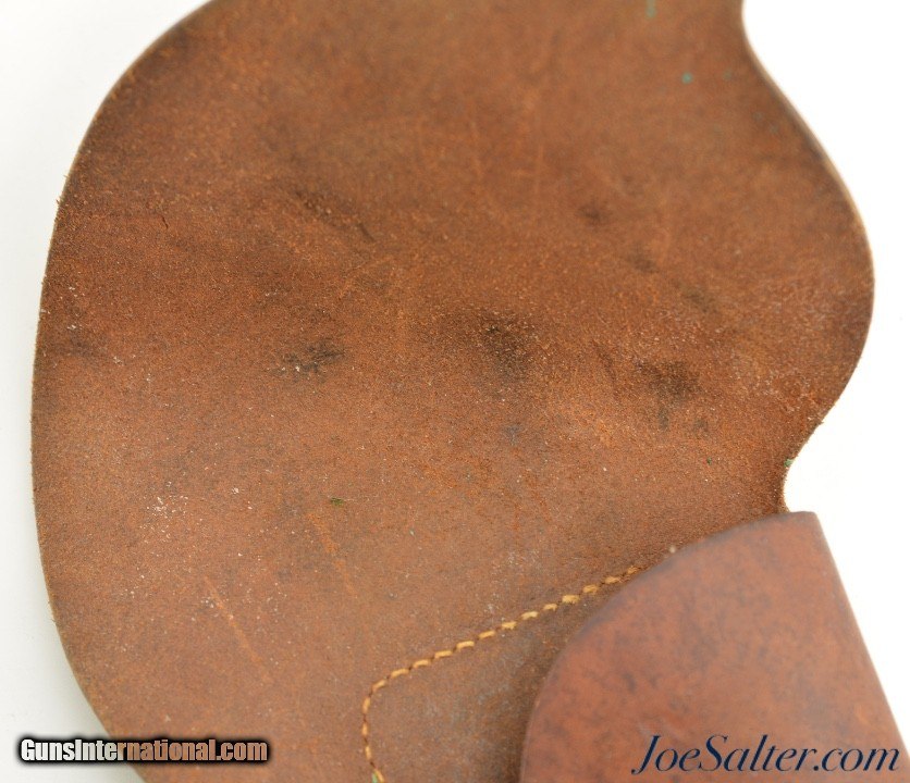 Description: This is an excellent condition original WWII U.S. Full Flap Holster for the .38 Cal. S&W Victory Model, 4" barrel. The heavy leather is supple with signs of wear, scuffs, small scratches from duty. All the stitching is tight, belt hook is unbent. Brass stud has light verdigris but solid. No makers mark.; Price: $155.00 Contact Seller |