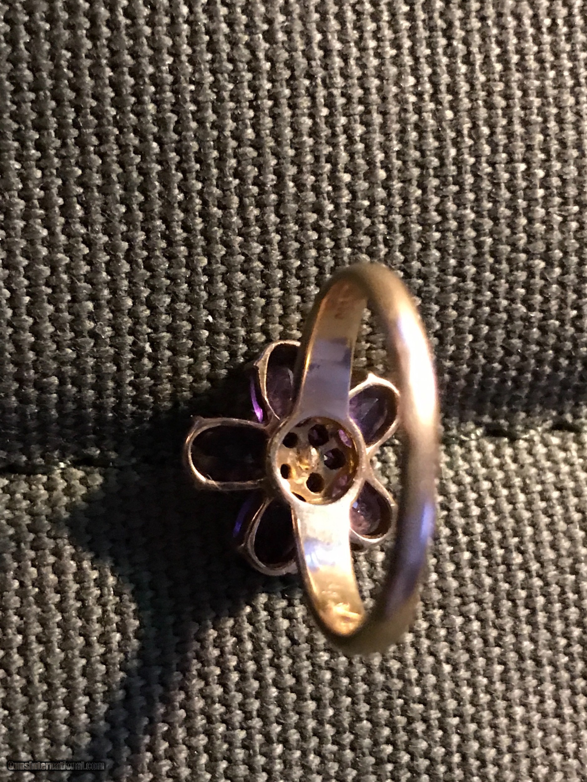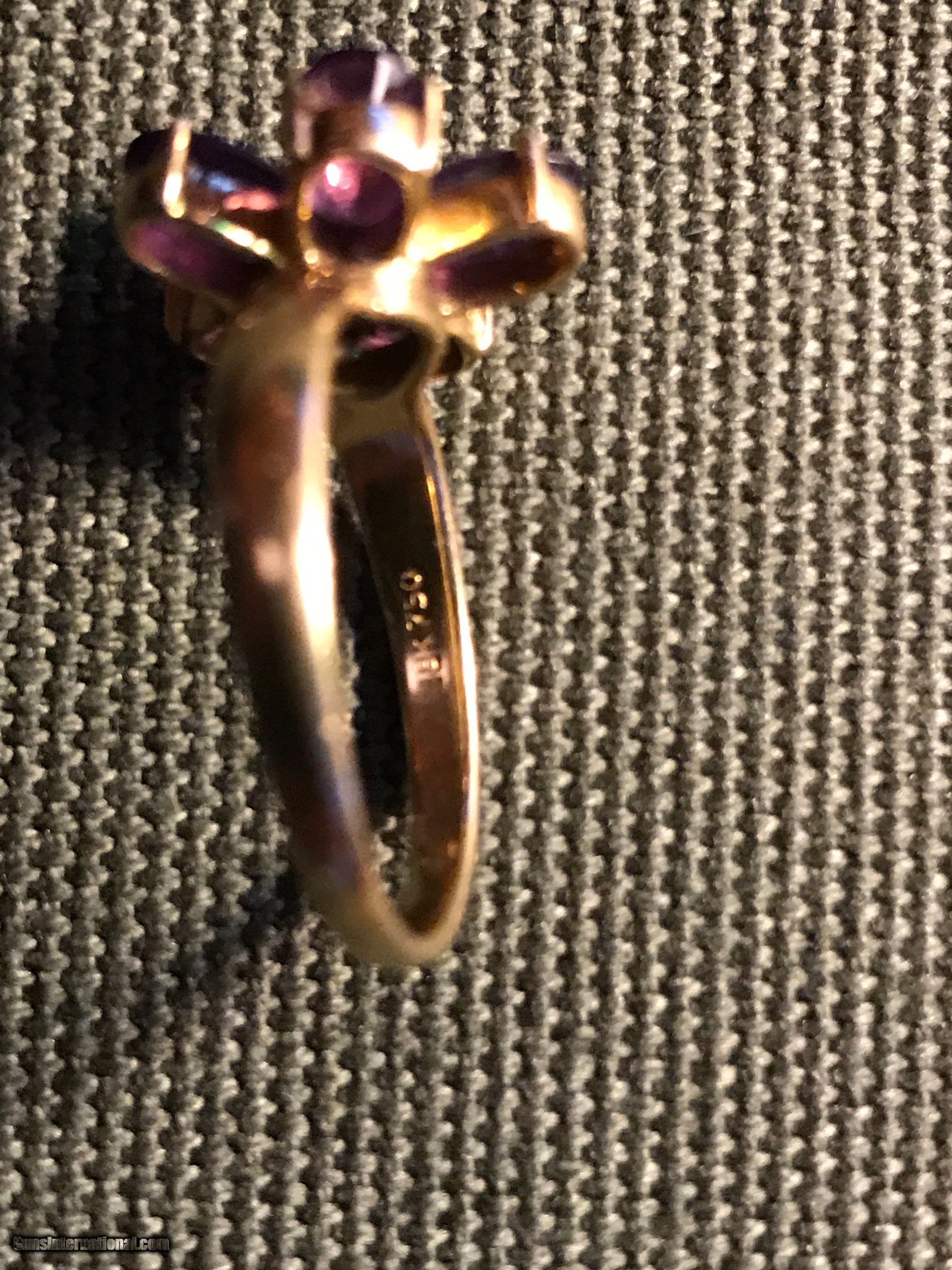 Description: 18K Gold Ladies ring with 5 Amethyst & 1 center Citrine Stone. Total weight is. 3.84 Grams , size ? Measures inside approx. 11/16 of a inch. Very nice ring. SOLD |
