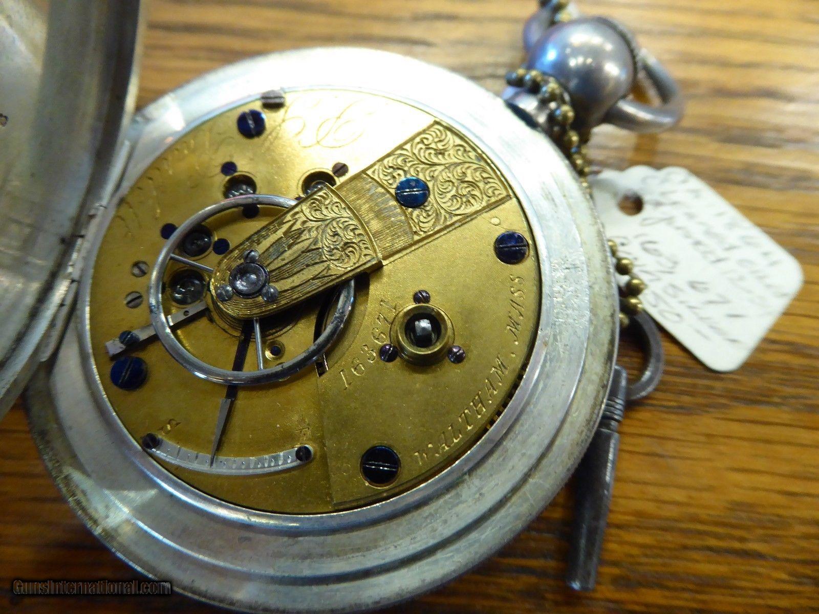 Description: Antique Waltham/American Watch Co. pocket watch. Coin silver case, 11 jewels, Model 1857. Measures 2 1/4"" diameter. Cleaned and in working condition. SOLD |