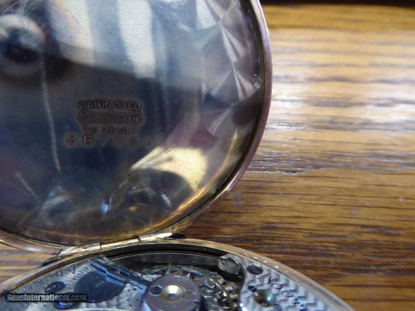 Description: Antique South Bend Watch Co. pocket watch. Serial #420,588, circa 1905. RR grade, gold filled, bankers fob. Cleaned and in working condition. 2" diameter. SOLD |
