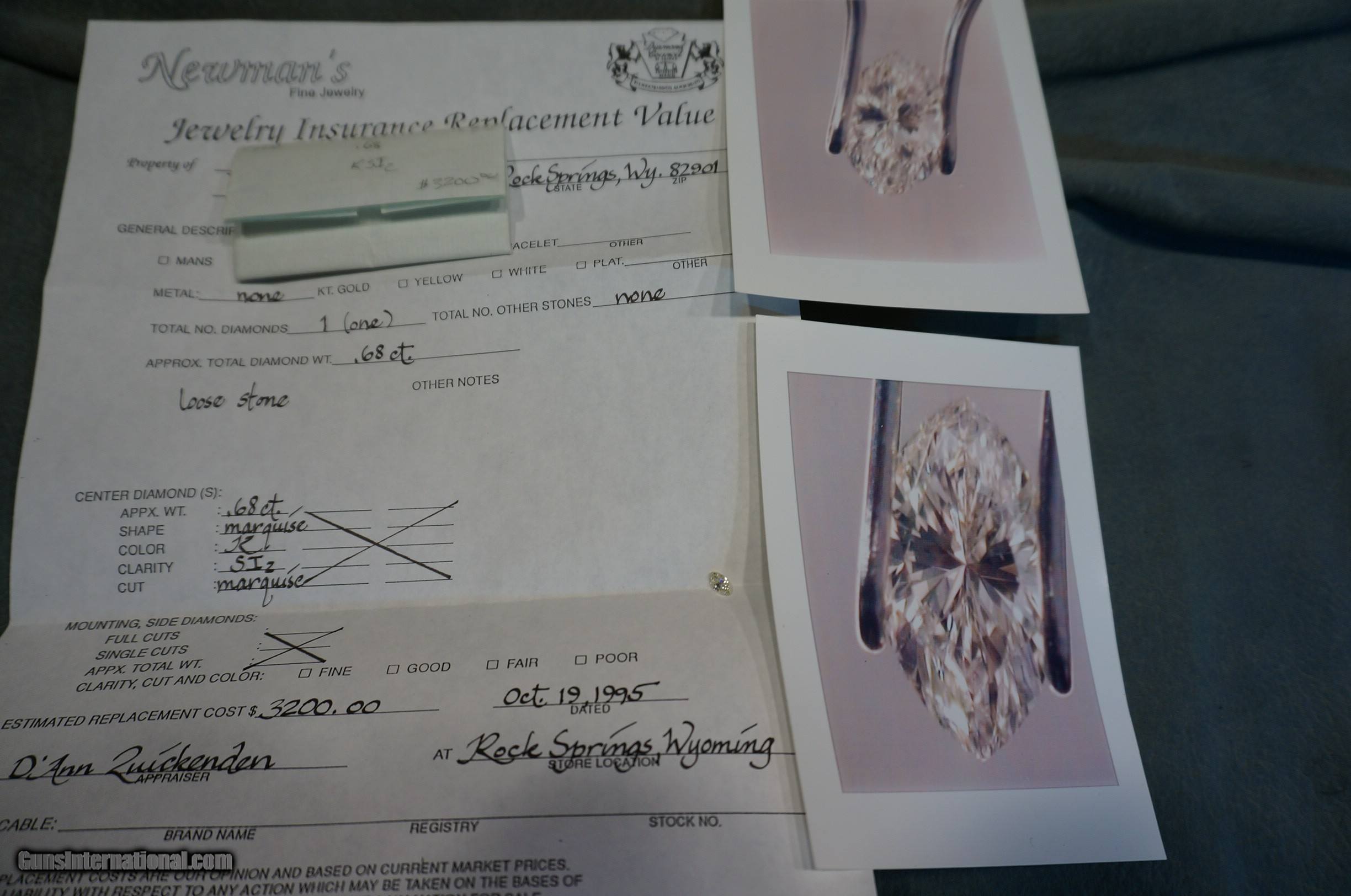 Description: Diamond .68 Marquise Cut SI2 clarity,K color,$3200 appraisal from 1995,unset stone. GUN COLLECTIONS WANTED FOR CASH! We buy, sell, consign and trade new and used firearms. This is our 44th year in business. We offer 90 day layaways with 20% down. No return on layaways. Firearms will need to be transferred through a FFL dealer. Prices reflect a cash discount. There will be 3% added to credit card sales. We trade for gold and silver. THANK YOU! SOLD |
