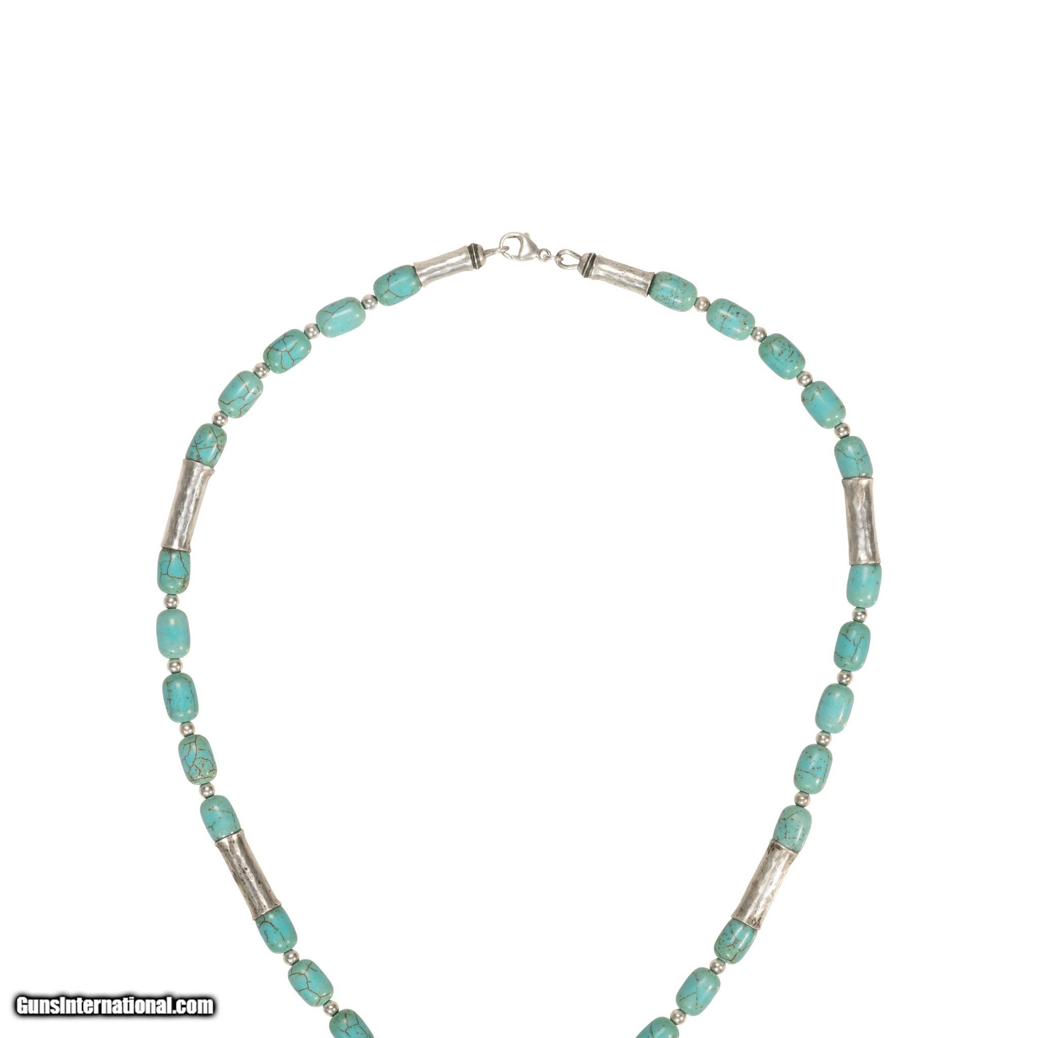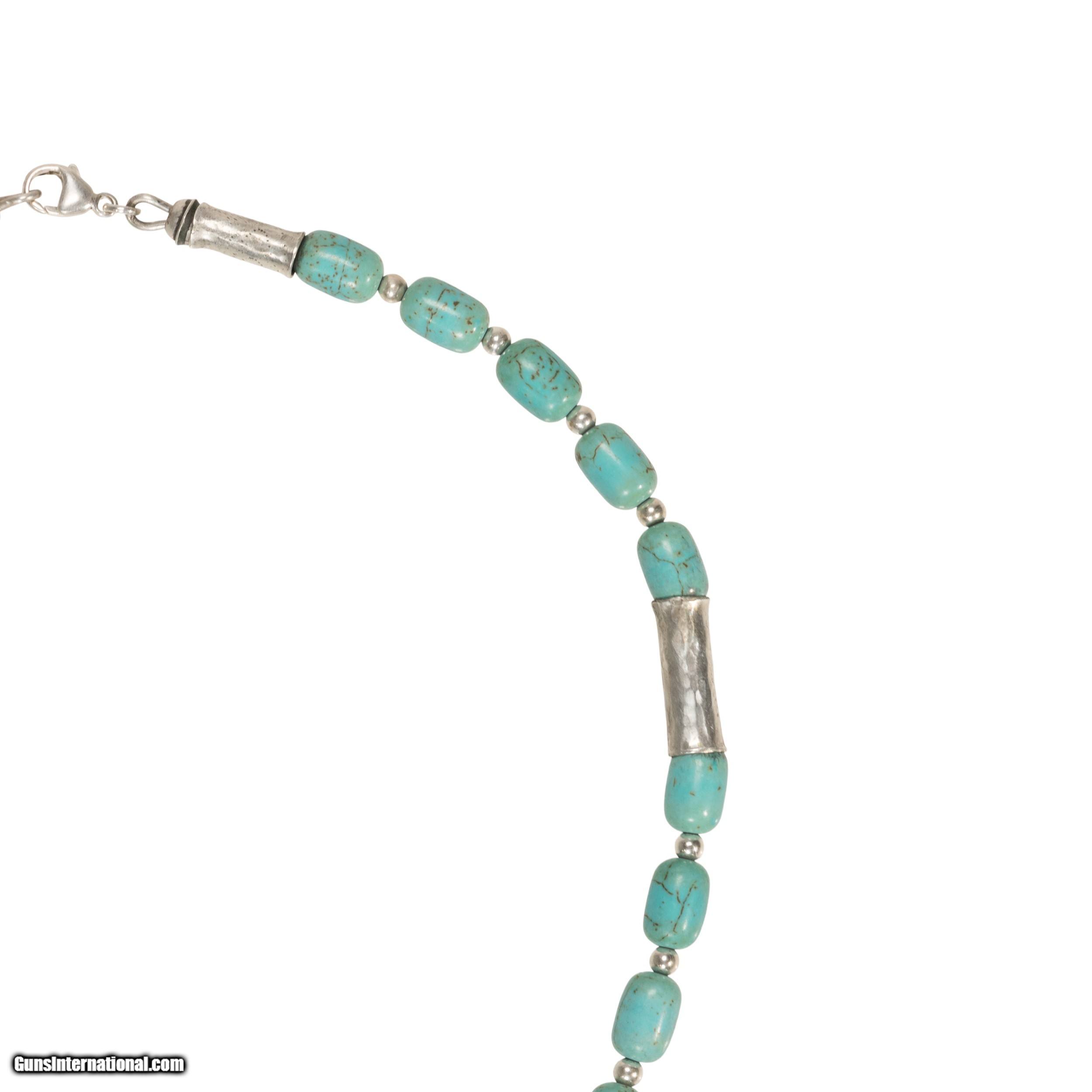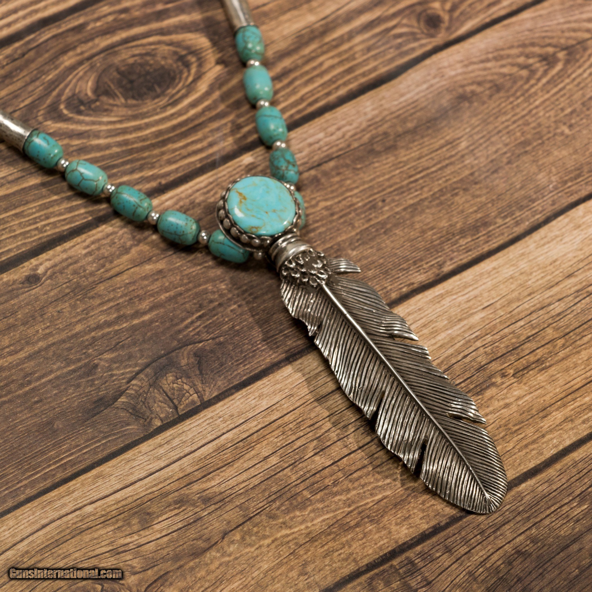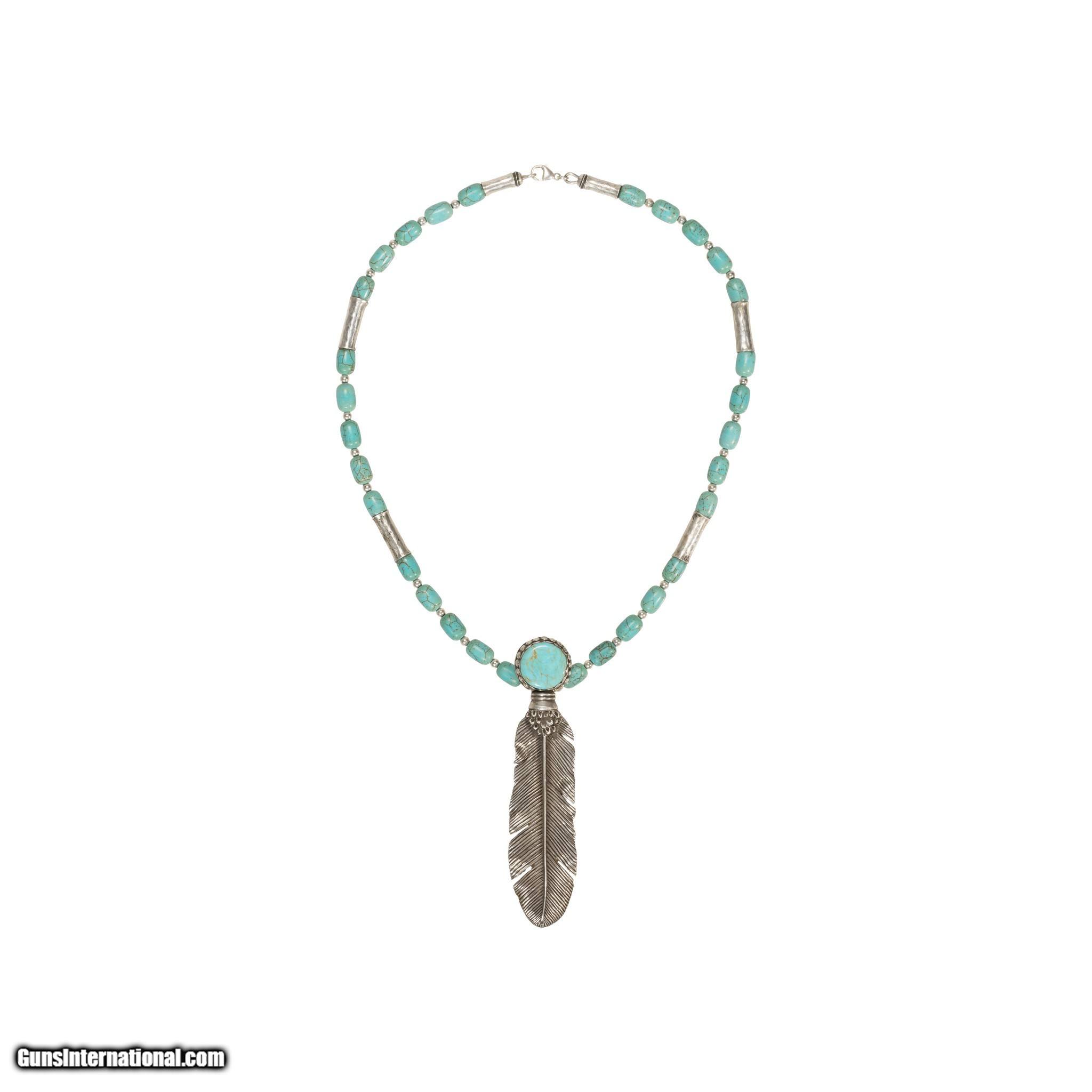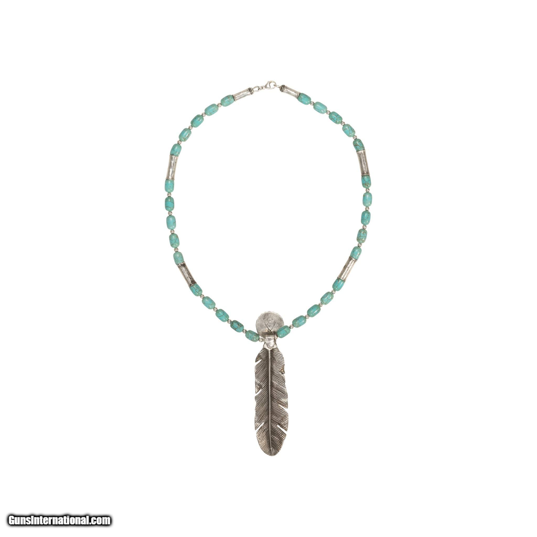 Description: Sterling silver feather necklace with Kingman turquoise interspersed with sterling silver having sterling detailed feather drop. Made by artist Jamie Hansen and maker's mark "Sterling 925" and "Spirit" on back. This bold and remarkable necklace is the perfect Western accent that would compliment a variety of different outfits and styles. Perfect for the cowboy, cattleman, musician, or anyone in between. Size: 23" plus 5" Drop; 107 grams SOLD |