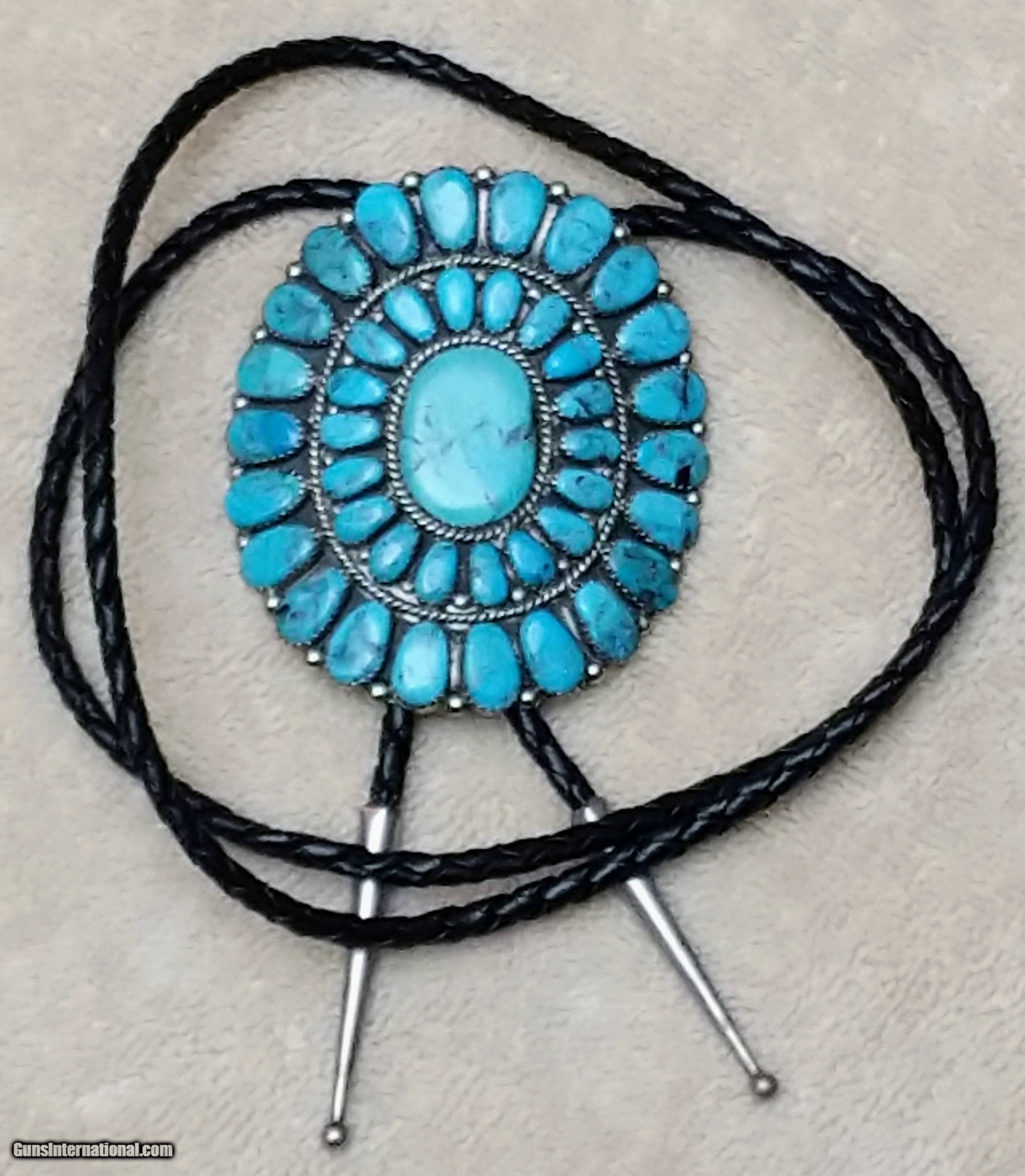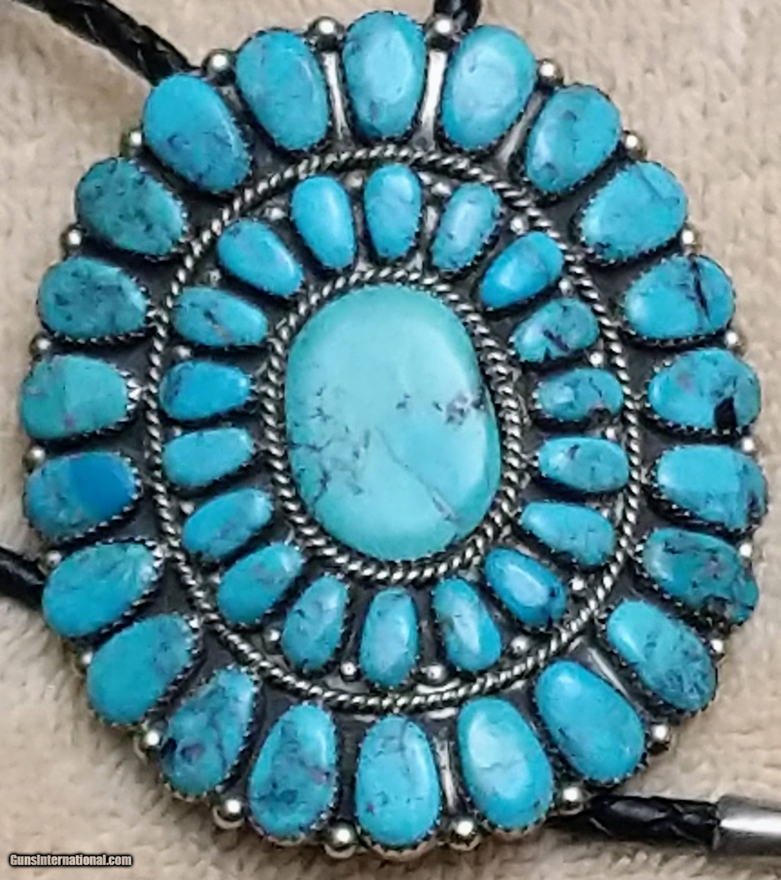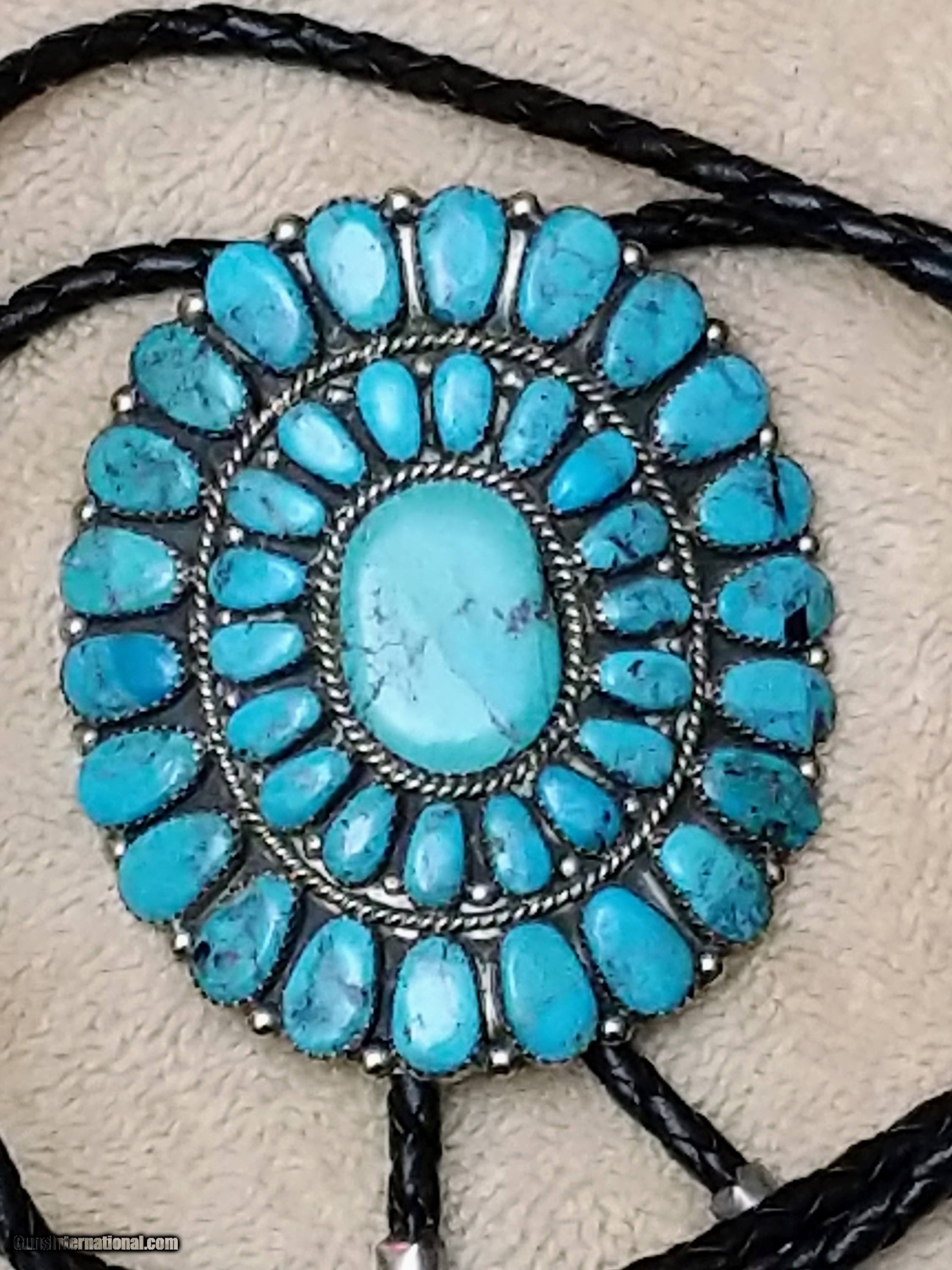 Description: Very nice Native American (Navajo) silver (unmarked but either sterling or coin) and turquoise bolo tie. Signed RW and is attributed to Rosana Williams. 41 stones. Price includes shipping and CC fees. SOLD |