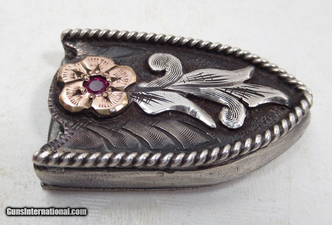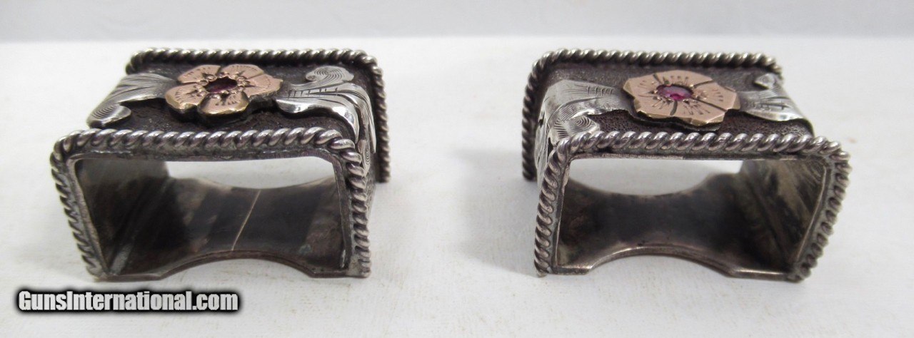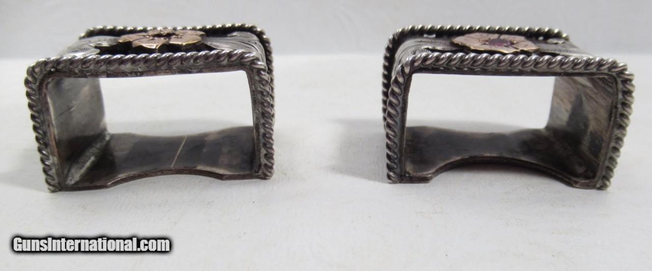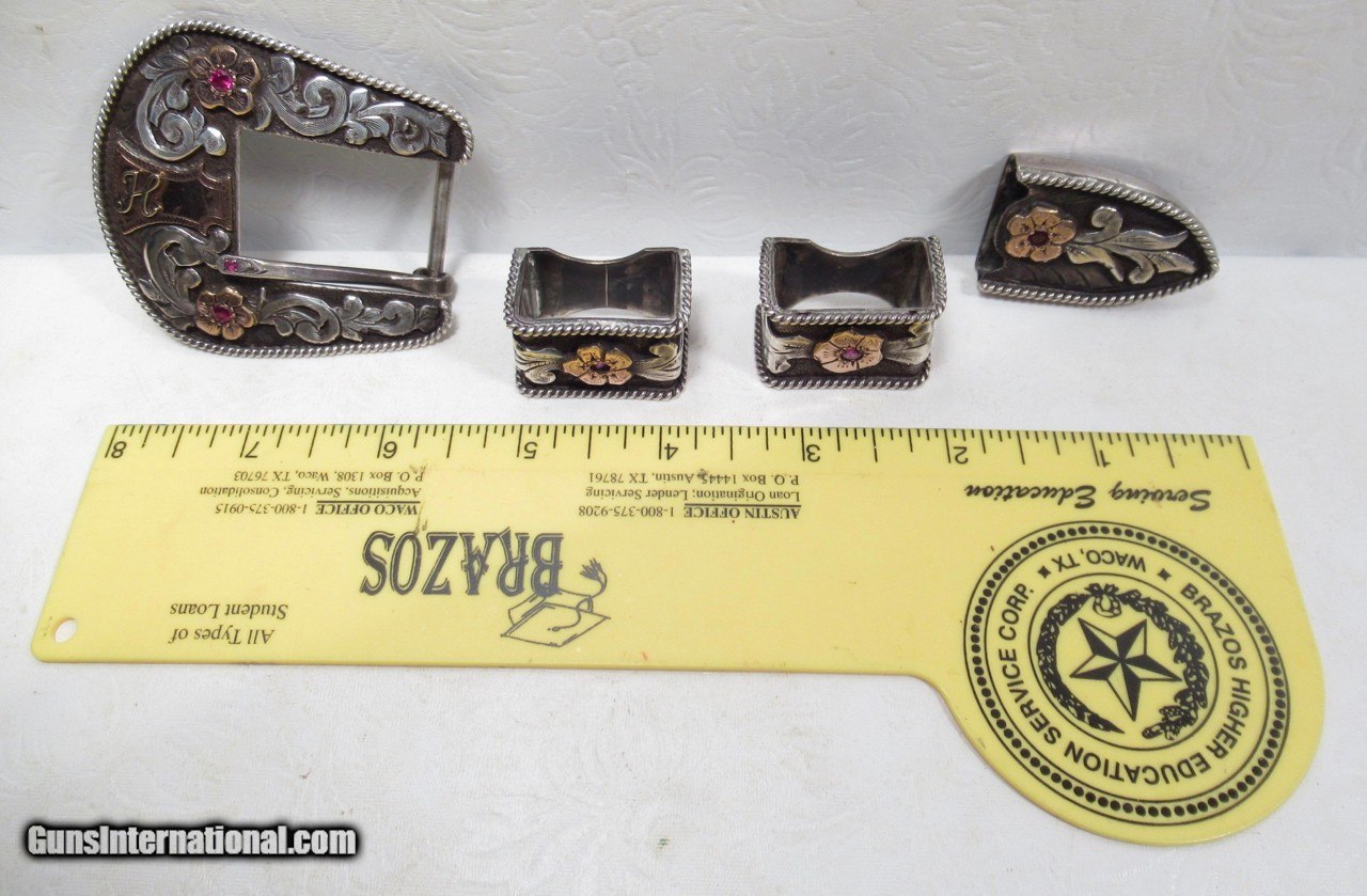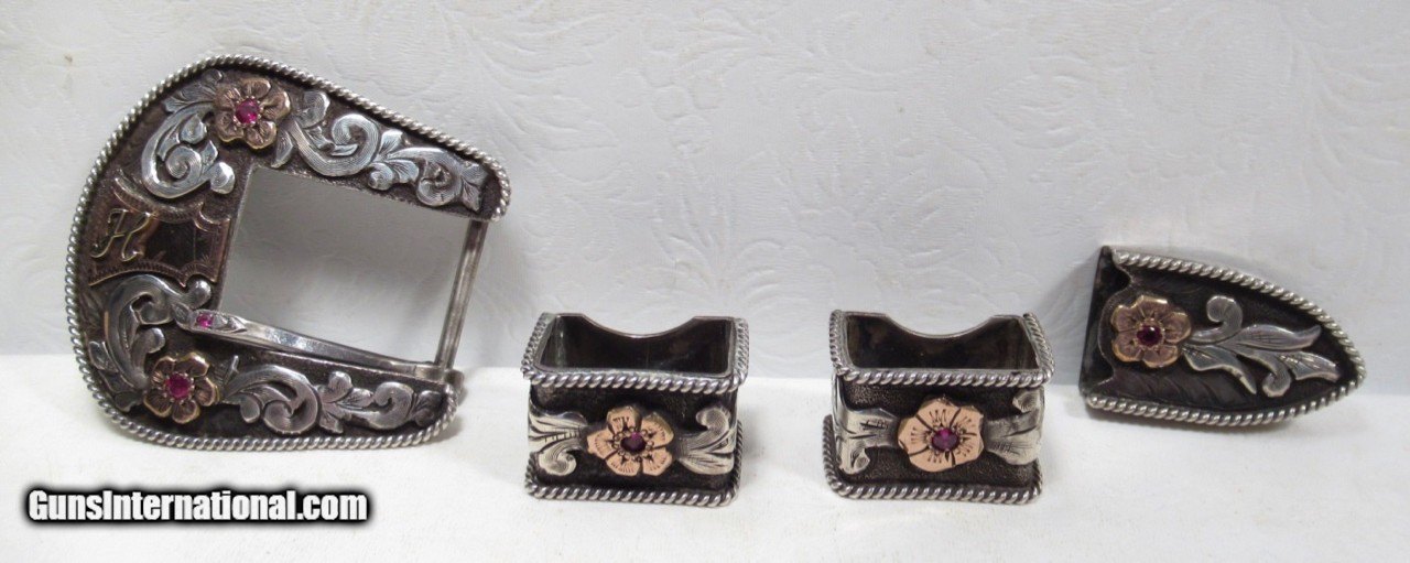 Description: Super Fine Hand Engraved Sterling Silver and 10K Gold Ranger Style 4-Piece Buckle Set with 6 Rubies; Made by Ben Throwbridge of San Angelo, Texas; Marked on Back of Buckle B. Throwbridge; Top Quality Work; See All Photos for Condition; No Texts; Call (254)541-5765 or Email Only; PERSONAL PROPERTY of Harold Wieser; Price: $2,975 + $45 S&H Via USPS PRIORITY MAIL; Payment Address: Harold Wieser - 1466 U.S. Hwy 77 - Rosebud, TX 76570; SEND PAYMENTS VIA USPS PRIORITY MAIL; BEWARE of SCAMS!!! – DO NOT SEND MONEY or CORRESPONDENTS ELECTRONICALLY UNLESS YOU HAVE SPOKEN to HAROLD WIESER FIRST! 254-541-5765 SOLD |