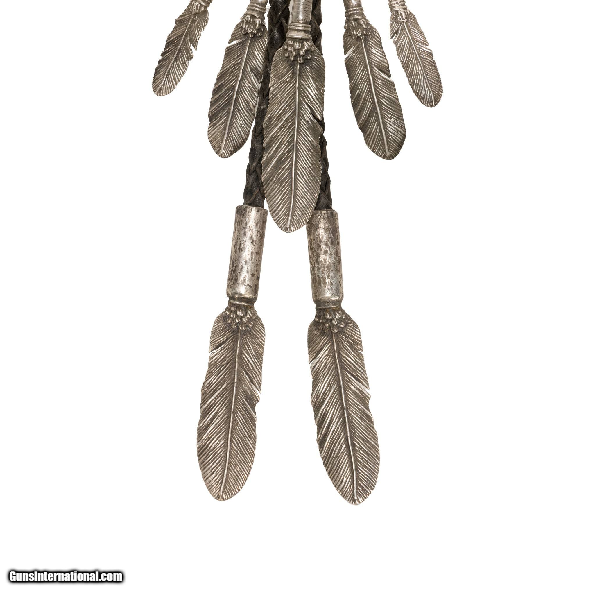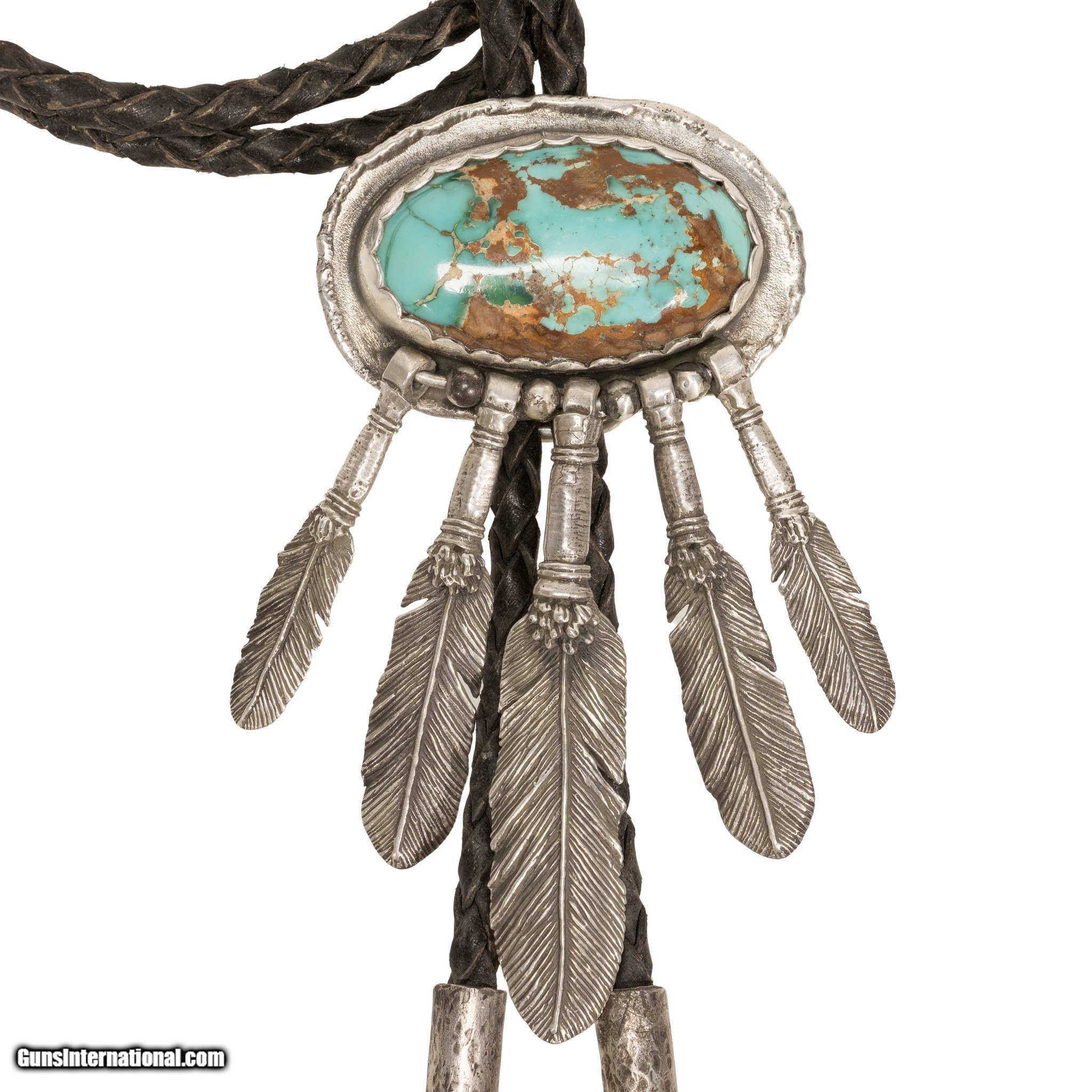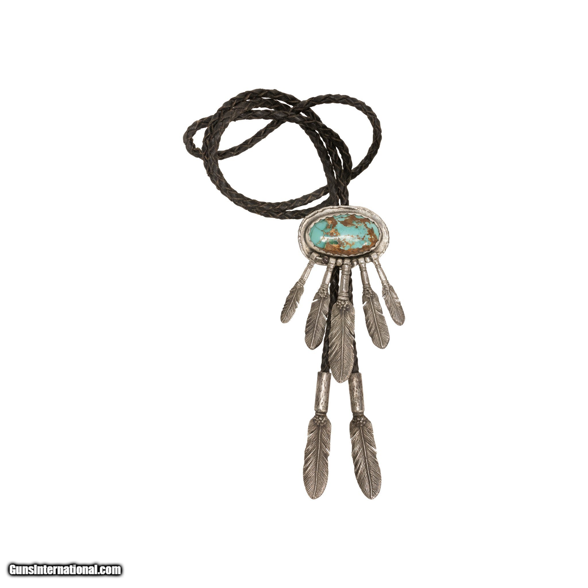 Description: Royston turquoise bolo tie with detail hanging feather drops. Made by artist Jamie Hansen and maker's mark "Sterling 925" and "Spirit" on back. This stunningly made bolo tie is the perfect Western accent that would compliment a variety of different outfits and styles. Perfect for the cowboy, cattleman, musician, or anyone in between. Size: 4 1/2", tie 31", 88 grams SOLD |