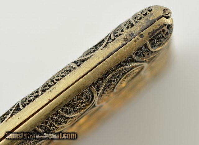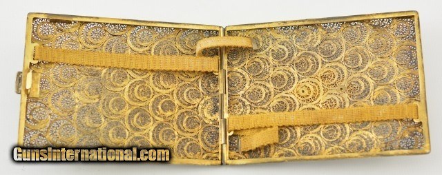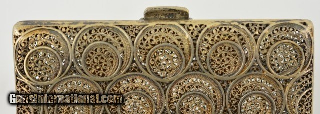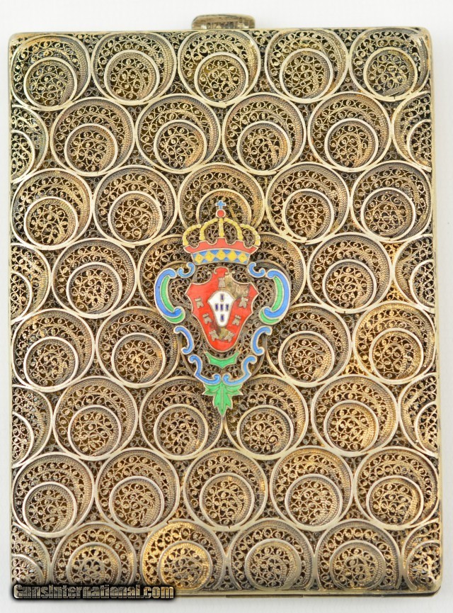 This is an exquisitely wrought hinged case that does not have a solid surface; instead the walls are artfully composed entirely of intricately coiled silver wire filigree with a cloisonn' badge on the cover depicting a stylized Portuguese crest.