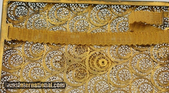 The silver wire retains some of the original gilt finish with the balance tarnished to a mottled gray/black patina, especially around the edges.