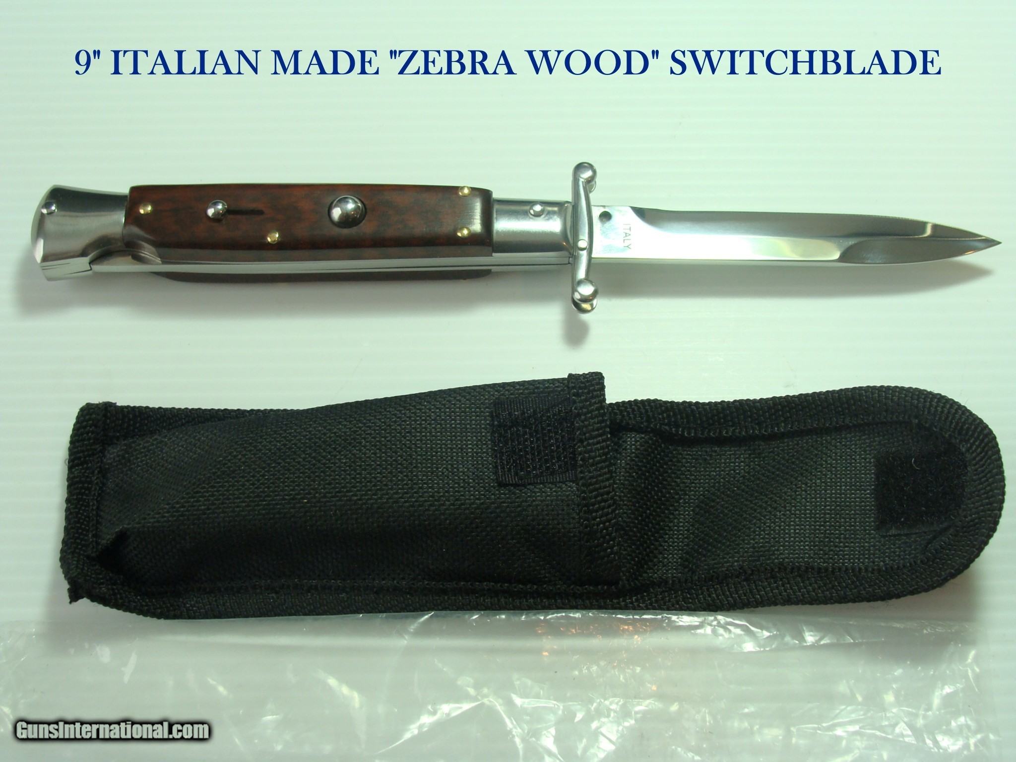 SUPERB 9" ITALIAN MADE SWITCHBLADE AUTOMATIC KNIFE WITH THICK, REAL ZEBRA WOODEN HANDLES, MINT IN THE POUCH WITH 4" BAYONET STYLE RAZOR SHAR