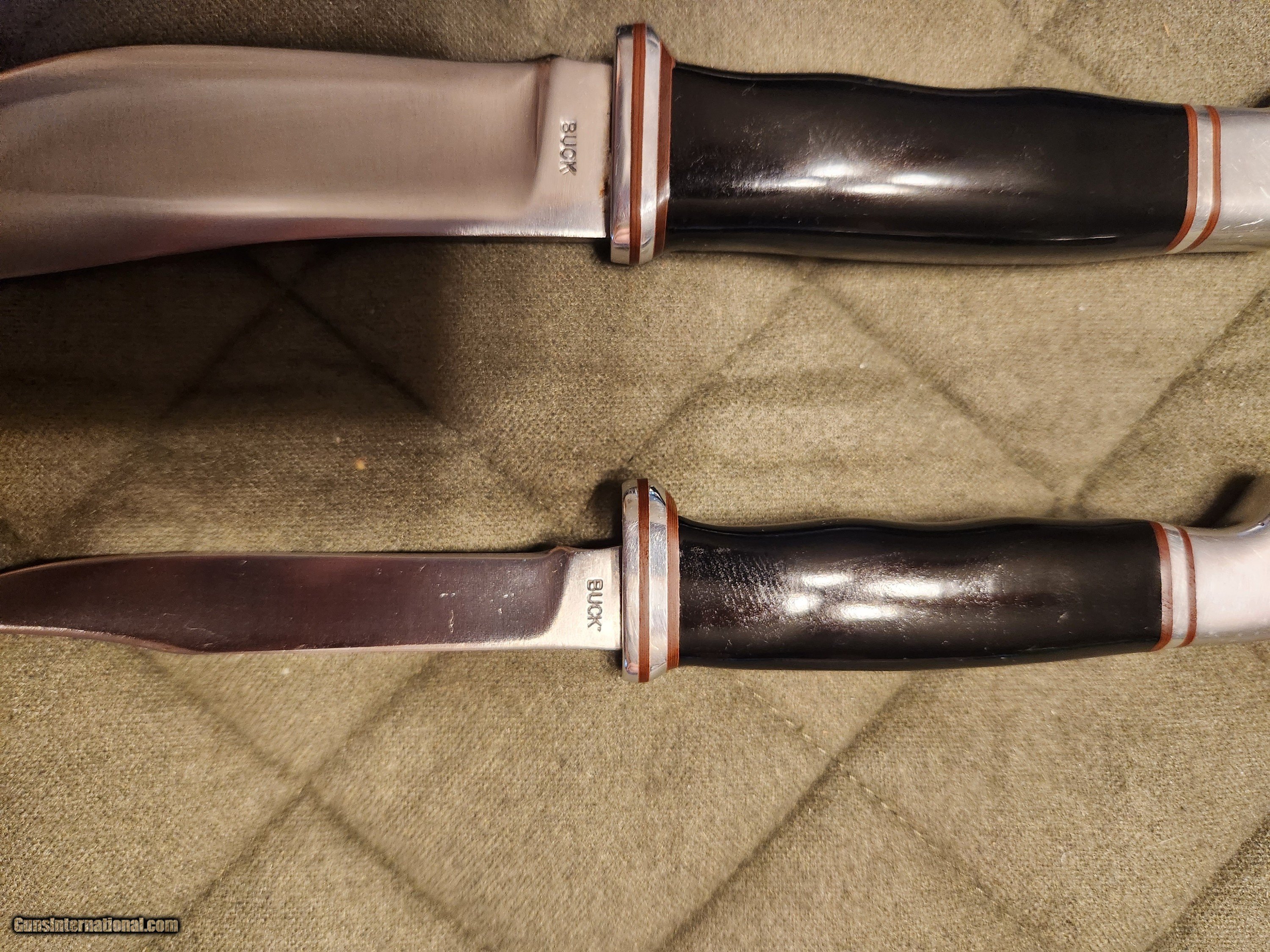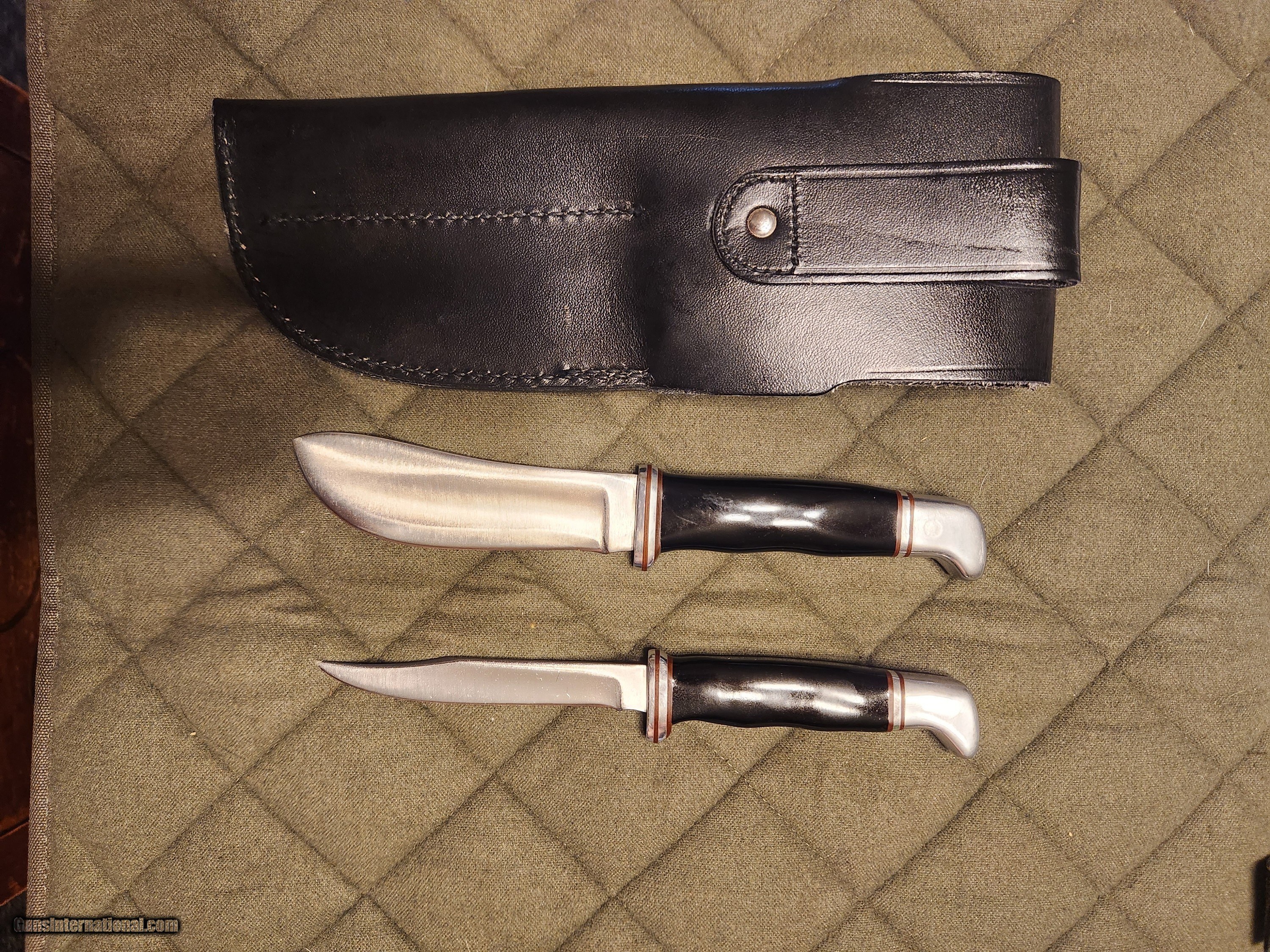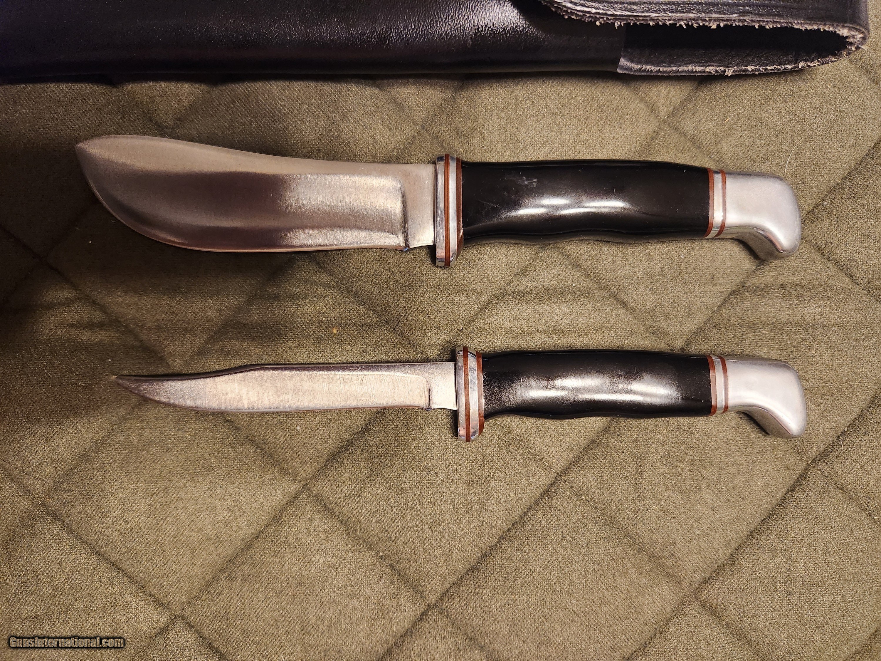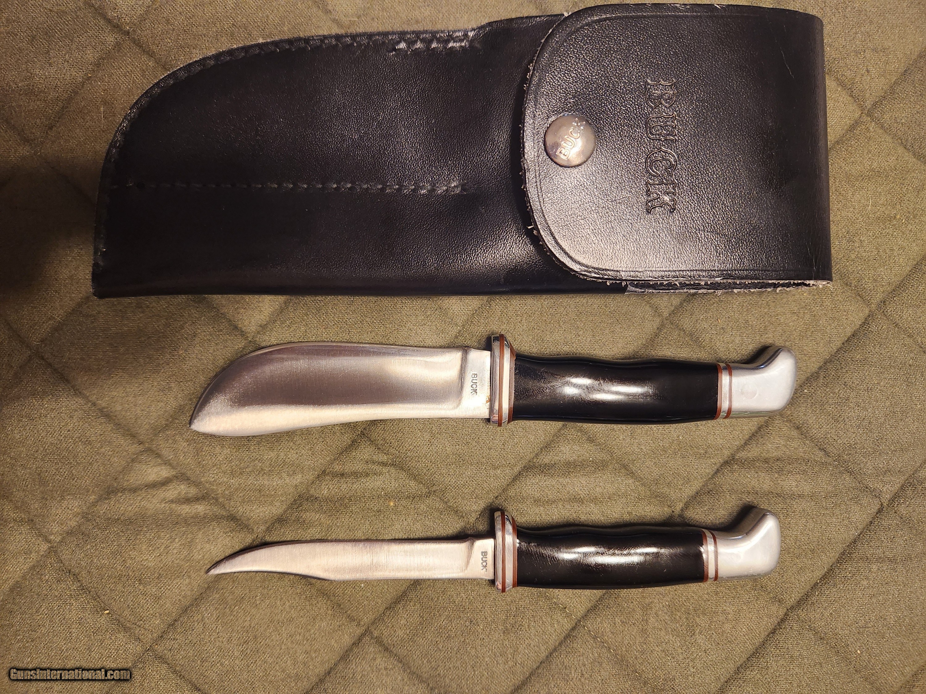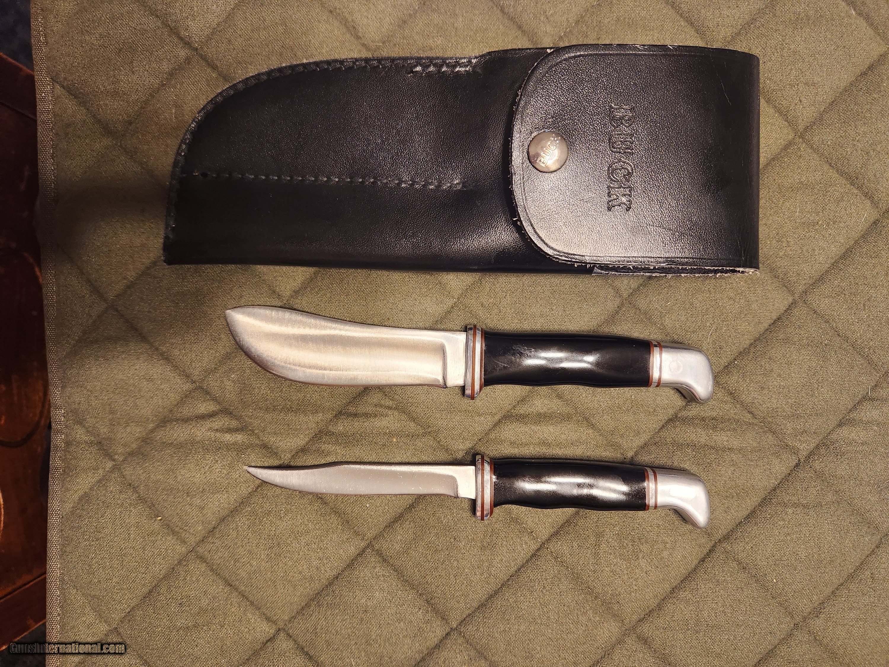 Description: Buck Twin 104 knife set. Set comes with a 102 and 103 knife and double sheath. Knife set is like new condition and razor sharp. Set is from 1967. This is a rare find! Must pay by credit card over the phone with no fees. Shipping is $15. Call or text with any questions 641-430-3042 SOLD |
